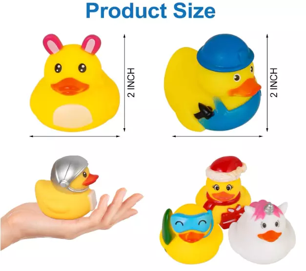 Free eBay listing template designed by dewiso.com Rubber Ducks Bath Toy for Kids, Assortment Duckies for Jeep Ducking Pool Floater Ducky Bathtub Beach Toys, Party Favors Birthday (10 Pcs) Product Description Delightful Assortment of Rubber Ducks – 10 Unique Characters for Endless Fun! Unbox a world of joy with our Assortment of Rubber Ducks ! Each set includes 10 different colorful and character-themed rubber duck toys, making bath time, Jeep ducking, or party decor more exciting. Whether it's a surprise for kids or a fun collectible for adults, these adorable duckies will bring smiles and unexpected surprises to any occasion! Safe, Fun, and Soft to Touch – Perfect for Kids of All Ages! Crafted from premium quality rubber and CPSIA safety-certified, these Fun Safe Rubber Ducks are designed with your little ones in mind. Their soft, comfortable texture makes them easy to hold and gentle for toddler baths or any playtime activity. A great choice for baby bath toys or gifts for duck lovers of all ages! Perfect-Sized Rubber Duckies for Jeep Ducking, Bath Time, and Collectors! Each duck in this 2 Inch Rubber Duckies set measures between 2-2.5 inches—just the right size for Jeepers' ducking, cruise hiding, or even as fun bath companions. Whether you're adding to a growing collection or introducing your child to their first squeaky friend, these ducks are perfect for every occasion. Squeaky, Colorful, and Full of Personality! Get ready for some squeaky fun! These Cute Squeaky Ducky toys come in a variety of bright colors and each has its own unique squeak. The amusing "BEBE" sound they make will not only entertain but also help relieve stress, bringing a touch of whimsy to your day. NEEDMART