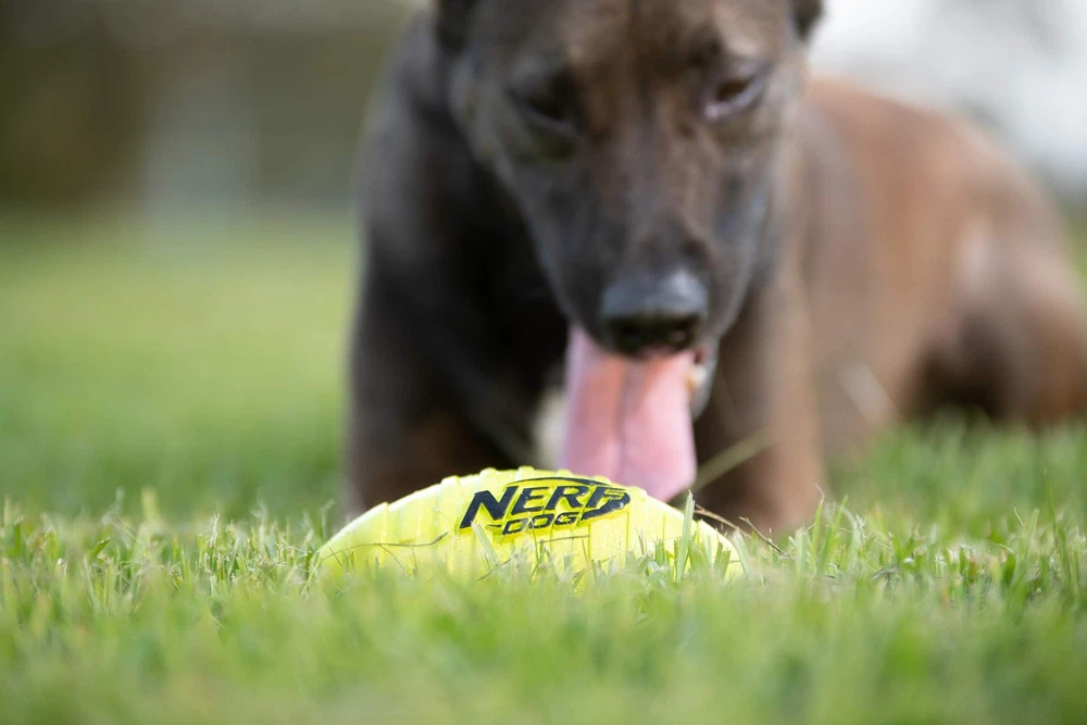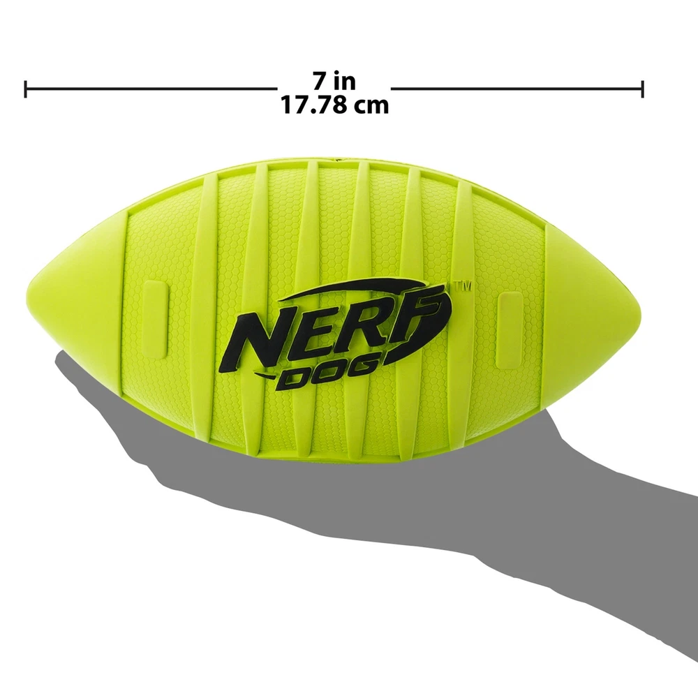 Product Description Down. Set. Hut!!! It’s game day every day with the Squeak Football. Perfect for a pick-up game in the backyard with your favorite mutt, this football is constructed from extra strength interactive rubber and features a gripped design to make it easy for humans to toss and dogs to catch. One squeeze is all you need to hear that squeaker sound that dogs love! The Nerf-quality materials make this dog toy lightweight and durable so it’s great for indoors and outdoors. It’s made of water-resistant, 100% non-toxic rubber so it's safe for pets and it’s the perfect toy you can take to the park, beach or lake, too. When it gets dirty from outdoor play, simply rinse or wipe off and it's good to go! From the Manufacturer Dogs will love to squeak and shake their brand new Squeaker football! This high performance dog toy is designed for demanding use by both you and your pet. It features a high bounce, high buoyancy, high visibility and high durability. The Squeaker Football features a durable rubber exterior. This interactive toy is 6 inches long and great for most dogs and puppies. Available in 2 colors. NERF-TOUGH: Nerf-quality materials make our squeaker football perfect for fetch and for teaching your dog new tricks HIGH VISIBILITY: The bright green football is easily trackable for both you and your pet, no matter where or how far you toss it MADE TO LAST: Lightweight, durable, and weather & water resistant FOR MEDIUM AND LARGE BREEDS: With a 7 inch diameter, this football is ideal for medium and large breeds SAFETY FIRST: Designed with you dog's safety in mind, each of our dog toys are tested to ensure endless hours of family fun
