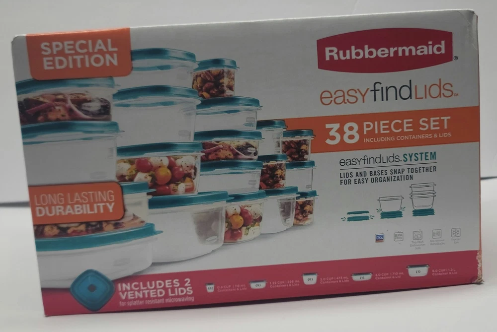 Keep your leftovers fresh and organized with this 38-piece set of Rubbermaid Easy Find Vented Lids Food Storage Containers. The set includes containers of different sizes with vented lids . The containers are made by Rubbermaid, a trusted brand known for its durability and quality.These containers are perfect for storing food in your kitchen, whether in your fridge or pantry. The vented lids help prevent moisture build-up and keep your food fresh for longer. The set includes containers of different heights, lengths, and widths to accommodate various types of food. Get your hands on this set today and experience the convenience of having your food neatly organized and easily accessible.