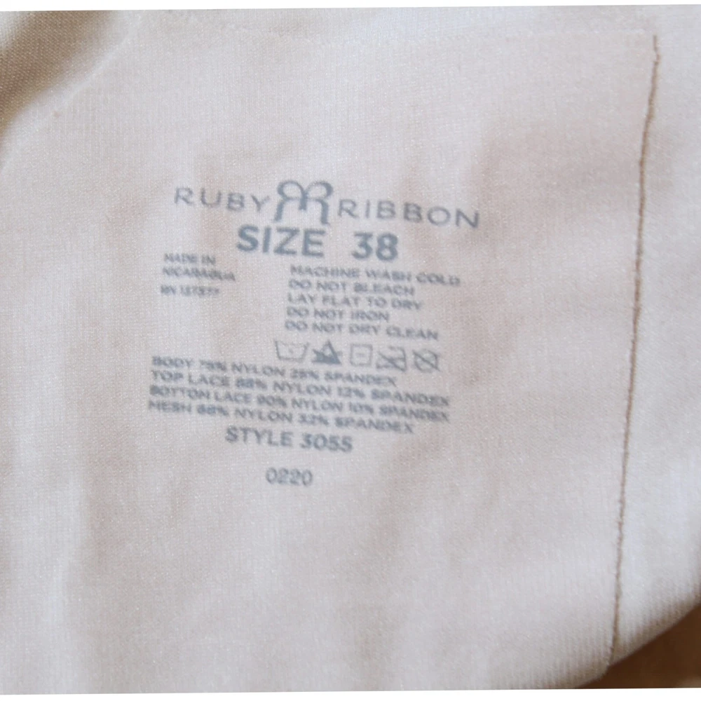 Material: Nylon, Spandex Band Size: 38 Type: Shapewear Country/Region of Manufacture: Nicaragua Compression Area: Abdomen Size Type: Regular Pattern: Solid Theme: Rose Features: Adjustable Strap Color: Beige Department: Women Personalize: No Fabric Type: Lace Size: 38 Vintage: No Brand: Ruby ribbon Accents: Logo, Strap Style: Shaping Top Number in Pack: 1 Pack Seller Notes: “Excellent pre owned condition” Garment Care: Machine Washable