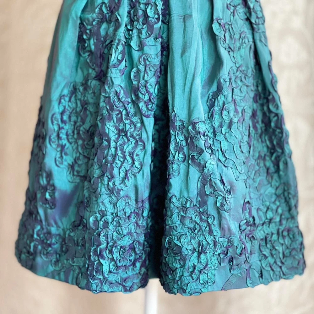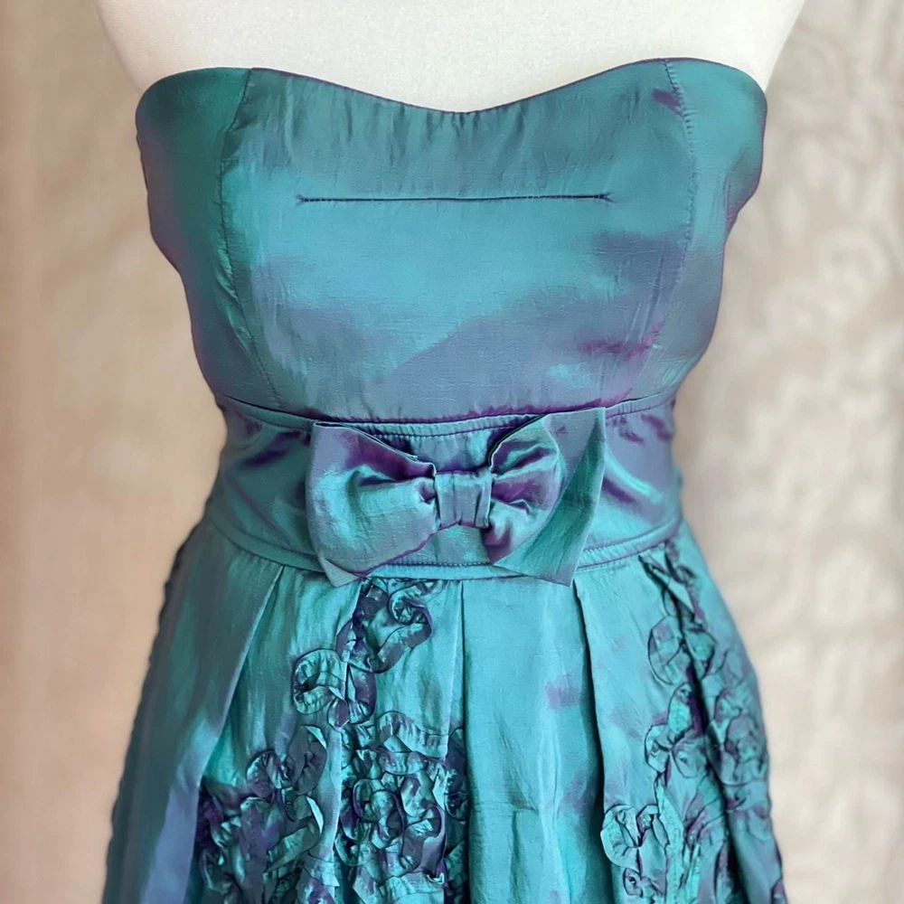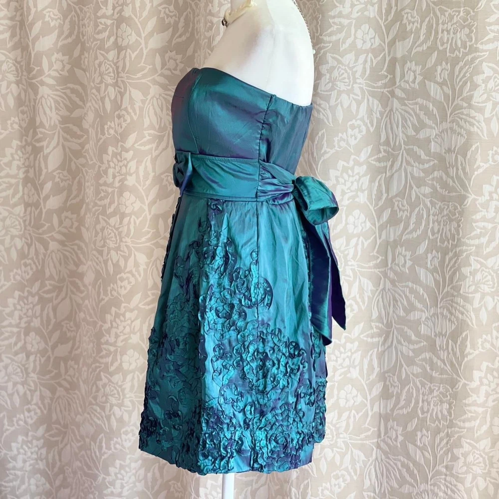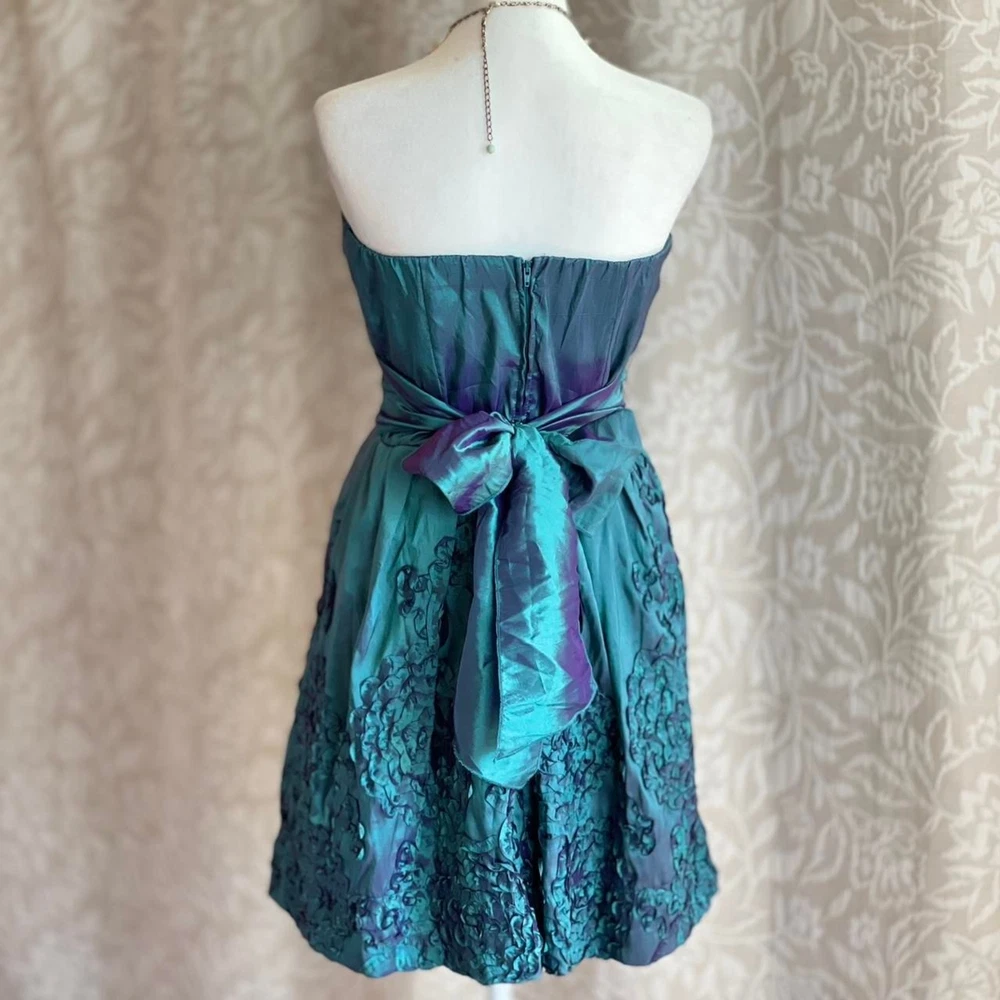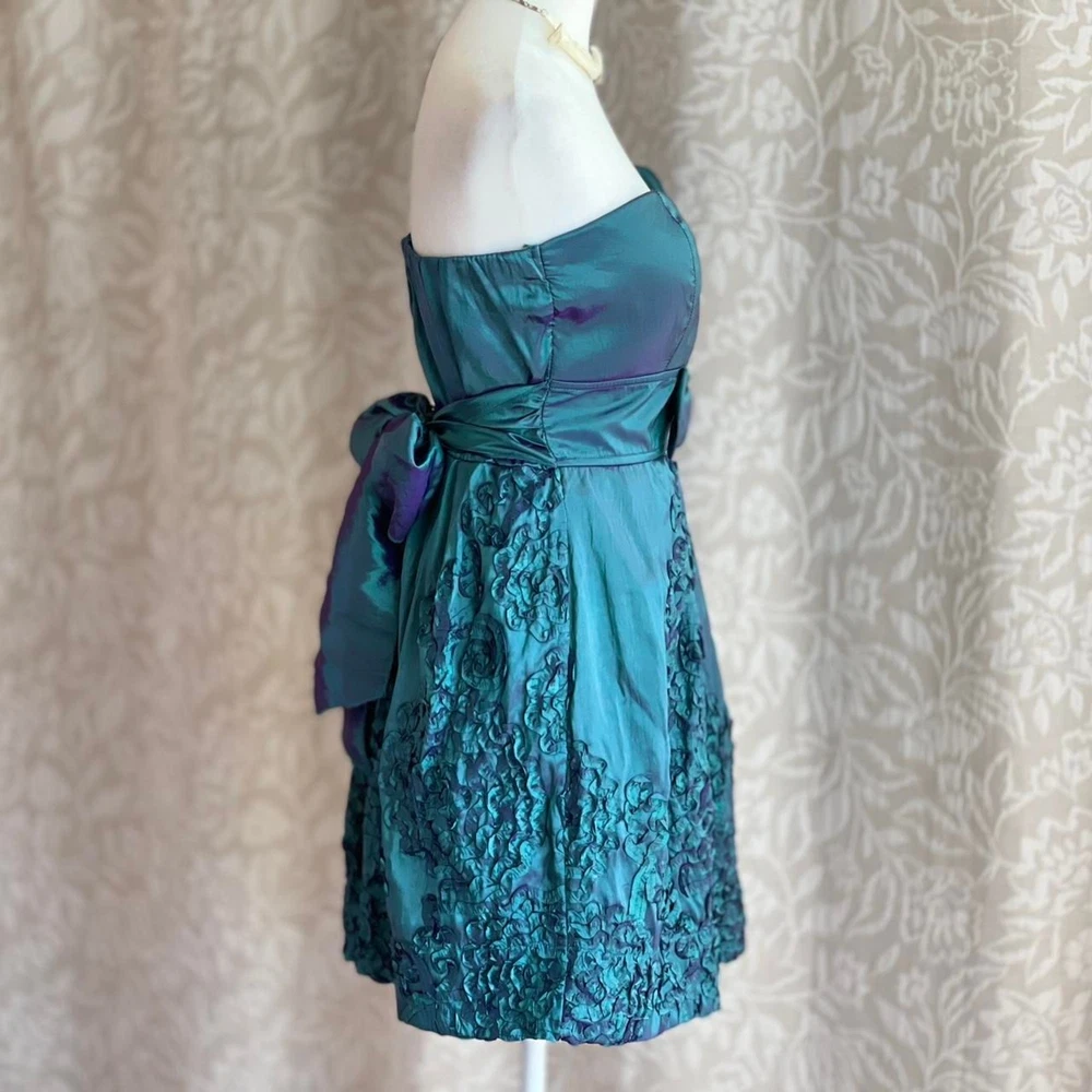 Y2K Iridescent Dress Description: absolutely stunning, vintage Y2K, teal and purple iridescent strapless floral embroidered detail tie waste mini dress by Ruby Rox in US Junior size 7. self is 60% polyester and 40% nylon, and lining is 100% polyester. Condition: fair condition overall. No visible signs of wear, but unfortunately the zipper is broken and needs to be replaced. It is finicky, and will zip properly sometimes, but will not zip properly other times. Price has been adjusted to reflect this flaw. Lay flat measurements: - pit to pit: 15 inches - waist: 14 inches - hips: 23 inches - neckline to hem: 27.5 inches - waist to hem: 18 inches Mannequin measurements: - bust: 32 inches - hips: 24.5 inches - waist: 34 inches #Y2K #Vintage #IridescentDress #Glam #PartyDress