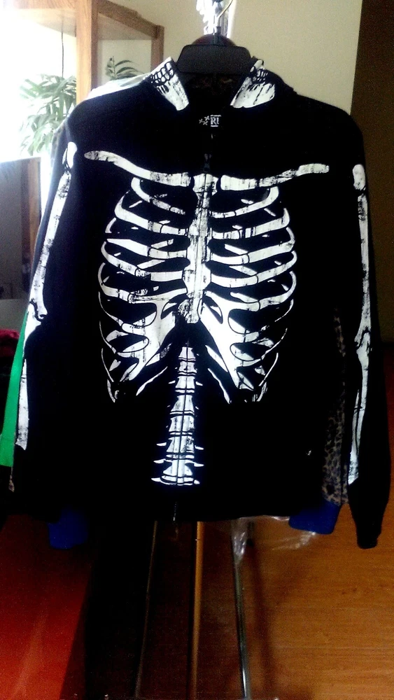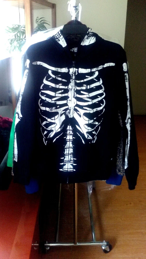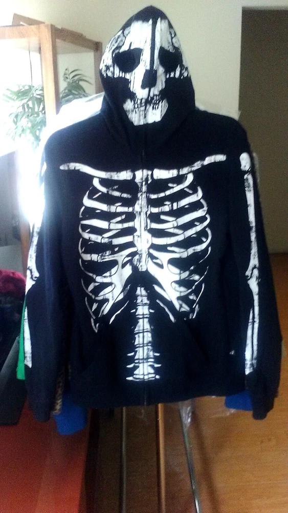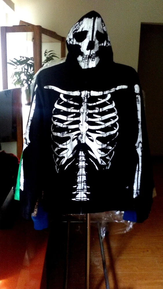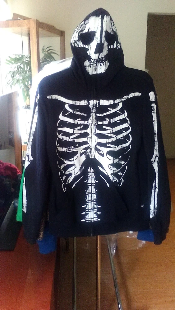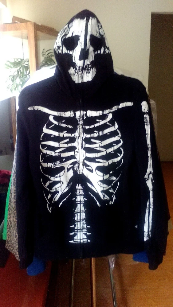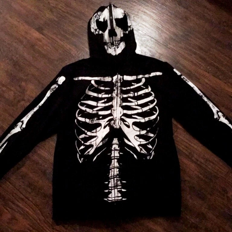 This Rude Skeleton Hoodie with Zip Up Mask is the perfect addition to any edgy wardrobe. The full zip closure and cotton blend material make it comfortable and practical for everyday wear. The hoodie features a black color and the skeleton character design adds a unique touch. The size of the hoodie is small with a regular fit and is suitable for men.
