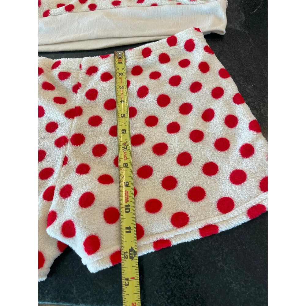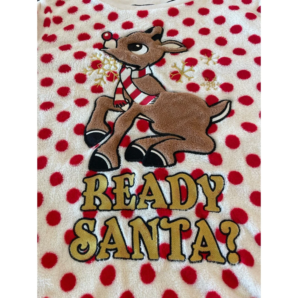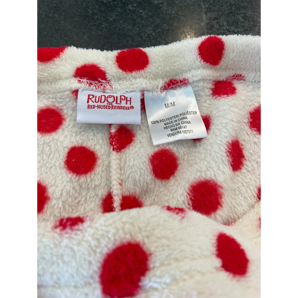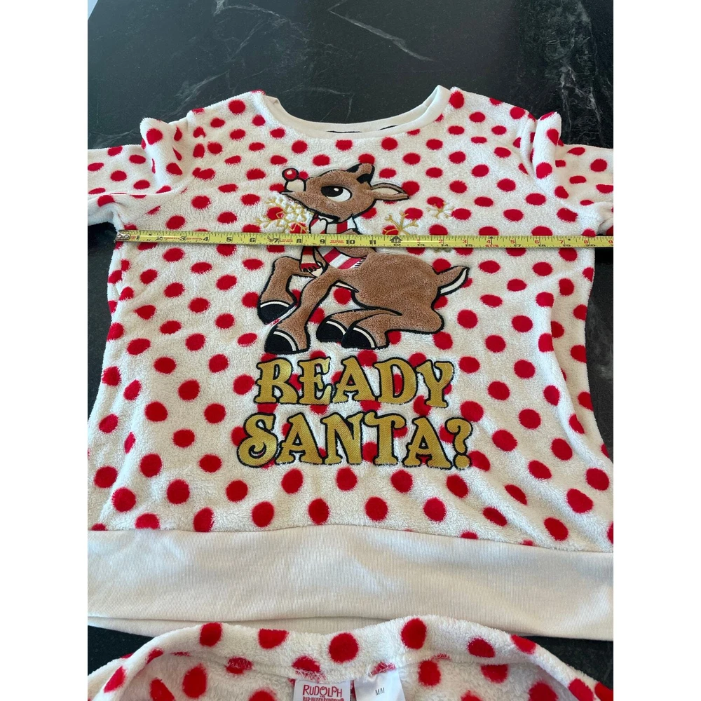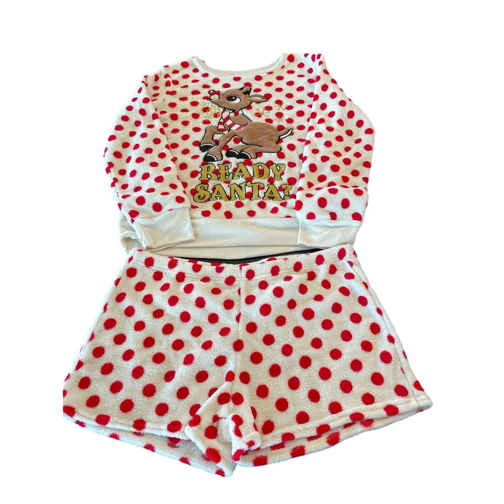 in good pre-owned condition. no holes or snags or stains etc. Size is medium. 2 piece shorty pajama set depicting Rudolph the Red Nosed raindeer saying "READY SANTA" remainder of garment is red and white polka dots. Top: P2P: @20, length: @23" From neckline to hem on back Bottoms: Inseam: @2.5", Waist: @16" while laying flat, Length: @ 12 inches from waist to hem on back.