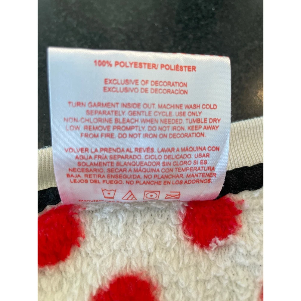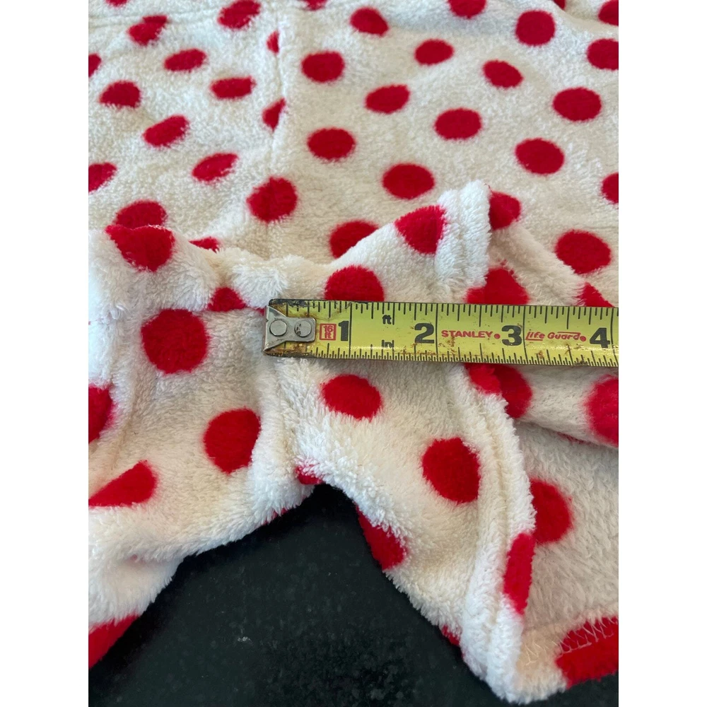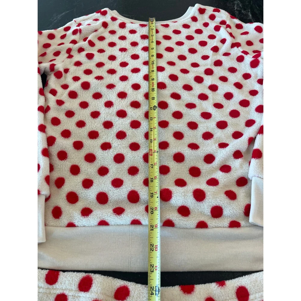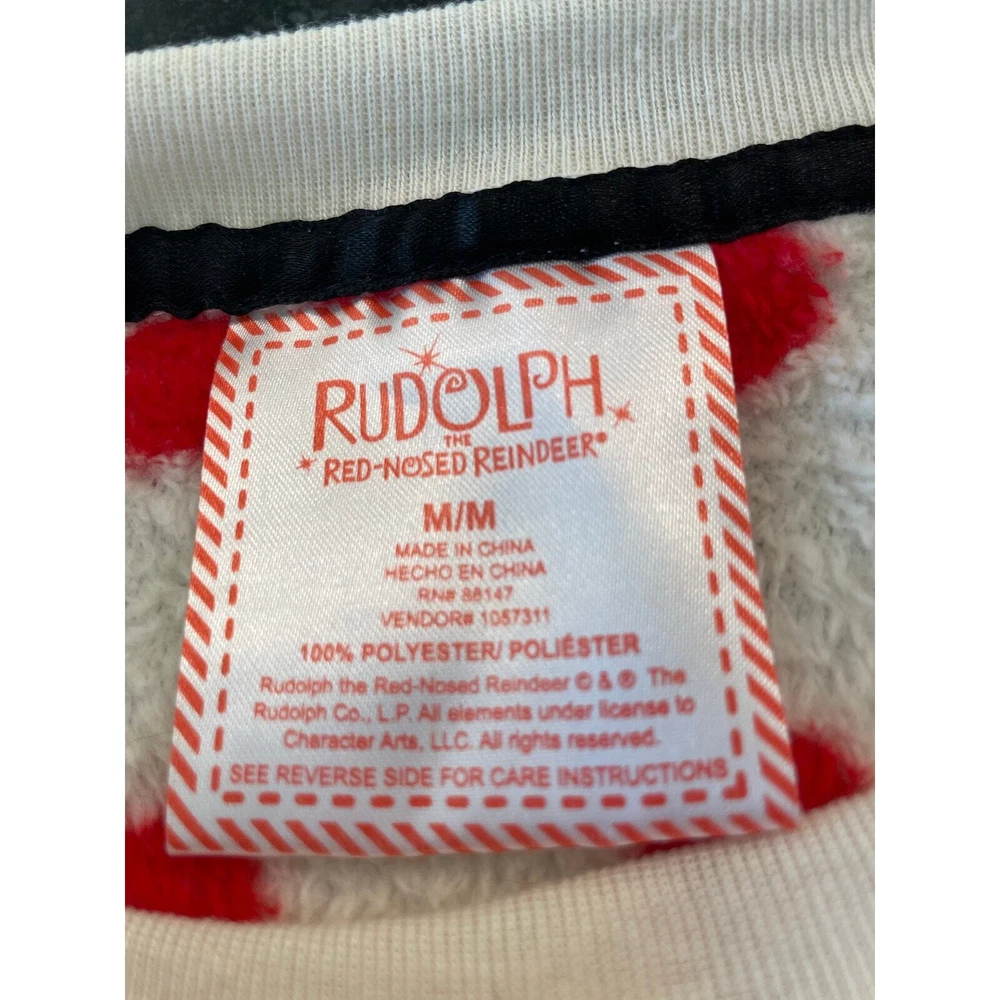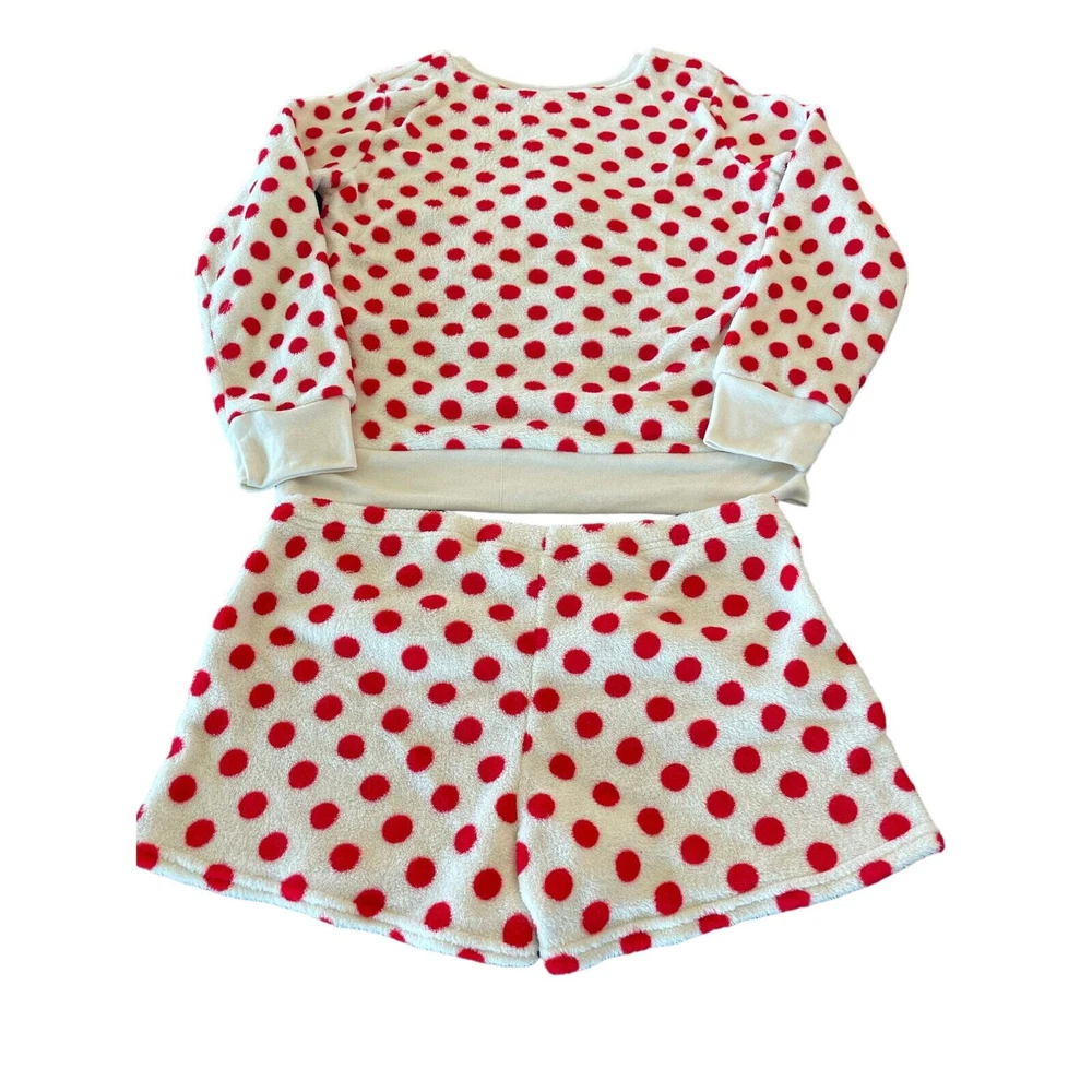 in good pre-owned condition. no holes or snags or stains etc. Size is medium. 2 piece shorty pajama set depicting Rudolph the Red Nosed raindeer saying "READY SANTA" remainder of garment is red and white polka dots. Top: P2P: @20, length: @23" From neckline to hem on back Bottoms: Inseam: @2.5", Waist: @16" while laying flat, Length: @ 12 inches from waist to hem on back.
