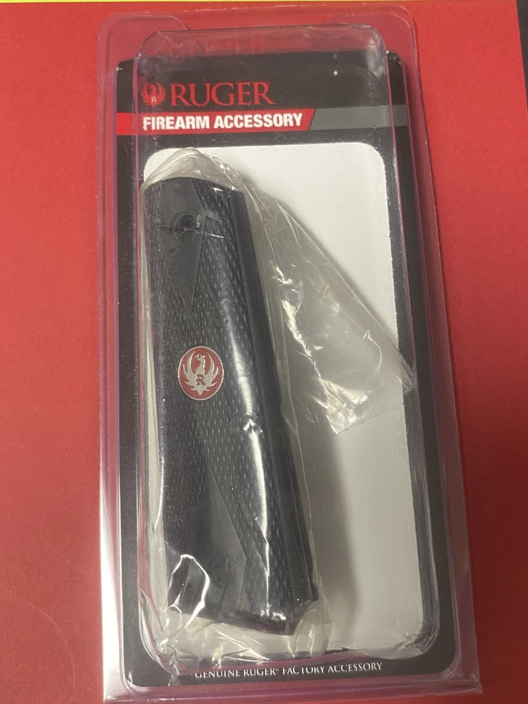 The product is a set of Ruger 1911 Factory OEM SR1911 Black Engraved Checkered Wood Grip Panels designed for use with Ruger handguns. The grip panels are made of wood and feature a black color with engraved checkered detailing.