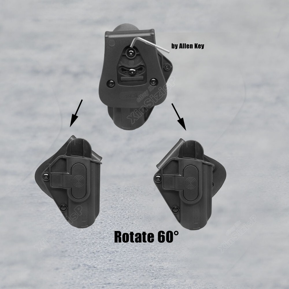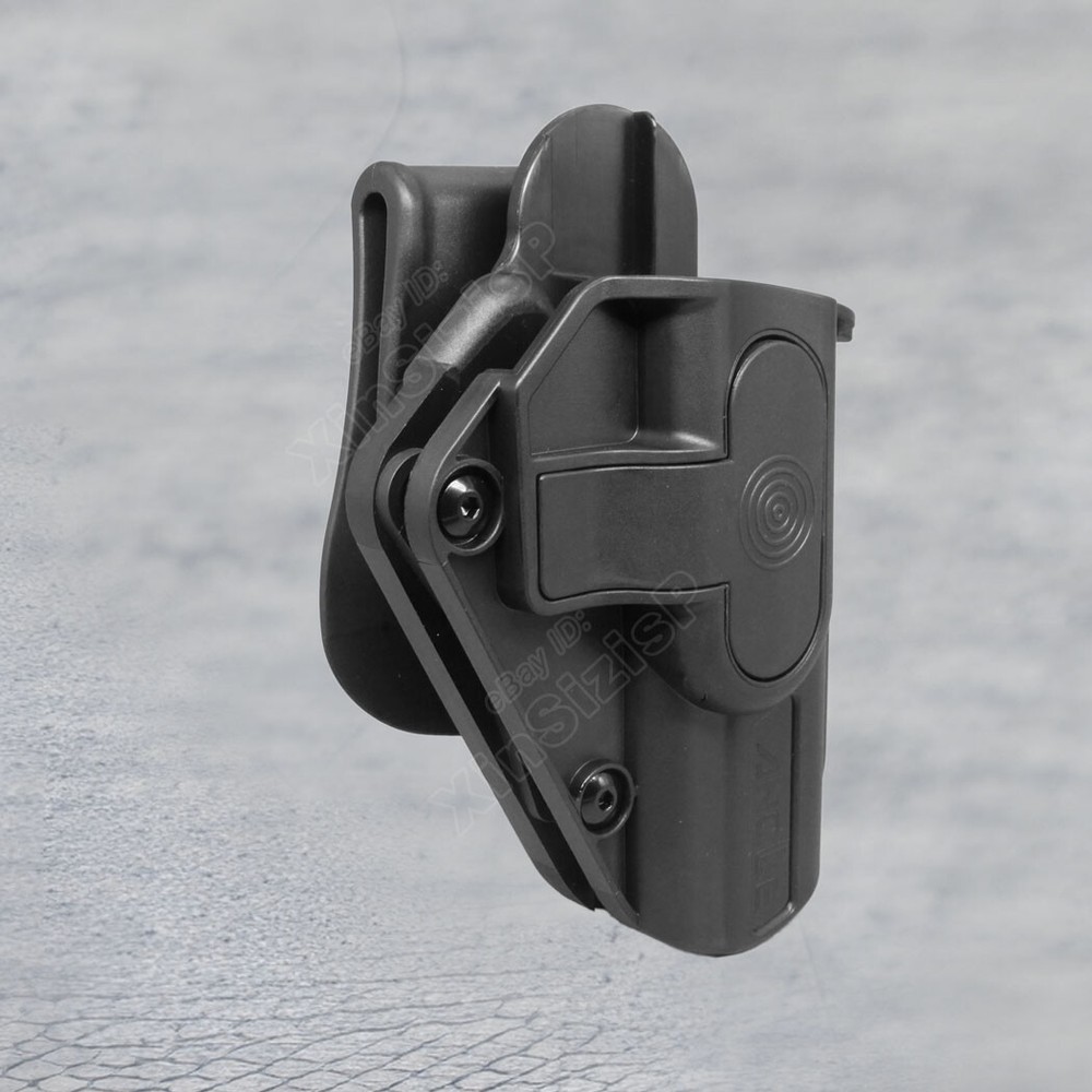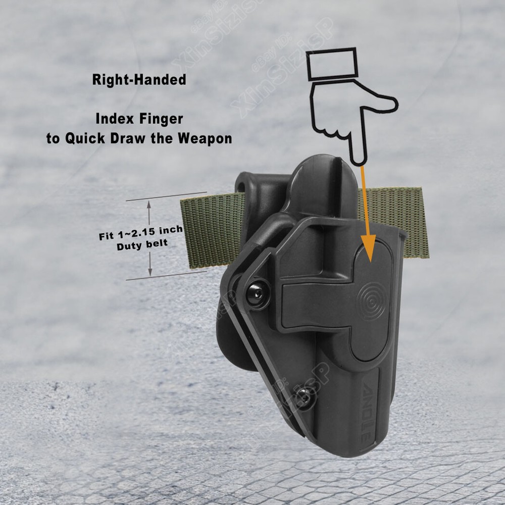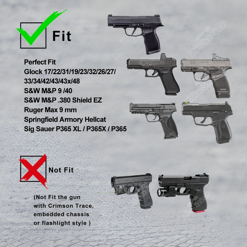 High Quality Military & Police Grade Polymer OWB Holster Specially Designed For Fast Draw During Duty Or Shooting Competition. Outside Waistband Tactical H olster Holster fit Ruger Ruger Max-9 9mm Ruger Security-9 9mm Ruger Security-380 .380 ACP Ruger 57 5.7x28mm Holster fit Taurus GX4 9mm Holster fit Springfield Armory Hellcat 9mm Holster fit SCCY SCCY CPX-1 (Gen 1, 2, 3) 9mm SCCY CPX-2 (Gen 1, 2, 3) 9mm SCCY CPX-3 .380 ACP SCCY CPX-4 .380 ACP SCCY DVG-1 9mm Holster fit Sig Sauer Sig Sauer P365 SAS 9mm Sig Sauer P365X 9mm Sig Sauer P365XL 9mm Sig Sauer P365X Macro 9mm H olster fit Glock Glock 17 (Gen 1–5) 9mm Glock 19 (Gen 1–5) 9mm Glock 19X 9mm Glock 26 (Gen 1–5) 9mm Glock 34 (Gen 1–5) 9mm Glock 43 (Gen 1–5) 9mm Glock 43X (Gen 1–5) 9mm Glock 45 (Gen 1–5) 9mm Glock 48 (Gen 1–5) 9mm Glock .40 S&W Glock 22 (Gen 1–4) .40 S&W (not compatible with Gen 5) Glock 23 (Gen 1–4) .40 S&W (not compatible with Gen 5) Glock 27 (Gen 1–5) .40 S&W Glock .357 SIG Glock 31 (Gen 1–5) .357 SIG Glock 32 (Gen 1–5) .357 SIG Glock 33 (Gen 1–5) .357 SIG Glock .380 ACP Glock 42 .380 ACP Glock .22 LR Glock 44 .22 LR Holster fit Smith & Wesson Smith & Wesson M&P 9mm Shield EZ 9mm Smith & Wesson M&P .380 Shield EZ .380 ACP ( I t perfect fit the gun with Optic Mount Mini Sight a bove on the end of the barrel , B ut without laser and no embedded chassis, and no flashlight style ) Ease And Comfort Push side buttons to achieve the fast opening and closing, unique design allows for belt carrying or vest carrying, perfectly used by duty holsters, uniformed law enforcement officers, security personnel, military personnel, private persons, and shooting sports holsters. And it fits closer to the body which can achieve better concealment under clothes. High S afety Secure Level II Retention - Auto-locking system restrain pistol in the holster to ensure ultimate safety, activate the release by pressing the button with the index finger to achieve gun access Adjustable Easily set Holster 60 degrees to your desire position with Allen key, compatible belt width up to 2 inch Tough & Durable Material Custom-molded body made of polymer stronger than leather that will wear out, adapt to every bad environment In the Package: · 1*Holster with Paddle Attachment · 1*Allen Key Shipping: Ships same day or next except Sundays and Holidays ! Free shipping! Ship by USPS First Class Package. 100% MONEY BACK GUARANTEE. Any question please be free to contact with us First .Thanks!