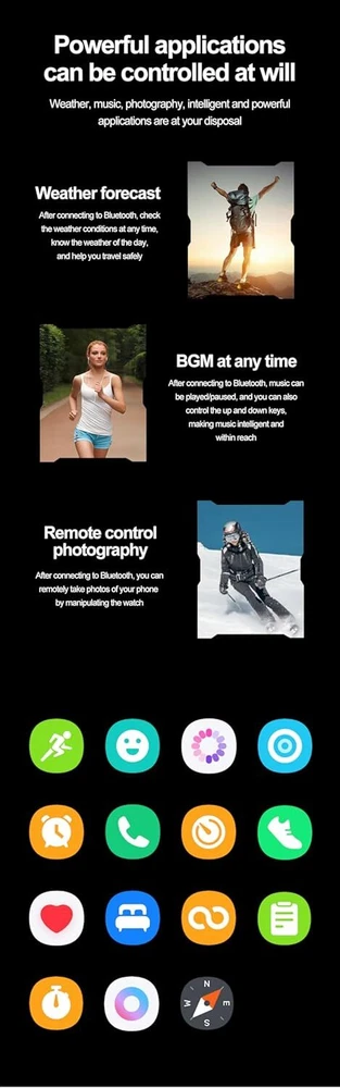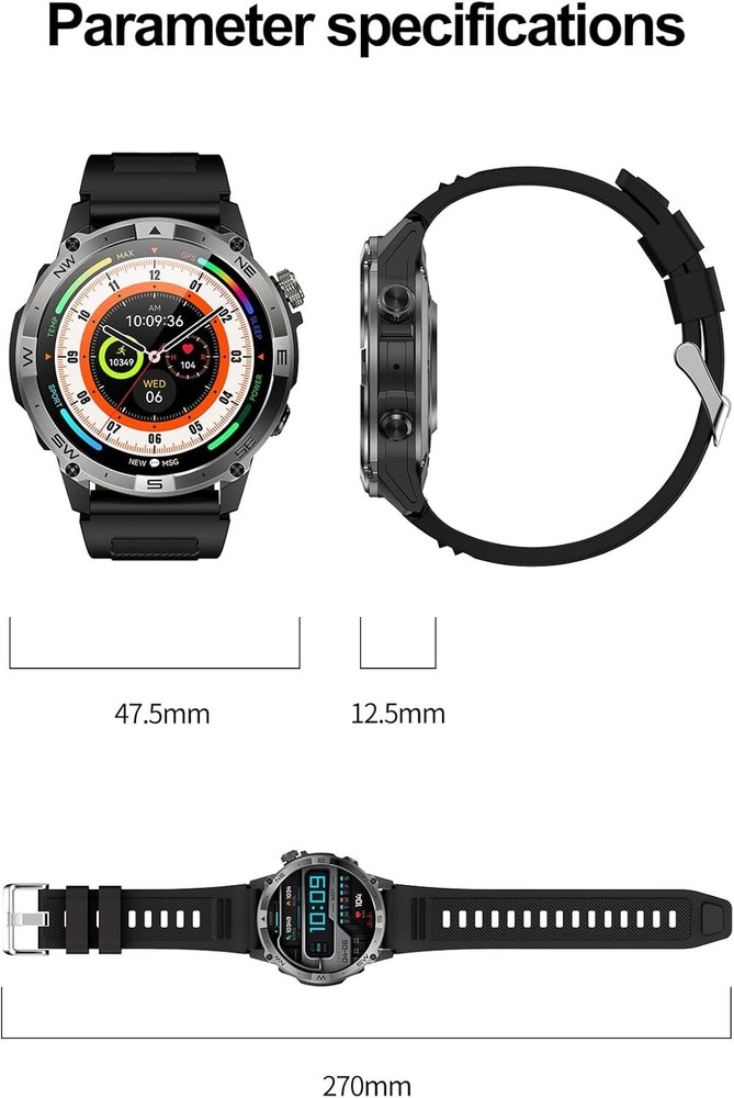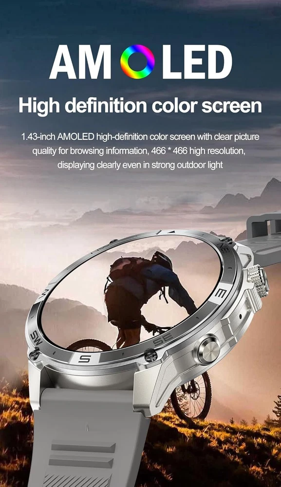 Rugged GPS Smartwatch for Men with 1.43" AMOLED Always-On Display Experience precision and durability with this rugged GPS smartwatch designed for men who love adventure and fitness. Key Features: 1.43" AMOLED Display: Vivid 466×466 resolution with always-on mode for clear visibility anytime. Built-in GPS & Outdoor Sensors: UC6228CI GPS, compass (QMC6308), altimeter, and barometer for accurate navigation and environment tracking. Bluetooth 5.3 Calling & Voice Control: Make and answer calls directly on your wrist. Hands-free voice assistant support. Offline Alipay Payment: Seamless payments without phone connectivity. Advanced Health Monitoring: Real-time heart rate, SpO2, blood pressure, sleep, stress monitoring, plus breathing exercises and sedentary alerts. Durable & Waterproof: IP68 rating protects against water, sweat, and dust for all weather conditions. Long Battery Life: 530mAh battery offers 5–7 days use, up to 30 days standby, with magnetic charging cable included. Multi-Language Support: Supports 20+ languages including English, Spanish, German, and more. Additional Functions: Music control, step counting, calories tracking, weather forecast, custom dials, world clock, calculator, message push, stress test, breathing training, and more. This rugged smartwatch combines robust outdoor features with comprehensive health tracking to keep you connected and informed on every journey.