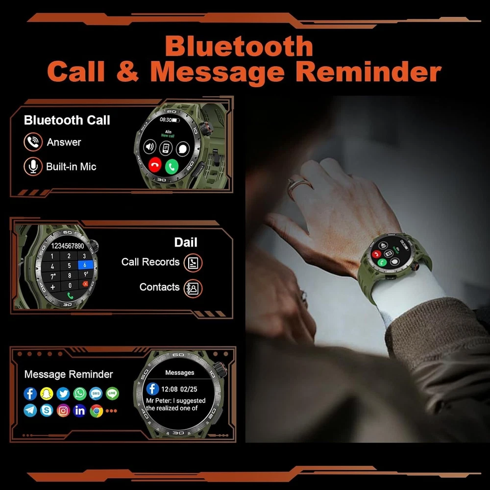 About this item 【Military Smart Watch & 5ATM Waterproof】Military smart watch for men has passed several military-grade tests such as extreme temperature -30℃-70℃, low air pressure, dust proof, and more for rugged durability! IP68 waterproof smartwatch is designed for professional outdoor sports, you can wear it to the deepth of water up to 50m, and the smartwatch still keep your data accurate 【Make/Answer Call & Message Reminder】You can answer/make/reject calls on your smartwatch via bluetooth function. After pairing your men's smartwatch with the APP "OnWear Pro" on your mobile phone, it will vibrate when you receive calls and messages (such as Twitter, Facebook, Skype, WhatsApp, etc.), so you won't miss any important messages. You can't be disturbed when you want to be quite or focus on working once you set DND mode 【110+ Sports Modes & Health Monitoring】Activity & fitness Smartwatch supports 110+ sports modes such as running, hiking, cycling, basketball, football, and more. You can select and replace as many exercise modes as you want in the APP "OnWear Pro". Smartwatch can also monitor your heart rate, spO2, blood pressure and sleep, make you know that your health real-time 【HD Touch Screen & Personalized Dial】1.43'' AMOLED Ultra definition Large Screen, 466*466px HD wide color gamut, clear picture quality, vivid and eye-catching on the wrist, presenting rich image details and color levels. You can choose the manu by rotating the Rotate button. Otherwise, there are many watch faces,and you can choose watch face you like to custom watch face 【Multifunctional & Long Endurance】Smartwatch has multiple smart functions. You can ask the weather forecast, set alarm clock and play music by vioce assistant. Otherwise there are some functions such as camera control, calendar, calculator, alarm clock, find phone etc. Smartwatch has 400mAh battery capacity , it takes 2 hours to charge, has a normal usage time of 5-7 days and a standby time of about 30 days 【Smart Watch Suitable for You】Military watches for men compatible with Android 6.0/iOS 12.0 and above. This modern watch for men women comes in a gift box, as a great gift for Birthdays, Christmas, Valentine's Day, New Year,Anniversary,Mother's Day,Father’s Day and more.They can wear the smart watch to know their health. 【After-sale and Quality Assurance】 We always promise a 3-Year warranty 30 days free returns and exchanges & 24 hours/7 Days lifetime tech support for your purchase. Please feel free to contact us for any problems you encounter in the future.We will try our best to help you to solve. Shipping We offer FREE shipping on all orders! We ship within Three business days of payment, usually sooner. We use a selection of shipping services such as UPS, FedEx, USPS etc. We only ship to the lower 48 states, no APO/FPO addresses or PO Boxes allowed. Local pickups and combined shipping options are not provided at this time. Return You can return a product for up to 30 days from the date you purchased it. Any product you return must be in the same condition you received it and in the original packaging. Please keep the receipt. Payment We accept payment by any of the following methods: PayPal Please pay as soon as possible after winning an auction, as that will allow us to post your item to you sooner! Feedback Customer satisfaction is very important to us. If you have any problem with your order, please contact us and we will do our best to make you satisfied. Contact Us If you have any queries, please contact us via ebay. We usually respond within 24 hours on weekdays. Please visit our eBay store to check out other items for sale! Thank you for shopping at our store. Disclaimer We are working with different suppliers in USA to deliver the item to your doorstep. If you have any issues regarding the item, Feel free to ask.