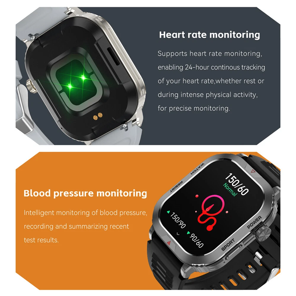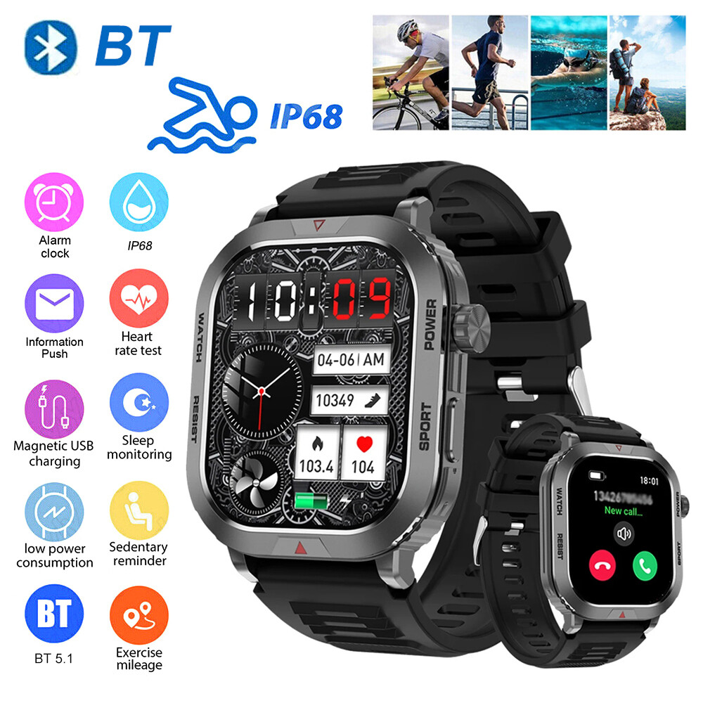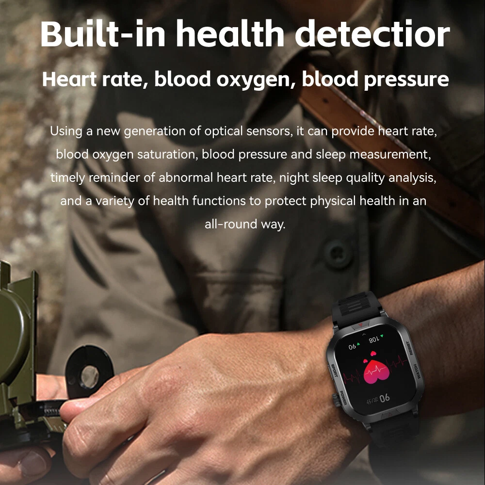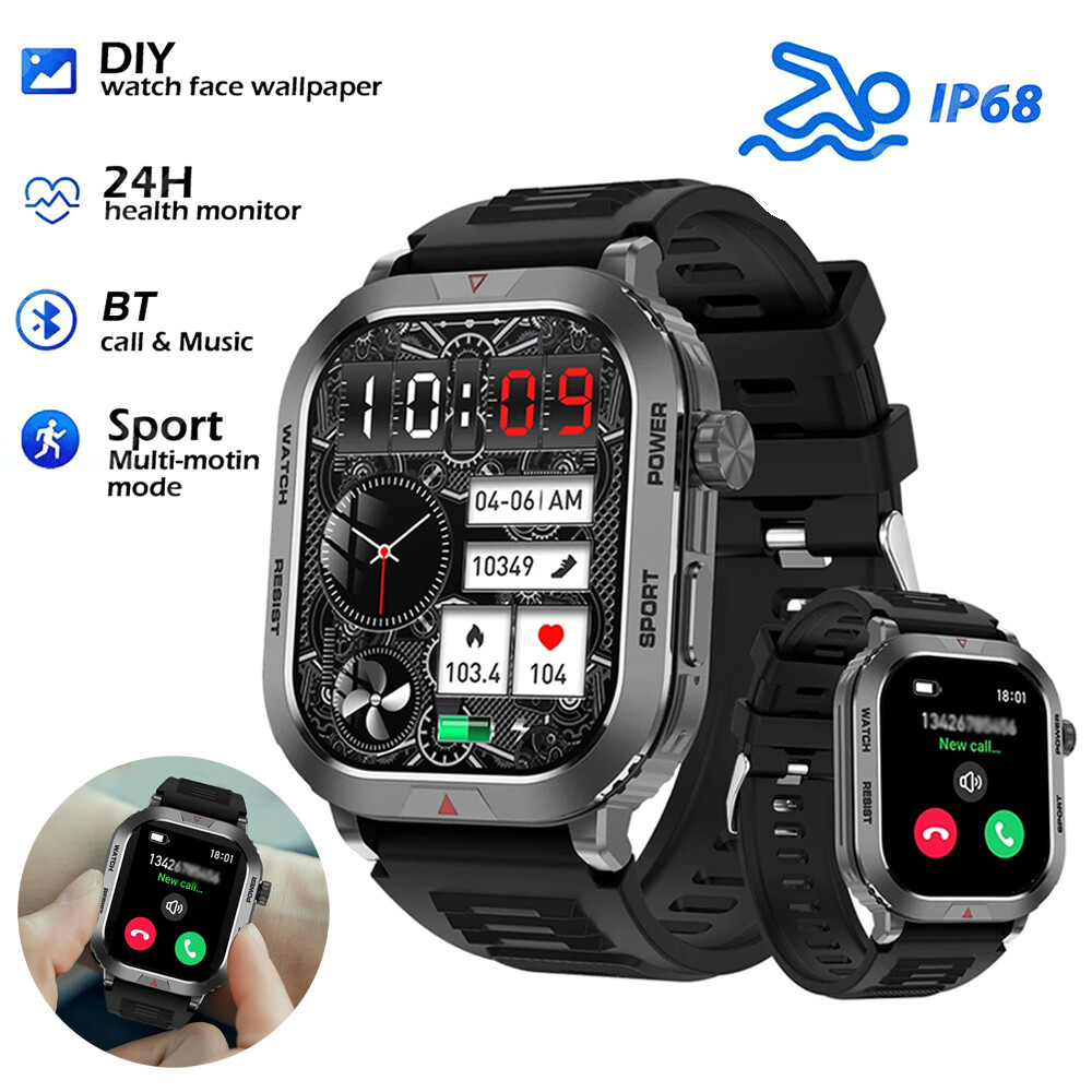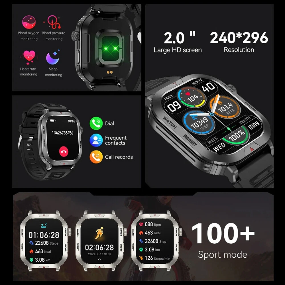 Features: 【Tough Performance】This fitness tracker watch has over 100 comprehensive workout modes for any activity, from walking to running, cycling, rock climbing, yoga, etc., which can accurately and easily track daily data such as activity, distance and calories for any purpose. The large capacity 300mAh battery is fully charged in 2 hours and lasts 3-7 days per charge, which can be extended to 30 days in standby mode. 【Wireless Calls and Message Notifications】 Make wireless calls on your smartwatch simply by connecting through the app, take calls, receive message vibration alerts and app updates - all on your wrist without having to constantly check your phone while driving, exercising, or engaging in activities where it's difficult to hold your phone. The Tactical Smartwatch keeps you informed without distraction so you can fully focus on what you're doing. 【Military Grade Certification and Full Metal Frame】Military smartwatches undergo 15 of the most rigorous durability tests to simulate harsh conditions such as deserts, rainforests and arctic weather. This proves that only a watch designed to adapt to any environment can be smart enough to be easy to use. It is IP68 water resistant and can handle splashes, sweat, etc. such as hand washing or light rain (not suitable for swimming or prolonged immersion). 【Ultra High Resolution & Customise Your Unique Style】 The smartwatch makes it easy to personalise its watch face. Its 2-inch HD display has a high resolution of 240*296, providing unrivalled visibility even outdoors. With the app, you can access more than 500 customisable dials and use the images to create personalised dials that showcase your unique personality and style. Specifications: Product Type: Smartwatch Model Number: ZW66 Apps: Fitcloudpro Main Control Chip: 8959T6 Sensor: 3-axis gravity sensor Operation mode: Multi-touch screen + two physical buttons + encoder Screen size: 2 inches Resolution: 240*296 Waterproof rating: IP68 Bluetooth version: 5.1 Speaker: Support LED torch: support Charging method: magnetic suction Battery capacity: 300mah Charging time: 2 hours Use time: 3-7 days of normal use (user use method and frequency situation) System requirements: Android 4.0 and above IOS8.0 and above Main features: pedometer, exercise time, exercise mileage, calorie consumption, sleep monitoring, save 30 days of exercise, sleep data, real-time heart rate measurement (dynamic, static), blood pressure measurement (can be set up to measure blood pressure regularly), blood oxygen measurement, body temperature, custom alarm clock reminder, sedentary reminder, incoming call reminder, information push (SMS/QQQ/WeChat), custom dials, a large number of online dials, flipping the wrist to light the screen Gmail,Snapchat,Push the information prompted by the mobile phone custom alarm clock reminder, sedentary reminder, incoming call reminder, push messages (SMS/QQQ/WeChat) Language support: Simplified Chinese, English, Japanese, Korean, German, French, Spanish, Arabic, Russian, Traditional Chinese, Ukrainian, Italian, Portuguese. Machine size: 56.74*46.27*12.68mm Strap length: 265.28mm Wristband material: silicone Body material: zinc alloy Product colour: black Package Included: 1*smart watch 1*Charging cable 1*User manual Attention: 1.Wearable devices monitor human activities through electronic sensors. They are at the level of consumer electronics. Some deviation is normal. The health test results of the watch are for reference only and cannot be compared with medical devices. When the watch is placed on the surface of an object, there will be test results such as heart rate/blood pressure. This is normal and not a product defect. 2. As the firmware is updated, the user interface will be updated accordingly. Pictures are for reference only, everything is subject to the actual product. 3.This product is an electronic product. Do not use this product for bathing. Do not expose it to high temperatures. Do not immerse it in water. 4.Please download the APP and bind the watch first, do not use your mobile phone Bluetooth to link the watch directly. If it is already connected, please remove the matching watch from the Bluetooth matching device of your mobile phone. 5.Due to the difference of light and screen, the colour of the item may be slightly different from the picture, thank you very much!