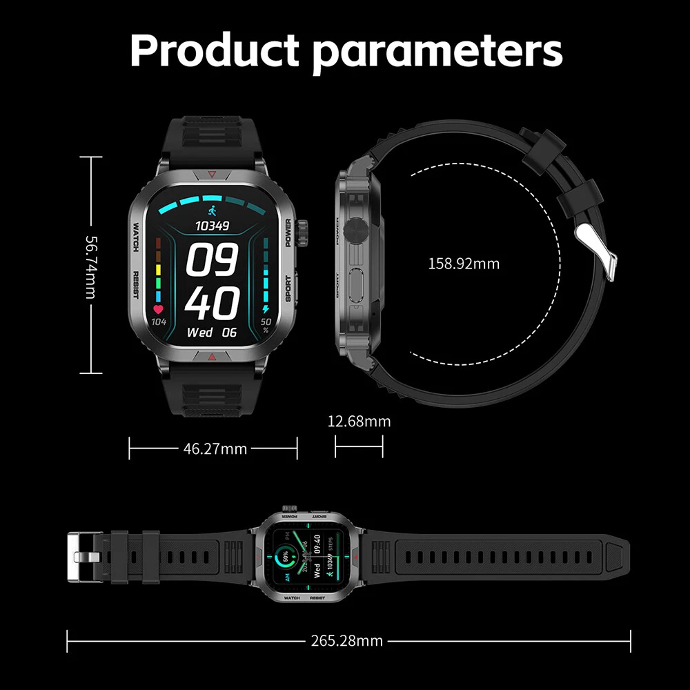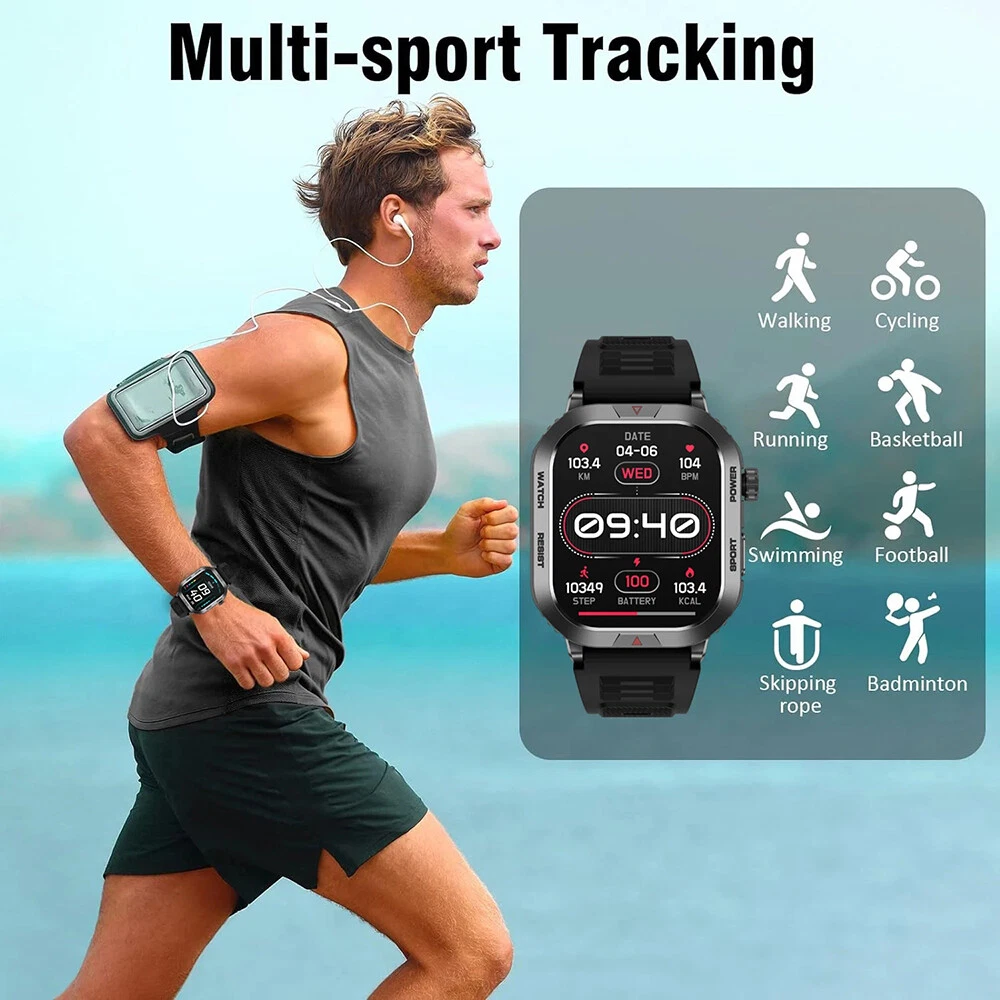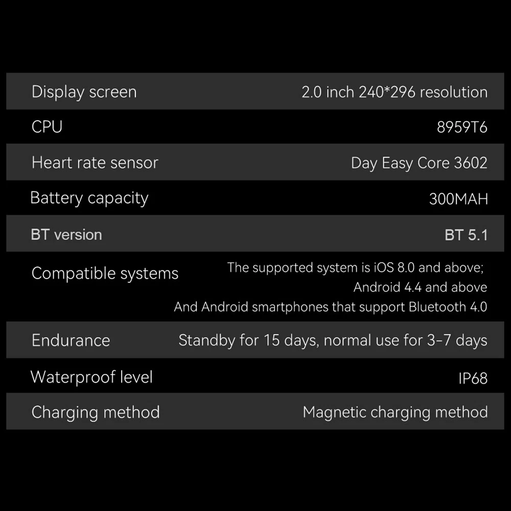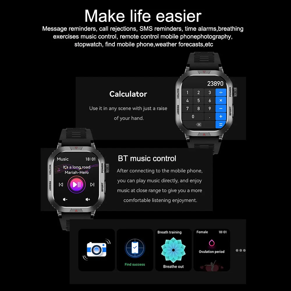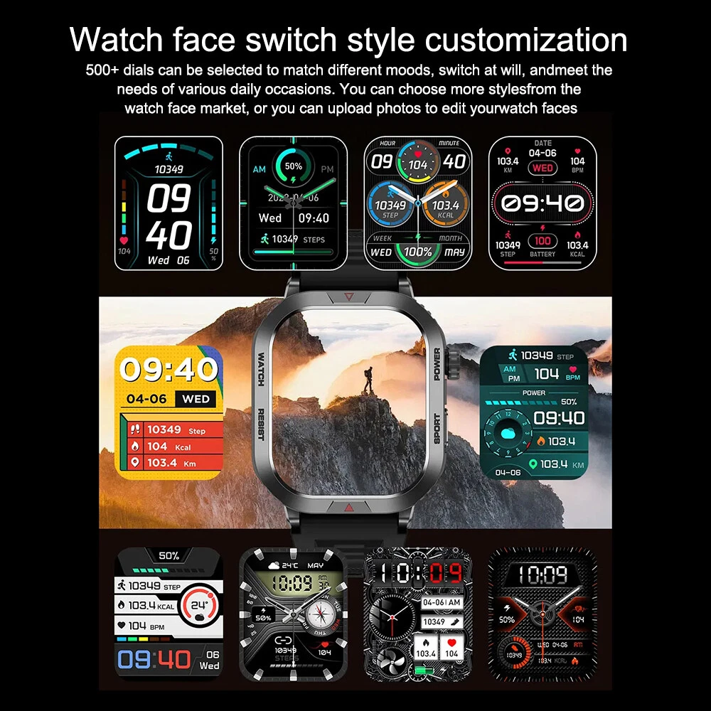 Features: 【Tough Performance】This fitness tracker watch has over 100 comprehensive workout modes for any activity, from walking to running, cycling, rock climbing, yoga, etc., which can accurately and easily track daily data such as activity, distance and calories for any purpose. The large capacity 300mAh battery is fully charged in 2 hours and lasts 3-7 days per charge, which can be extended to 30 days in standby mode. 【Wireless Calls and Message Notifications】 Make wireless calls on your smartwatch simply by connecting through the app, take calls, receive message vibration alerts and app updates - all on your wrist without having to constantly check your phone while driving, exercising, or engaging in activities where it's difficult to hold your phone. The Tactical Smartwatch keeps you informed without distraction so you can fully focus on what you're doing. 【Military Grade Certification and Full Metal Frame】Military smartwatches undergo 15 of the most rigorous durability tests to simulate harsh conditions such as deserts, rainforests and arctic weather. This proves that only a watch designed to adapt to any environment can be smart enough to be easy to use. It is IP68 water resistant and can handle splashes, sweat, etc. such as hand washing or light rain (not suitable for swimming or prolonged immersion). 【Ultra High Resolution & Customise Your Unique Style】 The smartwatch makes it easy to personalise its watch face. Its 2-inch HD display has a high resolution of 240*296, providing unrivalled visibility even outdoors. With the app, you can access more than 500 customisable dials and use the images to create personalised dials that showcase your unique personality and style. Specifications: Product Type: Smartwatch Model Number: ZW66 Apps: Fitcloudpro Main Control Chip: 8959T6 Sensor: 3-axis gravity sensor Operation mode: Multi-touch screen + two physical buttons + encoder Screen size: 2 inches Resolution: 240*296 Waterproof rating: IP68 Bluetooth version: 5.1 Speaker: Support LED torch: support Charging method: magnetic suction Battery capacity: 300mah Charging time: 2 hours Use time: 3-7 days of normal use (user use method and frequency situation) System requirements: Android 4.0 and above IOS8.0 and above Main features: pedometer, exercise time, exercise mileage, calorie consumption, sleep monitoring, save 30 days of exercise, sleep data, real-time heart rate measurement (dynamic, static), blood pressure measurement (can be set up to measure blood pressure regularly), blood oxygen measurement, body temperature, custom alarm clock reminder, sedentary reminder, incoming call reminder, information push (SMS/QQQ/WeChat), custom dials, a large number of online dials, flipping the wrist to light the screen Gmail,Snapchat,Push the information prompted by the mobile phone custom alarm clock reminder, sedentary reminder, incoming call reminder, push messages (SMS/QQQ/WeChat) Language support: Simplified Chinese, English, Japanese, Korean, German, French, Spanish, Arabic, Russian, Traditional Chinese, Ukrainian, Italian, Portuguese. Machine size: 56.74*46.27*12.68mm Strap length: 265.28mm Wristband material: silicone Body material: zinc alloy Product colour: black Package Included: 1*smart watch 1*Charging cable 1*User manual Attention: 1.Wearable devices monitor human activities through electronic sensors. They are at the level of consumer electronics. Some deviation is normal. The health test results of the watch are for reference only and cannot be compared with medical devices. When the watch is placed on the surface of an object, there will be test results such as heart rate/blood pressure. This is normal and not a product defect. 2. As the firmware is updated, the user interface will be updated accordingly. Pictures are for reference only, everything is subject to the actual product. 3.This product is an electronic product. Do not use this product for bathing. Do not expose it to high temperatures. Do not immerse it in water. 4.Please download the APP and bind the watch first, do not use your mobile phone Bluetooth to link the watch directly. If it is already connected, please remove the matching watch from the Bluetooth matching device of your mobile phone. 5.Due to the difference of light and screen, the colour of the item may be slightly different from the picture, thank you very much!
