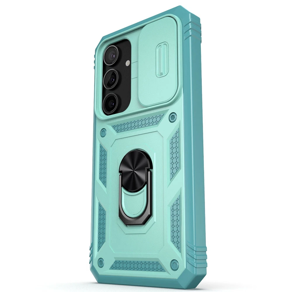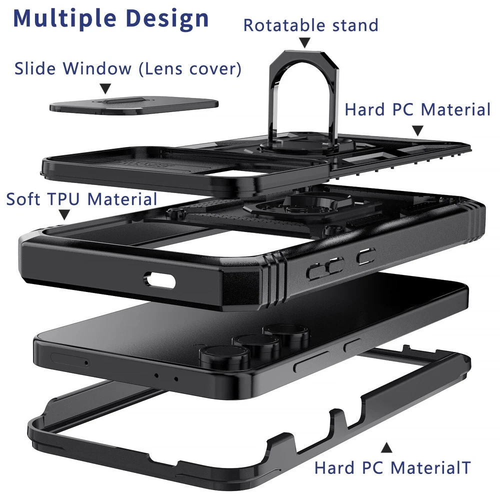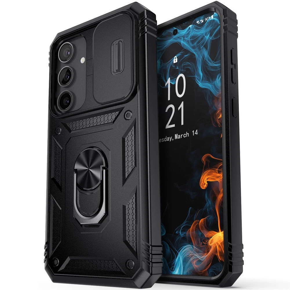 Compatible With: For Samsung Galaxy S24 FE Features: ▪ High Quality: The frame is made of flexible TPU silica gel which avoids your phone falling from high place. The back side of the case is made of hard PC that provides scratch protection. ▪ with Side Camera Cover: Slide cover design for protecting and hide the camera perfectly. ▪ Built-in kickstand: 360 kickstand Ring Stand offers convenient hands-free viewing from either landscape or portrait two different angles; ▪ Magnetic Car Mount: Built-in metal magnetic sheet which can be directly adsorbed stably to the magnetic car mount holder. (Not includes the magnetic car mount holder.) ▪ Precise Cutouts: Precise design, Easy access to all ports, buttons, and features. ▪ Raised edges design ensures extra protection for the screen and camera. Package: 1x Shockproof Ring Stand Cover with Slide Camera Case