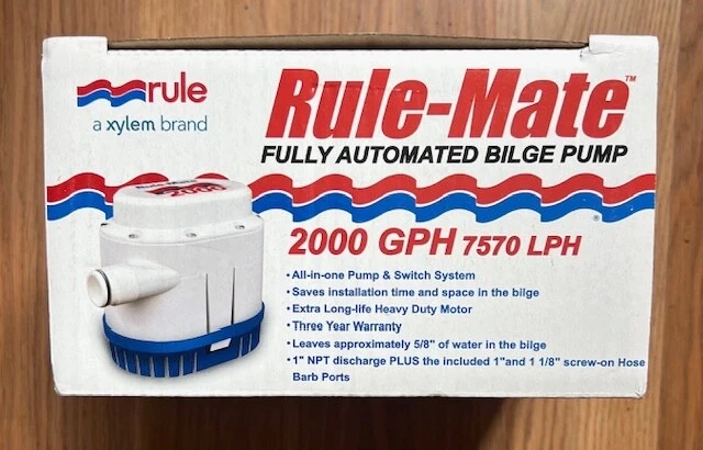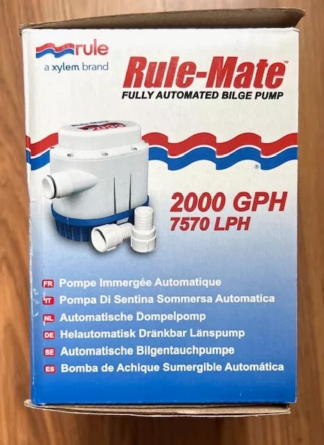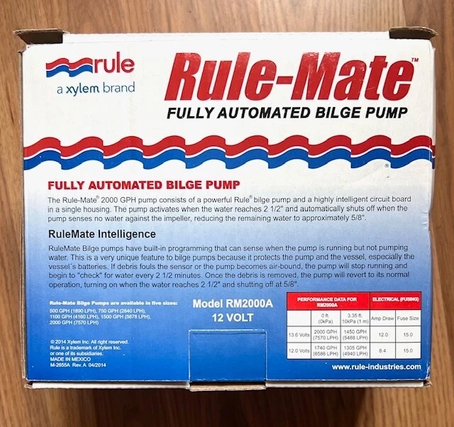 Rule-Mate 2000 GPH 12 Volt Fully Automated Bilge Pump Model : RM2000A The Rule-Mate® 2000 GPH pump consists of a powerful Rule® bilge pump and a highly intelligent circuit board in a single housing. The pump activated when the water reaches 2-1/2" and automatically shuts off when the pump senses no water against the impeller, reducing the remaining water to approximately 5/8". Rule-Mate Intelligence Rule-Mate Bilge pumps have built-in programming that can sense when the pump is running but not pumping water. This is a very unique feature to bilge pumps because it protects the pump and the vessel, especially the vessels batteries. If debris fouls the sensor or the pump becomes air-bound, the pump will stop running and begin to "check" for water every 2-1/2 minutes. Once the debris is removed, the pump will revert to its normal operation, turning on when the water reaches 2-1/2" and shutting off at 5/8". 2000 GPH (7570 LPH) at 0' (13.6V) All-in-one pump and switch Extra long life heavy duty motor 1" NPS discharge with 1" AND 1 1/8" screw-on ports The Rule-Mate® 2000 GPH pump consists of a powerful Rule® bilge pump and a highly intelligent circuit board in a single housing. The pump activated when the water reaches 2-1/2" and automatically shuts off when the pump senses no water against the impeller, reducing the remaining water to approximately 5/8". Rule-Mate Intelligence Rule-Mate Bilge pumps have built-in programming that can sense when the pump is running but not pumping water. This is a very unique feature to bilge pumps because it protects the pump and the vessel, especially the vessels batteries. If debris fouls the sensor or the pump becomes air-bound, the pump will stop running and begin to "check" for water every 2-1/2 minutes. Once the debris is removed, the pump will revert to its normal operation, turning on when the water reaches 2-1/2" and shutting off at 5/8". 2000 GPH (7570 LPH) at 0' (13.6V) All-in-one pump and switch Extra long life heavy duty motor 1" NPS discharge with 1" AND 1 1/8" screw-on ports