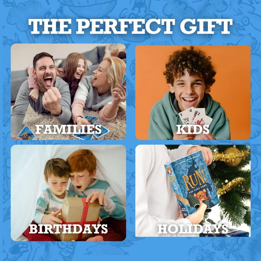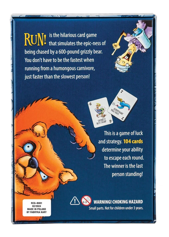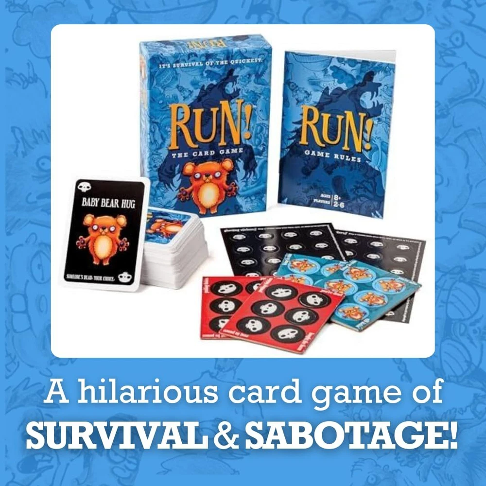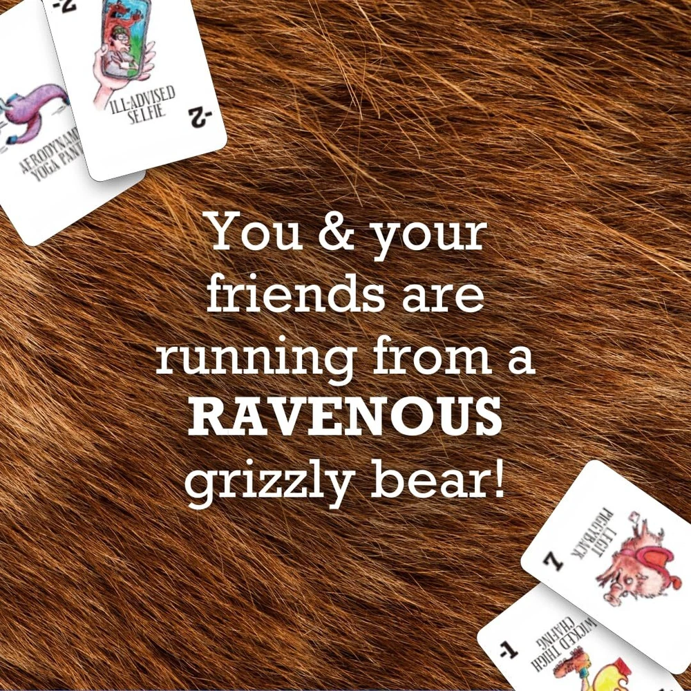 RUN! is the hilarious new card game that simulates fleeing from a hungry grizzly bear with your friends! The higher your card total, the faster you will be. Sabotage your family and friends with negative cards like "meat necklace" and "chum cologne" as you try to outrun them all! Remember, you don't have to be the fastest runner, just don't be the slowest. The last player standing wins! Each game comes with 104 full-color cards, 24 life chips, 2 ghosting sticker sheets, and 1 instructional booklet. Wildly Fun for Families: Bring the family together over belly laughs and friendly sabotage! This hilarious card game will have everyone competing to win at game night. Quick & Intuitive Gameplay: The rules are easy to learn, and play is simple. Fast-paced and engaging, this family card game for and adults is easy for all ages 8+. The average game lasts 15 to 30 minutes. Perfect Gift for : Looking for card games ages 8-12? Family card games for and adults? Or maybe you're looking for the top, best family games 2024? Unwrapping this card game will surely knock their socks off! Extremely Portable & Travel-Friendly: Small in size, this compact game is easy to pack and light to carry. Whether you’re going on vacation or setting up camp in the backyard, this board game for teens and travels easily with you! Check Out the Expansion Pack: If you like playing funny family games, then you’ll love the Grizzly Bear Expansion Pack! These extra cards promote even more extreme gameplay and fun competition. Find it here: https:///Havenhurst-Press-Card-Grizzly-Expansion/dp/B0D8WNBC39/