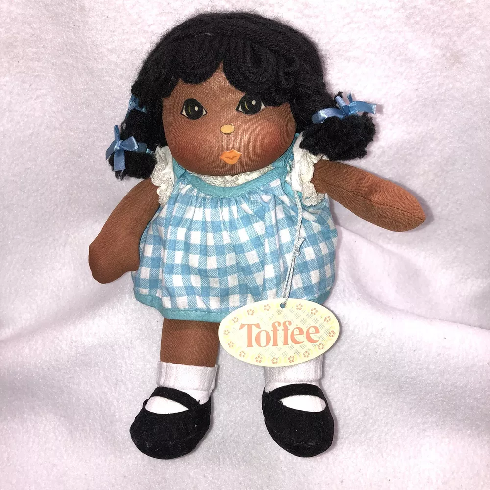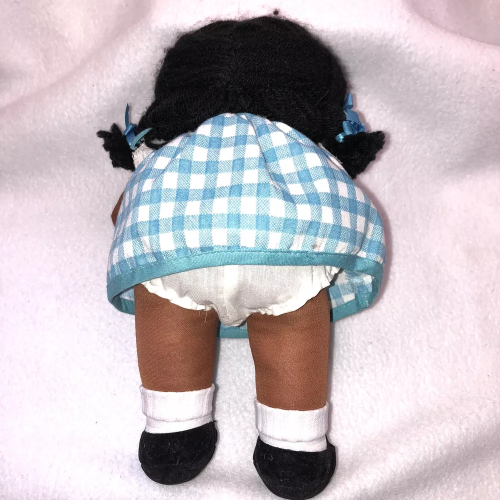 This is a sweet vintage doll from Russ Berrie and Company Inc. She is named "TOFFEE" and she comes dress in a blue and white checkered dress with a white undergarmet that is trimmed in lace that peeks out of the arm holes and neckline. She has white socks and black shoes that are attached. Her hair is black yarn that is braided into four pigtails and I believe her head is styrofoam under the fabric. Toffee's original Russ tag reads "My name is Toffee and I want you to know that I'll be your friend wherever you go. You'll recognize me by my pigtails and bows. I'm as sweet as can be from my head to my toes." She measures approximately 9 inches tall and is about 8 inches from tip of her hand to the tip of her other hand and is number 667. If I had to guess, I would date her to the 1970's. Doll is in good vintage pre-owned condition. She appears to be missing one blue bow on her left side (see 2nd photo). There are three on the right and I am assuming they were symmetrical and there should be three on the left. She comes with her original Russ tag still attached. There is some writing on the back of the tag (see 7th photo). I did note a small spot on the back of her dress near the hem (see last photo). Please review and enlarge all photos as they contain additional details, views and measurements. Shipped via USPS Ground Advantage.