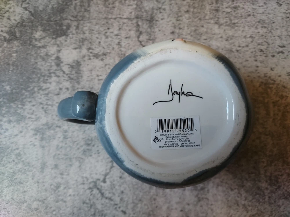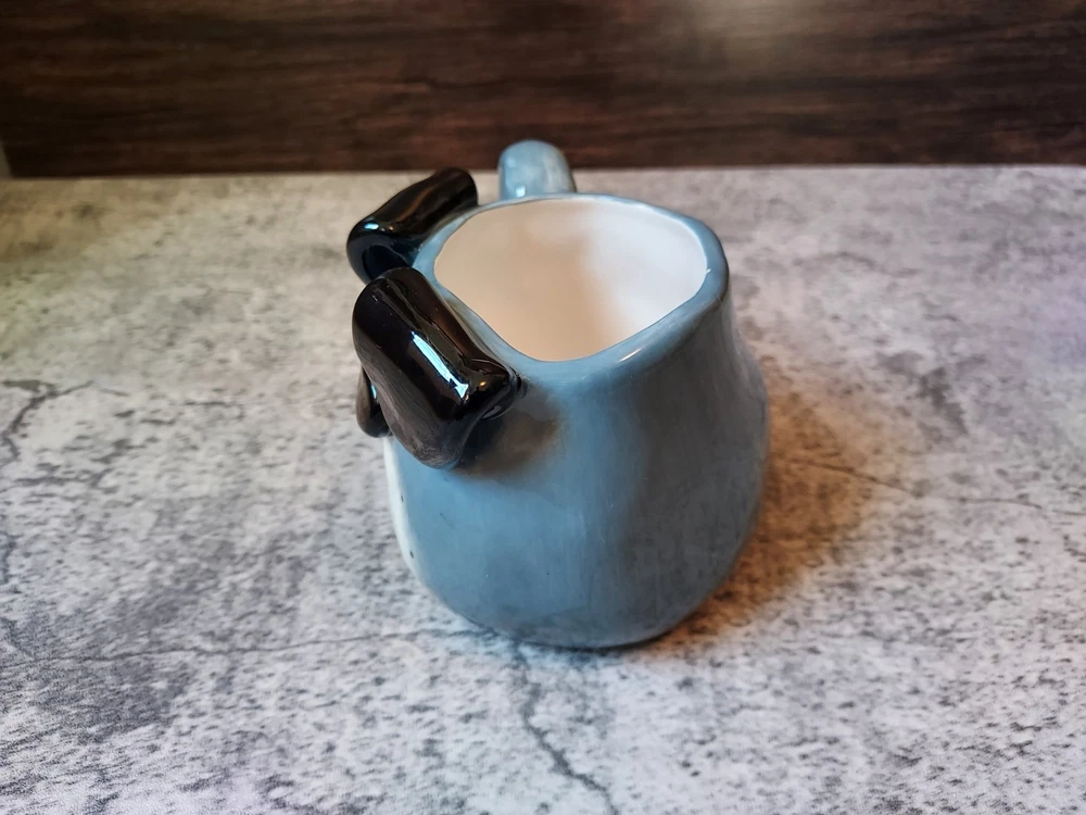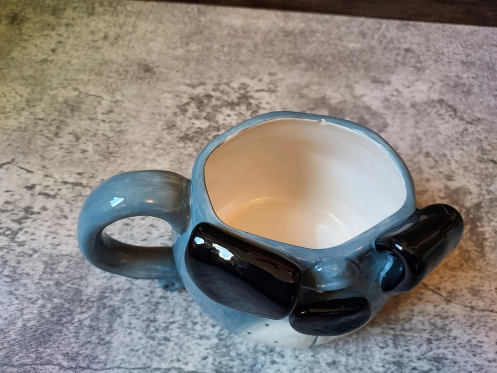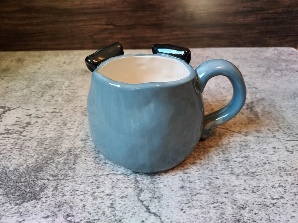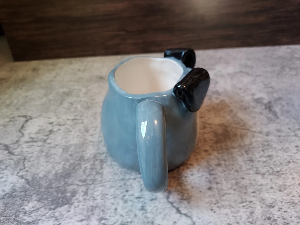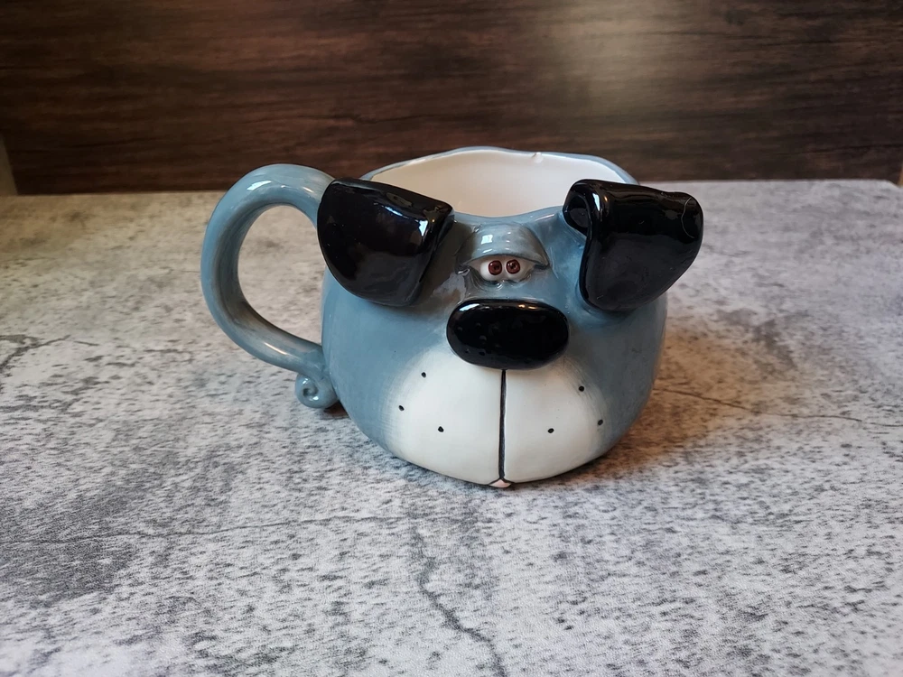 This is a medium-sized ceramic coffee mug by Russ Berrie, featuring a whimsical 3D design of a dog with floppy ears, signed by artist Douglas. The mug is round in shape, painted in grey, white, and black colors. It has a capacity of 10 oz and is decorated in a playful Pop Art style. This handmade mug is suitable for hot or cold beverages and is recommended for hand wash only. Perfect for all occasions, birthdays, or back to school.