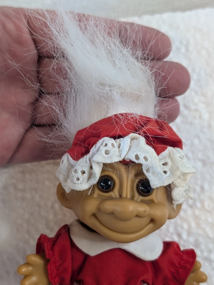 Embrace the festive spirit with the charming Russ Berrie Troll Mrs. Claus figurine. At 5 inches tall, this delightful character is decked out in her signature red and white, complete with a holly apron, exuding the warmth and cheer of Christmas. Crafted from durable vinyl, this piece captures the whimsy of the holiday season and is a treasured addition to any collection. Whether displayed on a mantel or nestled among your holiday decor, this medium-sized, multicolored figurine is suitable for both adult and kid audiences, making it a versatile gift or a quaint keepsake. It's a genuine original, complete with the original Russ sticker on its foot, celebrating its vintage appeal and the joy of the yuletide season.