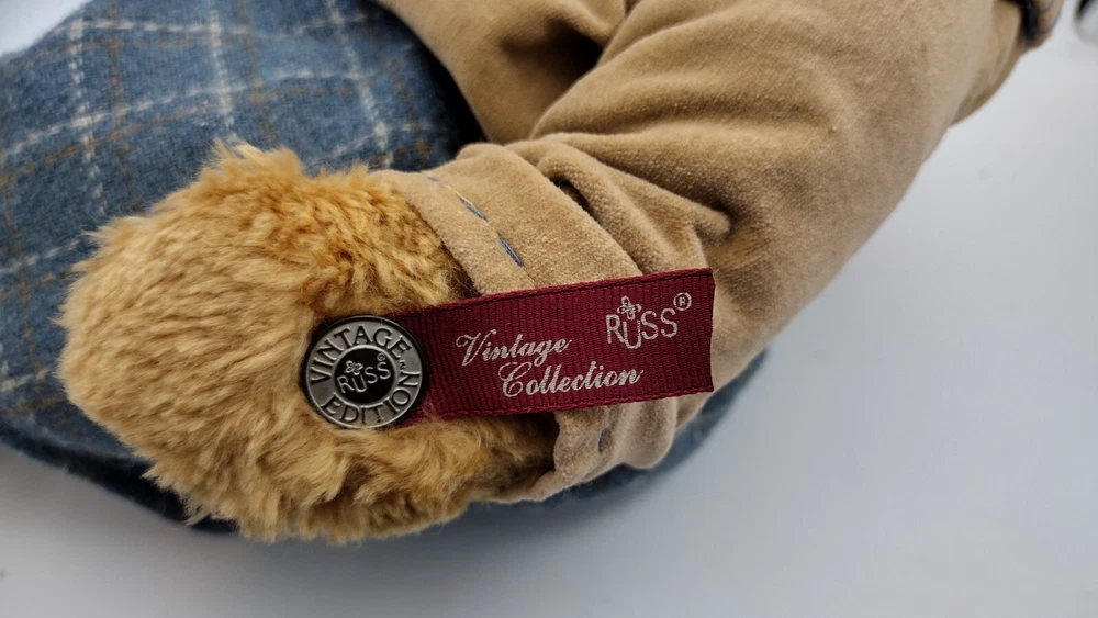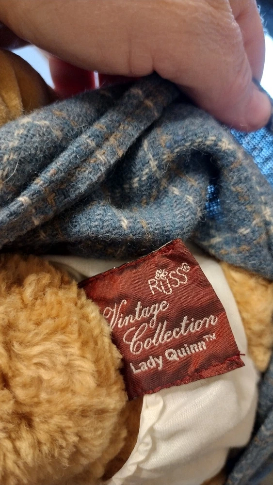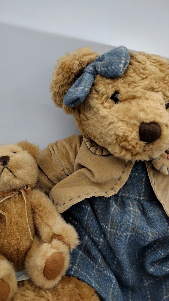 This adorable vintage edition bear measures approximately 14" in height. The bear is holding a baby teddy bear; she is wearing a blue dress with a blue bow. It has its tag attached by a metal button. Too cute and nicely weighted! Shipped with USPS Ground Mail.