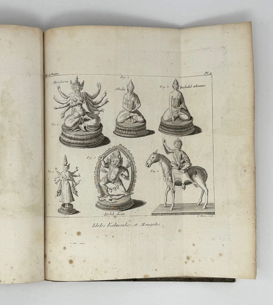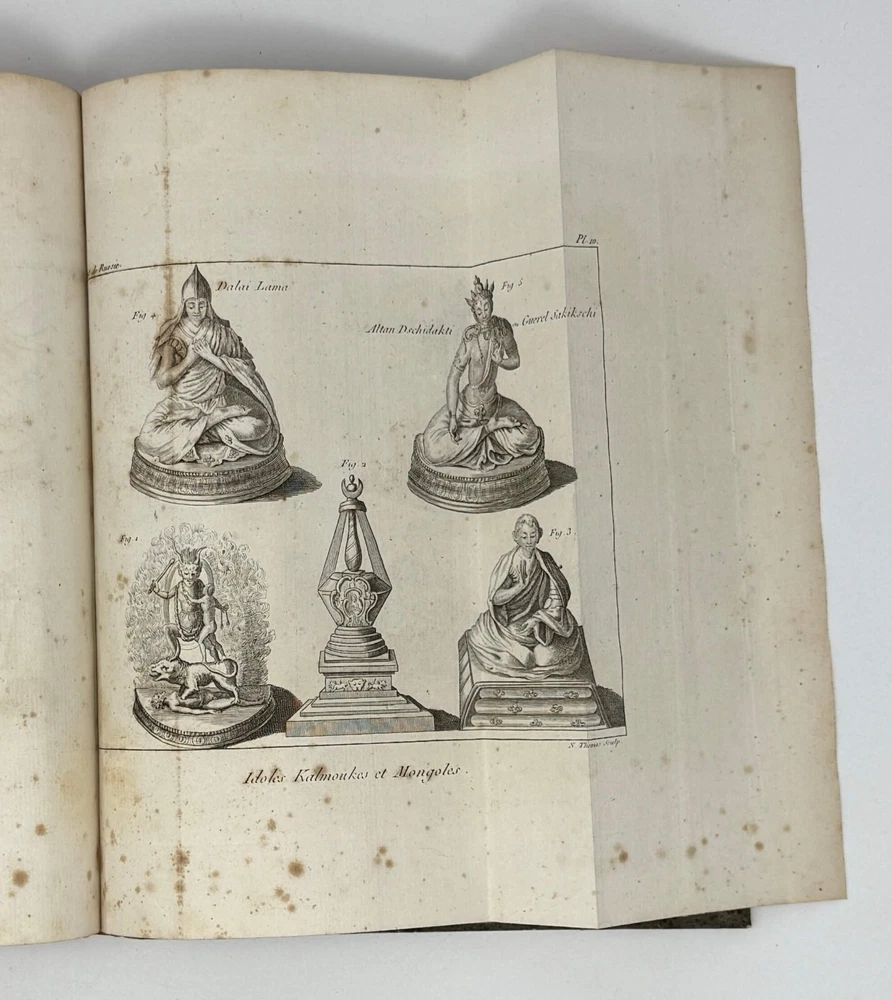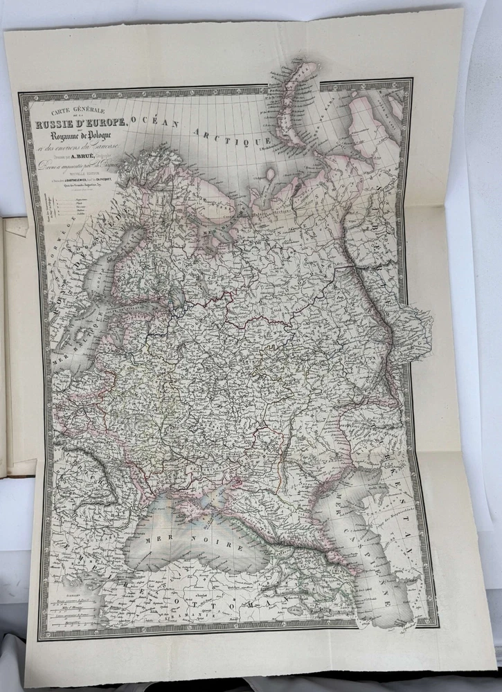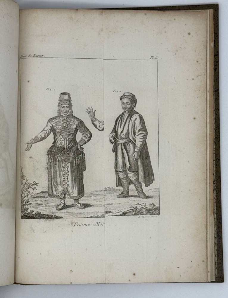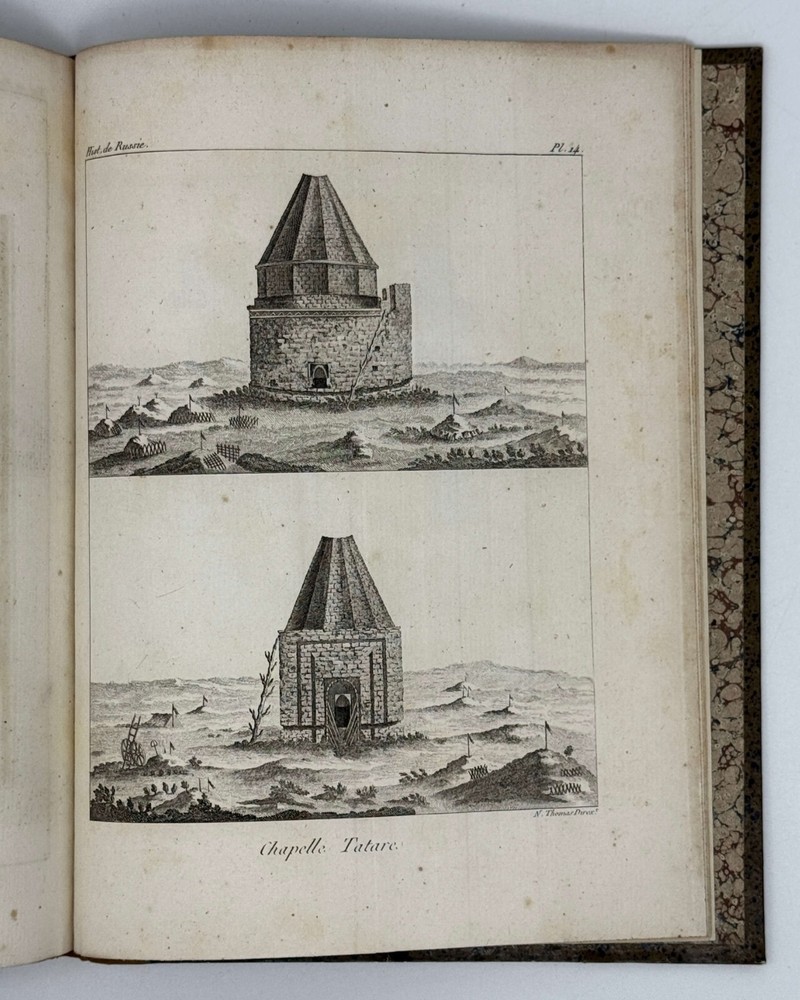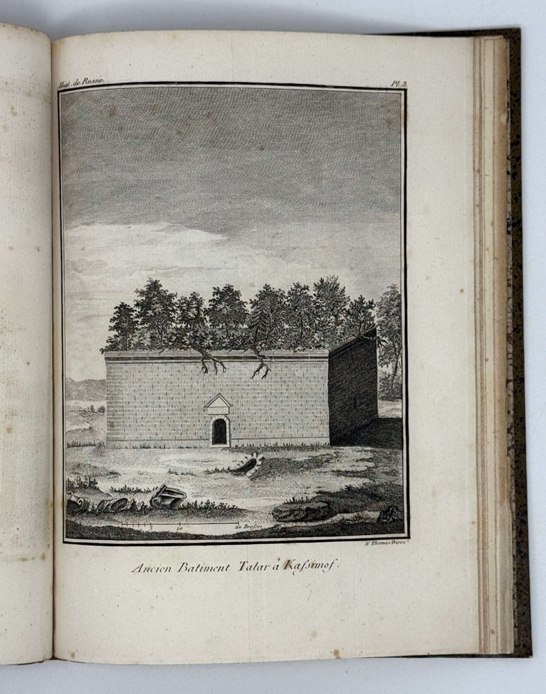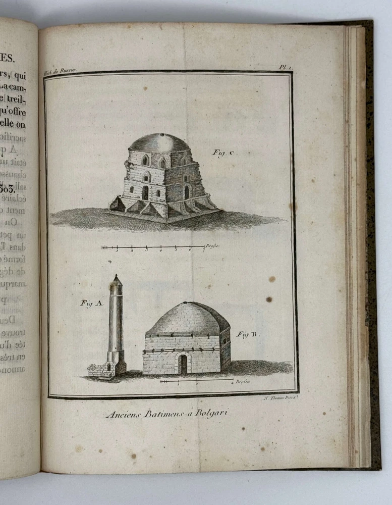 RUSSIA — ASIA Levesque, Pierre-Charles (1736-1812). Histoire de Russie [History of Russia]: Atlas Volume. Paris, Hamburg & Brunswick: l’Imprimerie de Guilleminet,Pierre-Francois Fauche, An VIII [1800]. Nouvelle Edition. Quarto (26 x 20 cm). 16 pp. With a folding engraved outline hand colored map and sixteen engraved plates (many folding). Handsome period brown gilt tooled quarter calf with red gilt lettered morocco labels and marbled boards. Occasional very mild foxing, otherwise a very good copy. Atlas to the third edition of Histoire de Russie (earlier editions were published without separate atlas). The folding map drawn by A. Brue shows European Russia and the Caucasus. The plates depict views, temples and buildings mostly of the region of Volga, Ural Mountains and Kirghiz steppes. Among them are the ruins of the ancient city of Bolghar and of the mysterious Buddhist monastery Ablaikit in vicinity of Ust-Kamenogorsk in modern Kazakhstan. Ablaikit was built by a Kalmyk khan in 1654-1656 and was destroyed in 1670. At the beginning of the 18th century there were still sculptures and pictures in the monastery’s temple. Manuscripts found there in 1720 were sent to Saint Petersburg. The plates include a general view, topographical plan and interior view of the temple of Ablaikit. Costumes of Kasimov Tatars, Samoyeds, Ostiaks, Mordvinians, Kalmyks, Tshouvach, Mongols and Kirghiz are also included. Pierre Charles Levesque was a French historian, philosopher and moralist, initially engraver. He lived in Russia for seven years working as a teacher in the Cadet Corps and the Imperial Academy of Arts in Saint Petersburg. His "Histoire de Russie" was recognized as the most significant research on Russian history written by a foreign scientist in the 18th century. It was widely popular in Russia before Nikolai Karamzin published his famous work, and kept its scientific significance until the end of the 19th century. Levesque was the first author who based his work mostly on Russian sources and historical works. For his achievements Levesque was accepted as a member of Académie des Inscriptions et Belles-letters (1789) and taught history in Collège de France (Nouvelle Biographie Générale, vol. 31, 38-39). #O46 ABOUT US Globus Books is an independent San Francisco-based bookshop and a member of the American Booksellers Association and the Antiquarian Booksellers Association of America and has been in business since 1971. Globus Rare Books and Archives is the department within Globus Books that specializes in rare travel and exploration related items from around the world with an emphasis on the Americas, the Pacific and Russian explorers and travellers. GUARANTEE All items are guaranteed to be as described. Purchases may be returned for any reason within ten days of receipt for a full refund or credit, but please notify us of any returns in advance. Returns should be adequately packed and insured. SHIPPING We offer free shipping worldwide on any purchases over 500 USD. All orders are properly packed with care and attention and shipped within 2-3 business days. FEEDBACK We leave feedback for buyers once they have left feedback for us. Please contact us immediately in the case of a rare problem and we will try our best to resolve any issues promptly. Customer satisfaction is very important to us. PAYMENT METHODS We accept Mastercard, Visa, Paypal, Venmo, bank transfers and $US checks.
