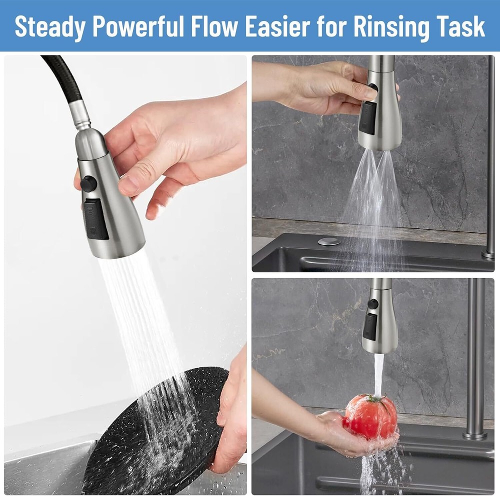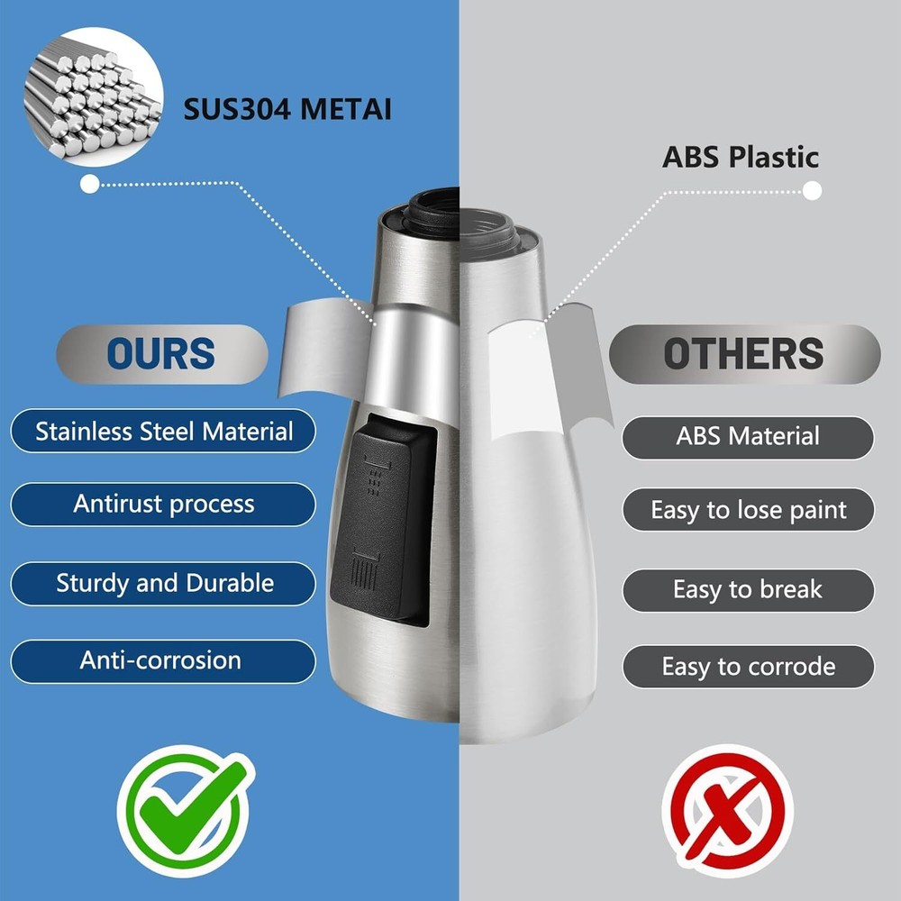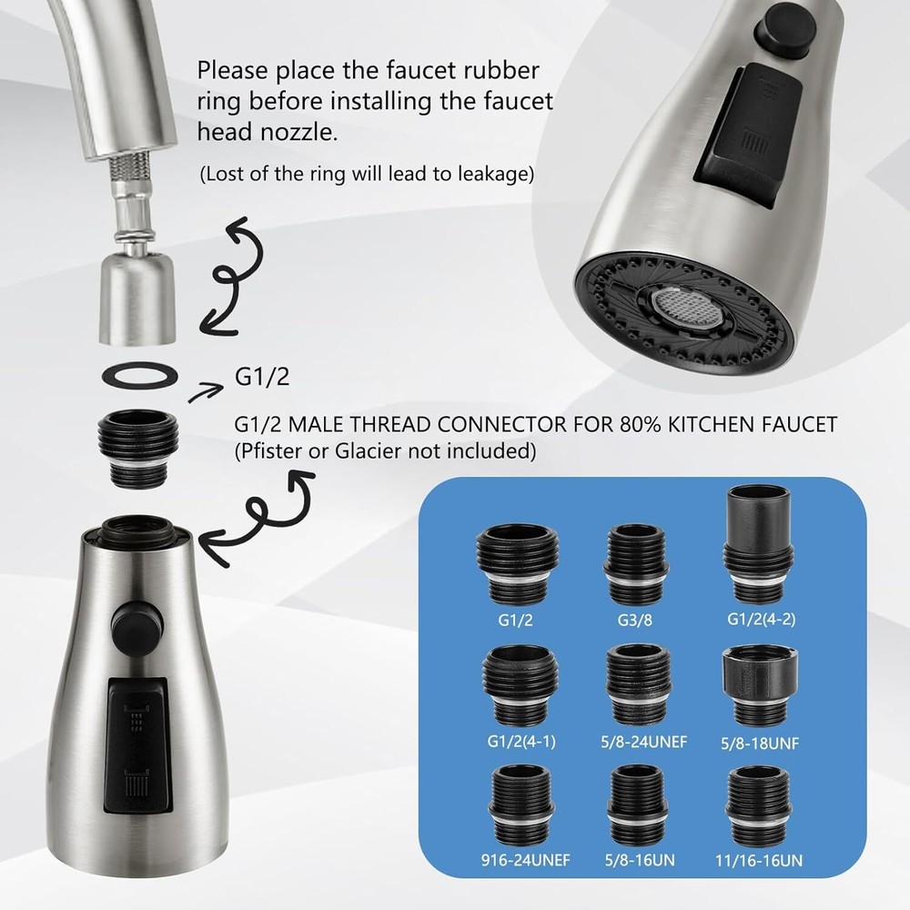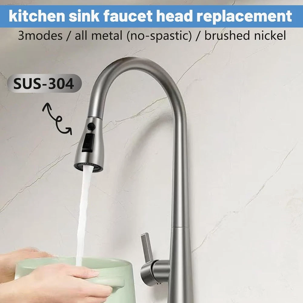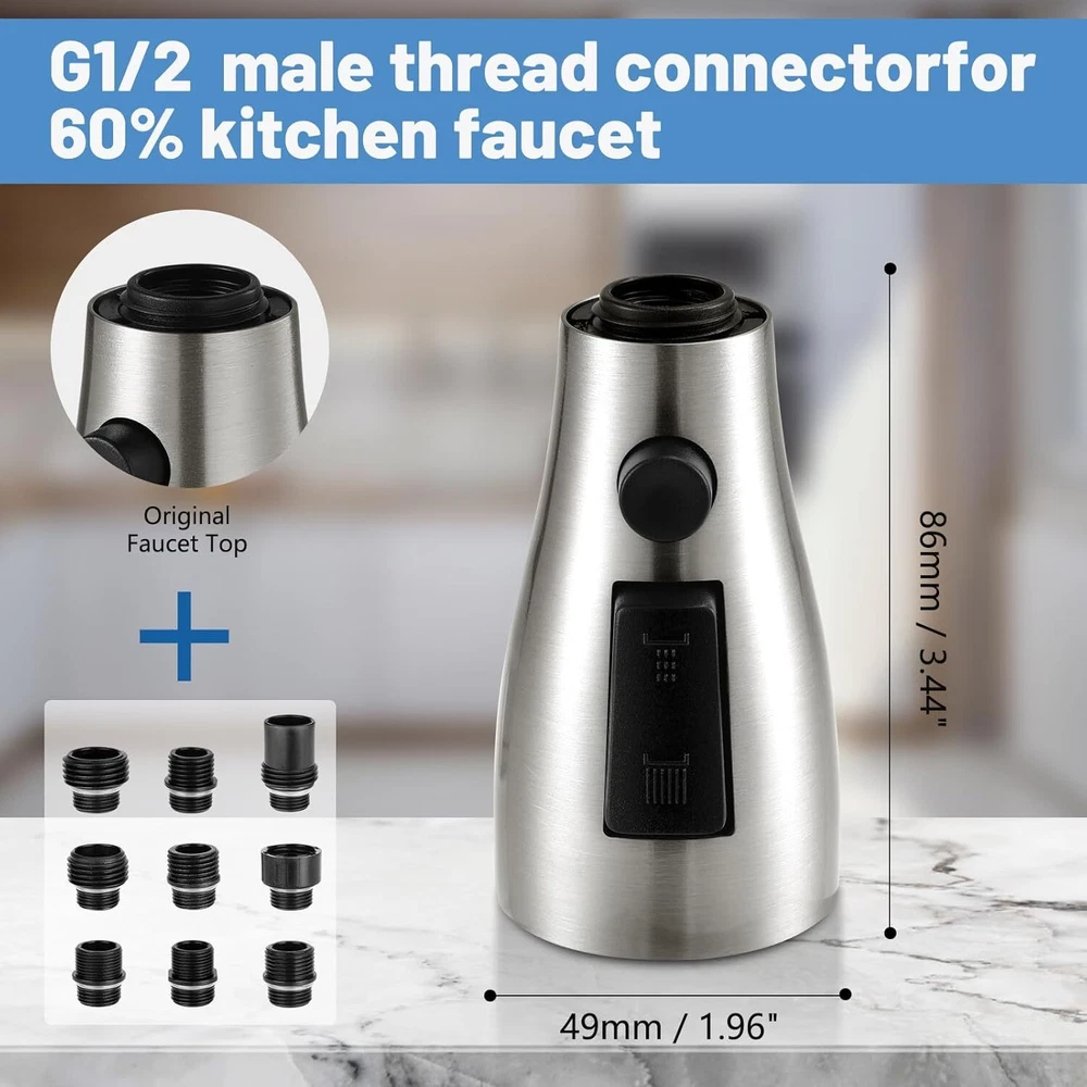 Free eBay listing template designed by dewiso.com Kitchen Faucet Head Replacement,Rust-proof, Fits All Pull Down Sink Faucets Metal Sprayers parts, with 10 Adapters, 3-Function Cleaning, Compatible with American Standard Brushed Nickel FREE AND FAST SHIPPING! About this item 【Non-rusting】Kitchen Faucet Replacement is made of 304 Stainless steel metal to prevent rust caused by daily use, with a long-lasting glossy appearance, compatible with Moen, Delta, Kohler, Hansgrohe and all kitchen faucet spray head attachments sold by Ebay for replacement, solves the problem of paint peeling off from the ABS shell. 【Leak Proof】Kitchen sink faucet sprayer uses a one-piece inner design that can withstand 1 MPa (10KG) water pressure, (conventional faucets can withstand up to 0.6 MPa water pressure) Our sink faucet sprayer has been tested 500,000 times with 1 MPa water pressure, solving 99% of the leakage problems of common kitchen pull down Kitchen faucets on the market. 【Compatible with all 3-hole kitchen faucet】This kitchen faucet head nozzle has 1 waterproof tape and 9 adapters, suitable for a variety of faucet replacement connections, compatible with 98% of the faucet hose, in line with the U.S. standards for kitchen faucet pull-down hose, which waterproof tape for to individual long-term use leading to fatigue of the interface or expand the interface problem, accessories to use: you can directly choose the model number Adapter “G2/1”. 【Installation Steps】3 steps to complete the installation of the faucet replacement parts,1.Unscrew the original faucet spray head and select the model number “G2/1” in the upper left corner of the accessory box to separate the adapter.2.Install the adapter on the new spray head.3.Screw the new faucet fittings back on.3.Screw the new faucet fittings back on. Avoid having to replace your entire kitchen faucet because of a broken sprayer, these kitchen faucet replacement parts are compatible with major brands and come with a variety of spray functions. 【Detachable Aerator, No Clogging】 Kitchen faucet nozzle is detachable and comes with a tool key for cleaning, ensuring smooth water flow and clean spout. Built-in honeycomb aerator filters out impurities, the water flow is soft and quiet, no splashing. The water flow is stable and powerful, meet your cleaning needs in various scenarios. › Product We offer a 30-Day Return Policy on items which you are not completely satisfied with. You have the option for a full-refund or an exchange of the item. No returns are available on items shipped outside of the US . Shipping We offer Free Shipping to the US and ship within 2 business days of payment, usually sooner. We use UPS express shipping. That's why your products are usually delivered within 3 days . Contact We try our very best to make sure every customer is completely satisfied. If there's a problem , message us! We're happy to help. 24/7 live chat available.