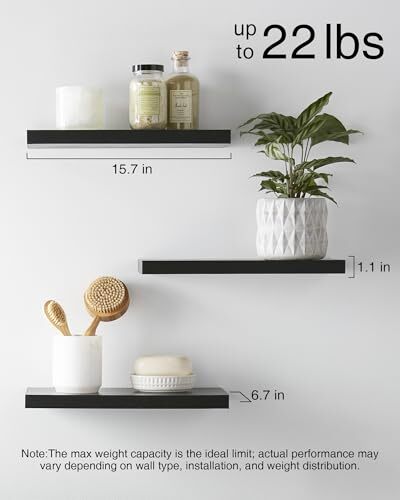 Finish Type: Matte EAN: Does Not Apply Manufacturer: Does Not Apply Product Dimensions: 6.7"D x 16"W x 1.1"H Brand: Does Not Apply Color: Black Item Width: 1 Recommended Uses For Product: Perfect for enhancing offices, bathrooms, kitchens, living rooms, Item Dimensions D x W x H: 6.7"D x 16"W x 1.1"H Weight Capacity: Maximum weight: 22 Pounds Age Range Description: no limit Style: Country Rustic Model Name: FSD3V105 Number of Items: 3 Furniture Finish: black Unit Count: 1.0 Count Room Type: Office, Bathroom, Kitchen, Bedroom, Living Room gtin13: Does Not Apply Built In Media: 3 metal brackets, 15 wall anchors, 15 big screws, 3 wooden boards MPN: Does Not Apply Additional Features: Wall mouted, hidden brackets, Easy to install, Bathroom organizer Back Style: Room decor,home decor Product Name: bedroom shelves,bedroom shelves for wall,, bathroom floating shel Weight Capacity Maximum: 22 Pounds Shape: Rectangular Mounting Type: Wall Mount Special Feature: Wall mouted, hidden brackets, Easy to install, Bathroom organizer Style Name: Country Rustic Type: Does Not Apply Shelf Thickness: 1.1 Inches Model: FSD3V105 Product Care Instructions: Avoid soaking rustic wood floating shelves with water. UPC: 810070842826 Required Assembly: Yes Item Weight: 5 Pounds Installation Method: Wall Mount Material Type: Engineered Wood Item Length: 1 Number of Shelves: 3 Specific Uses For Product: Versatile for Every Space Decor - offices, bathrooms, kitchens, l Finish Types: Matte Item Height: 1 Size: 16inches Shelf Type: Engineered Wood