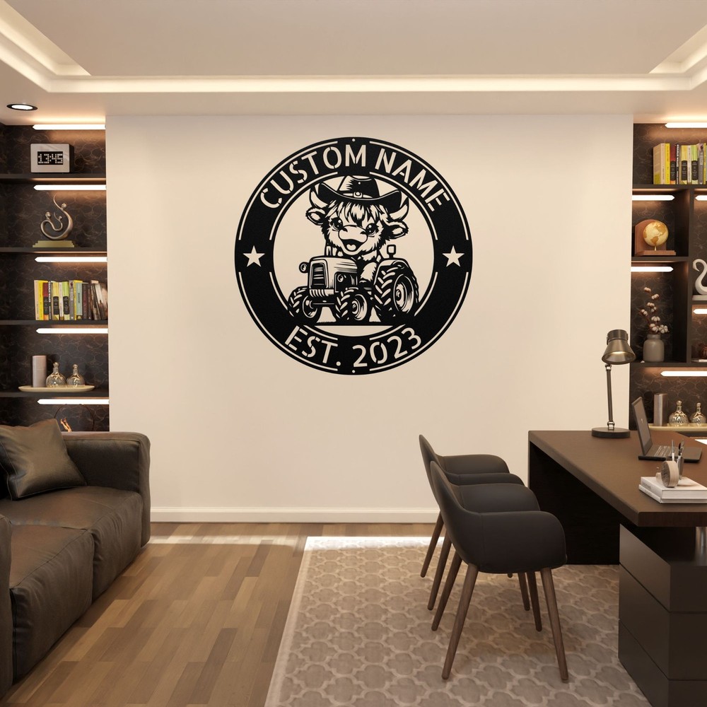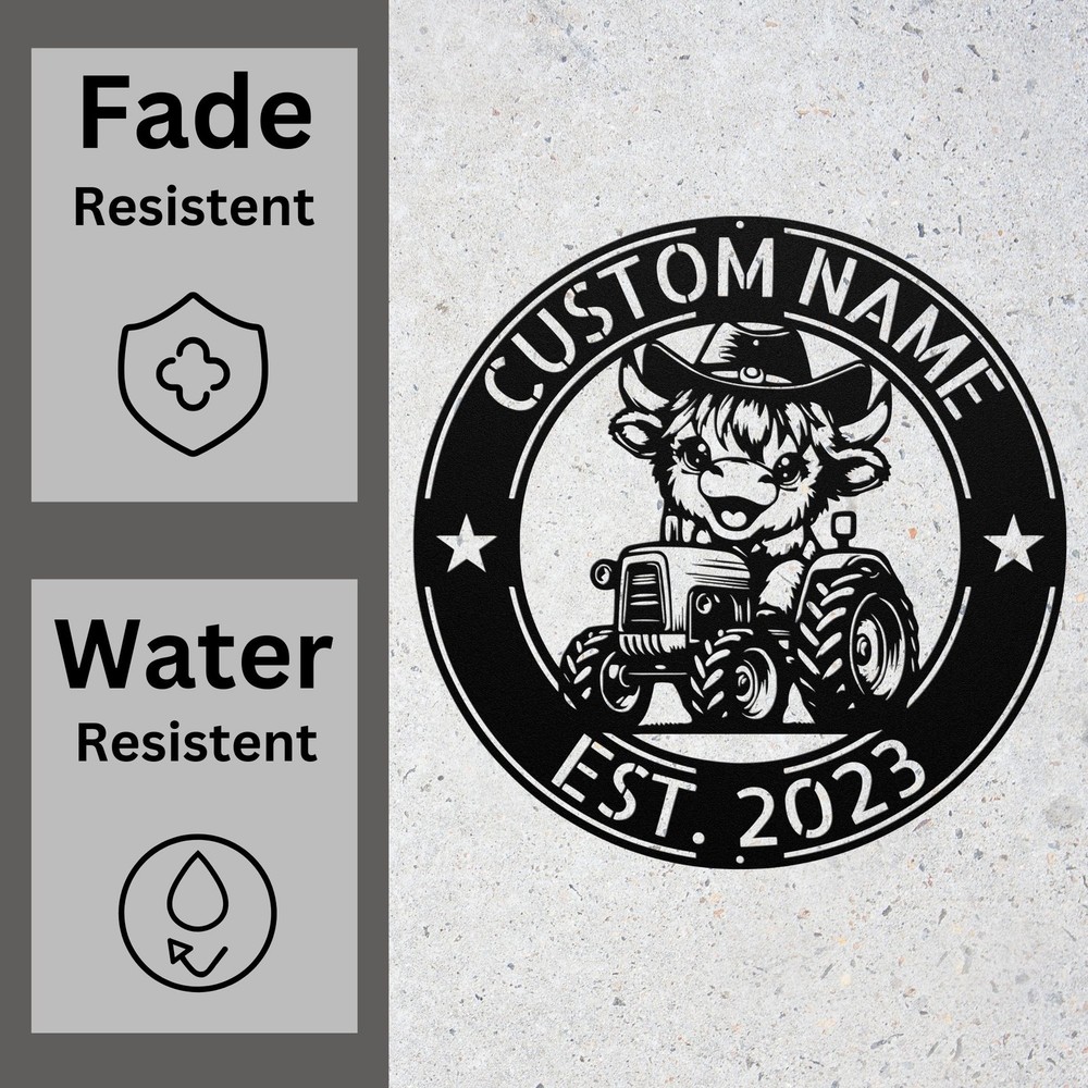 Product Description Custom Cow Tractor Metal Sign Farmhouse Decor for Barn Home or Ranch Rustic Gift Celebrate rustic charm with this Custom Cow Tractor Metal Sign , the perfect decor piece for any barn, home, or ranch. Made from premium 16-gauge laser-cut metal , this durable sign is finished with a weather-resistant powder coating , ensuring it stands the test of time indoors or outdoors. Personalize this unique farmhouse wall art with your name, special message, or custom text , creating a one-of-a-kind display that highlights your love for farming, cattle, and tractors. Its rustic design makes it a great centerpiece for any farmhouse, barn, living space, or porch . Looking for a thoughtful gift? This personalized cow tractor sign is an excellent choice for farmers, cattle lovers, tractor enthusiasts , and anyone who appreciates country living. Perfect for birthdays, Christmas, or special occasions , it’s a heartfelt way to celebrate the farming lifestyle. Key Features: Premium Quality: Made from sturdy 16-gauge laser-cut metal Long-Lasting Finish: Powder-coated to resist rust and fading Customizable Design: Add names or special messages for a personal touch Versatile Farmhouse Decor: Perfect for barns, ranches, homes, or porches Ideal Gift Idea: Great for farmers, ranchers, and tractor fans Order your Custom Cow Tractor Metal Sign today and bring a touch of personalized rustic charm to your space or surprise a loved one with a meaningful and unique gift! Service and Color Choice Our metal signs are designed to be personalized just for you, making them the perfect addition to any space! The default color for our signs is Black , but we also offer a variety of beautiful options including Copper, Gold, White, and Silver . After placing your order, simply contact us with your preferred color choice, and we'll ensure your sign is exactly how you envision it. Let’s create something special together!