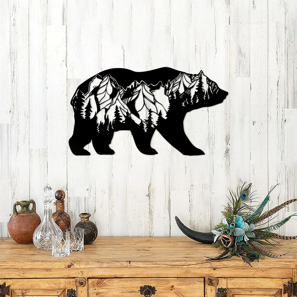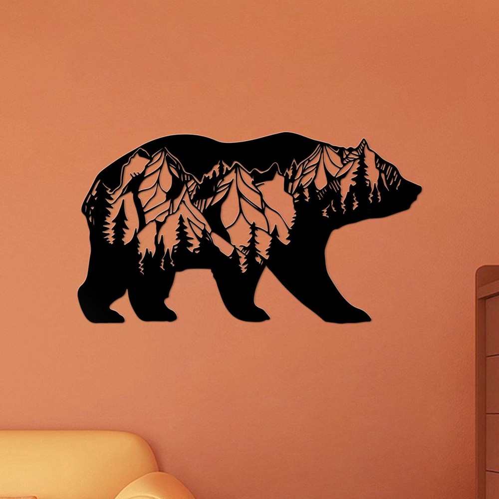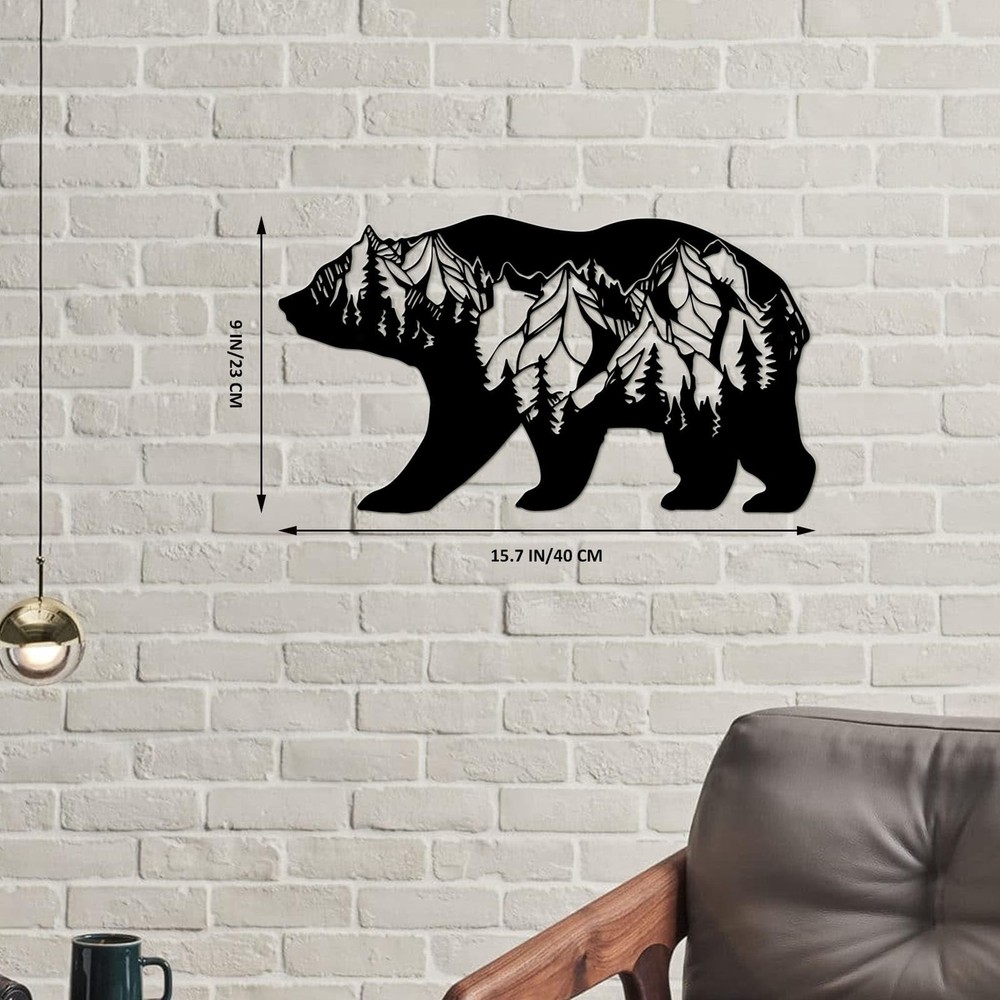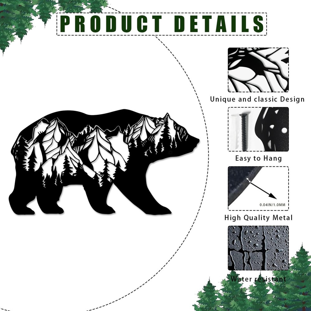 Metal Mountain Forest Bear Creative Wall Hanging Art Decor - Get Decorating Inspiration 1. The metal hollow cutting design makes the rustic art and the wall look like one, showing the color of the wall and highlighting the flexibility of the product. 2. From home to your office, this unique wild bear art will fit in anywhere you put it. 3. The product is light and flexible, and the overall vision after decoration is also beautiful. 4. Whether you are going for a rustic cabin, bohemian palace, or nautical lake house, or even a this peak and pine tree bear art fits right in. Its universal design makes it incredibly versatile. Specifications Color: Black, Black Material: Powder Coated & Steel Type: Hanging Decoration Package Included: 1 Piece Set Bear Art & Mounting Screws Notice: * Due to the different lighting environment, the color of the product may be slightly different from pictures. * Please allow 1-3% size difference according, due to the manual measurement. Please make sure you do not mind before you bid. Exquisite Design:The metal bear wall art have a unique design and precision cutting process, you can see different micro landscapes on the bears, like mountains, forests, starry skies and moons, which can add a sense of design to your space! Size:The cabin peak and pine tree metal bear wall sculptures is 15.7''Wx9''H,very good for your bedroom,kitchen, livingroom,hallway,garden,and entrance decoration. Good Quality:Our metal rustic forest wall decor use metal cutting process, the product has smooth edges and outstanding details, which can be used for a long time. Easy To Hanging:This metal bear wilderness wall arts are designed with holes for easy hanging, no assembly required, you can hang it in seconds indoor and outdoor. Best Gift Choice:The bear wall decoration shows the buyer's unique aesthetics.It's a best gift choice for housewarming, birthday gift, Thanksgiving, Christmas, Halloween and daily surprise.