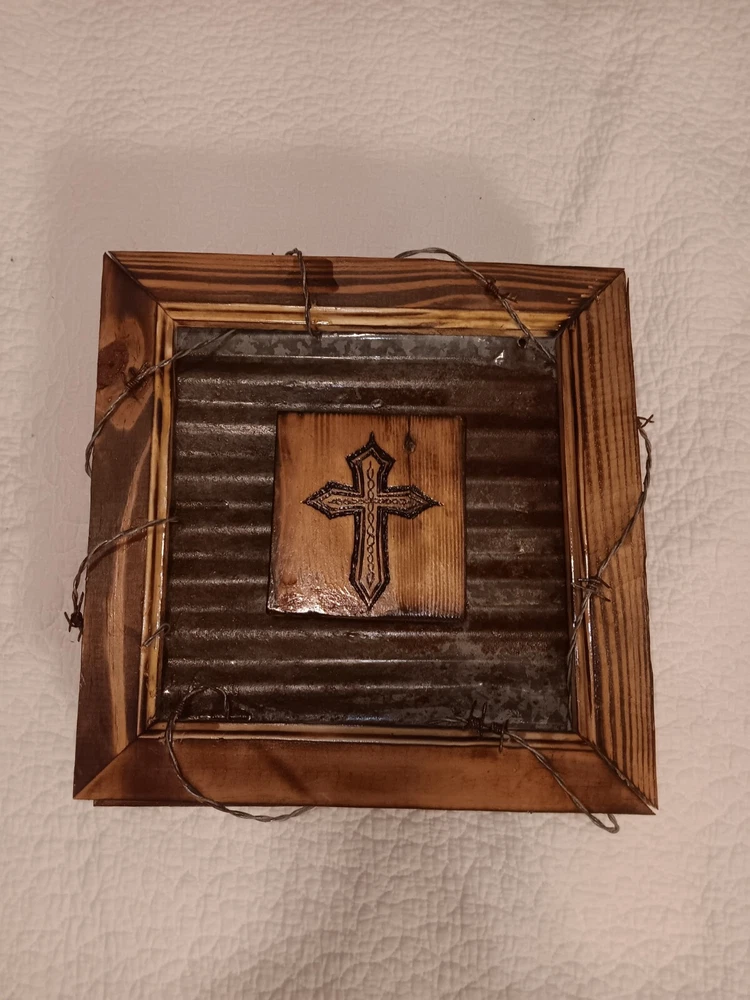 Enhance your living space with this exquisite handmade plaque featuring a rustic and primitive style. The plaque is made of high-quality wood with a metallic finish that gives it a unique and elegant look. It is adorned with a cross design that adds a touch of Christian symbolism to your home decor. This decorative piece is perfect for any room in your home, whether it's your living room, bedroom, or bathroom. It is ready to hang and features a framed design that makes it easy to display. The plaque's corrugated metal and wood burned features add to its rustic charm, making it the perfect addition to any home.