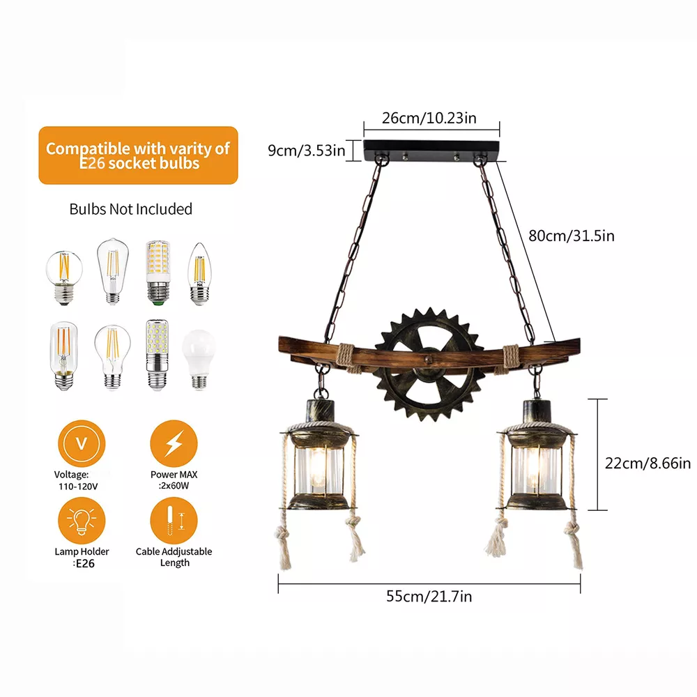 Retro Pendant Light Industrial Loft Bar Hanging Light Creative Personality Wood and Metal Living Room Pendant Lamp Height Adjustable Industrial Hanging Lamp for Dining Room Living Room (Two heads) Features: 1.The unique gear design gives you a completely new visual experience. The combination of solid wood and iron, antioxidant and anti-corrosion. Place different lightbulbs as needed. Create a retro and romantic atmosphere. Not just lighting, but also decorating your home. 2.The lamp works well when used with incandescent or LED bulbs with standard E26 bases.Please note: incandescent bulbs are not included. 3.Suitable for rooms: living room, dining room, bedroom, kitchen, dining room, hall, balcony, bar, cafe, warehouse, country house, study, basement and other indoor lighting. Rustic Wood Chandelier Farmhouse Loft Retro Pendant Light Ceiling Fixture Lamp Retro Pendant Light Industrial Loft Bar Hanging Light Creative Personality Wood and Metal Living Room Pendant Lamp Height Adjustable Industrial Hanging Lamp for Dining Room Living Room (Two heads) Features: 1. The unique gear design gives you a completely new visual experience. The combination of solid wood and iron, antioxidant and anti-corrosion. Place different lightbulbs as needed. Create a retro and romantic atmosphere. Not just lighting, but also decorating your home. 2.The lamp works well when used with incandescent or LED bulbs with standard E26 bases.Please note: incandescent bulbs are not included. 3.Suitable for rooms: living room, dining room, bedroom, kitchen, dining room, hall, balcony, bar, cafe, warehouse, country house, study, basement and other indoor lighting. Specifications Category:Chandeliers Usage:Indoor Lighting,Outdoor Lighting,Hallway Shade Shape:Cylinder Dimensions/Fixture Width:21" (55 cm) Bulb Type:LED/Incandescent/Flourescent Bulb Base:E26 Number Of Lights:2 Lights Wattage Per Bulb:28-60W Shade Material:Glass Shade Color:Clear Glass Treatment:Clear Number Of Bulbs:2 Fixture Height(including Chain):39" (100 cm) NOTE: Bulb Not Included Package: 1* ceiling light Payment Delivery details Terms of sales About us Contact us Payment We accept ebay payment 。 Fees such as import duties, taxes are not included in the item price or shipping costs. These charges are the buyer's responsibility. Delivery details Shipping: 2-9 working days to: USA Terms of sales We maintain high standards of excellence and strive for hundred percent customer satisfaction. Feedback is very important to us. We hope that you contact us immediately before you give neutral or negative feedback, so that we can address your concerns. It is impossible to address issues if we do not know about them! About us Your satis faction is our ultimate goal. We work hard to earn your trust and future business. Our certified technicians have tested each item before shipping. The unit comes with 1 year limited warranty on all manufacturing defects. a) If you receive a defective item, you may return it or ask for a discount. Please contact us within 14 days after you receive the package. b) What you returned must be intact and in its original packaging as re? u. Customer is responsible for shipping costs of the returned item. c) We will cover the cost of shipping back t with the shipping rate indicated in the registration page. We will send you a new unit or refund the full payment you paid. Thank you. Contact us Business Hour Business Hour: Monday To Friday: 8:30 AM to 5:00 PM (Beijing China time) Due to time zones, our reply to your questions may not be immediately. But within above working time, we will reply your email within 24 hours. If it's non-workdays, please kindly be patient and wait till Monday. Please contact us with ebay message. Please feel free to contact us if you have any questions. Monday To Friday: 8:30 AM to 5:00 PM (Beijing China time) Due to time zones, our reply to your questions may not be immediately. But within above working time, we will reply your email within 24 hours. If it's non-workdays, please kindly be patient and wait till Monday. Please contact us with ebay message. Please feel free to contact us if you have any questions. On Jan 2, 2025 at 18:45:10 PST, seller added the following information: