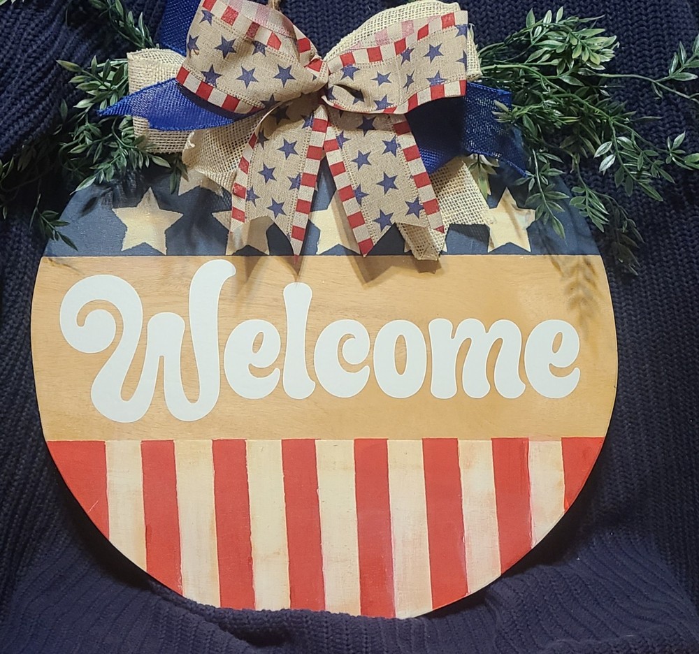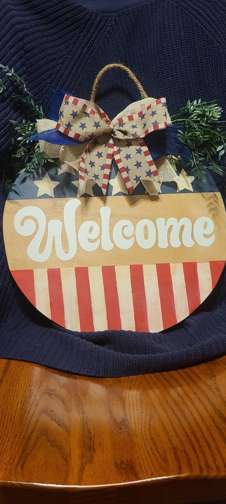 This handcrafted wood door wreath is a patriotic-themed decoration perfect for all occasions. The red artificial wreath hanger is made from wood, adding a touch of natural charm to your home decor. Display this wreath on your front door to show off your patriotic spirit and add a festive touch to your seasonal display.