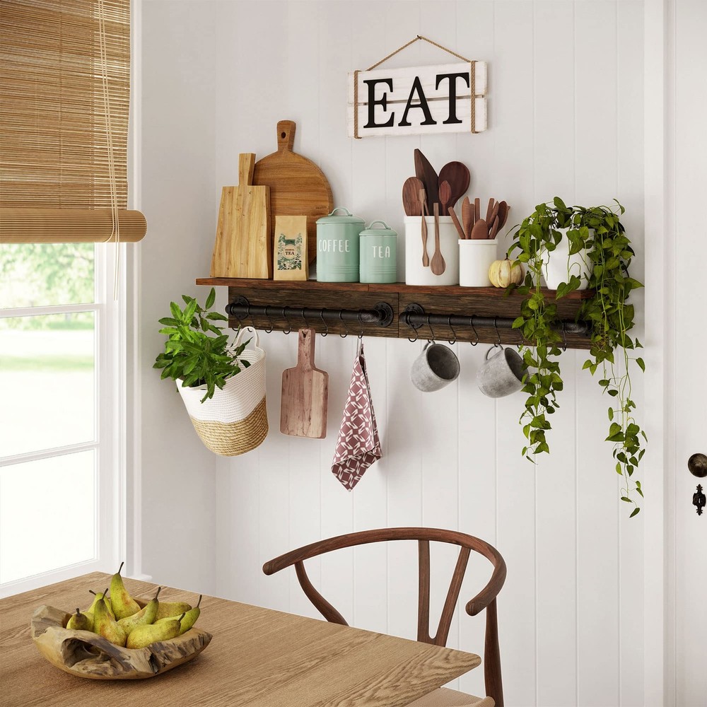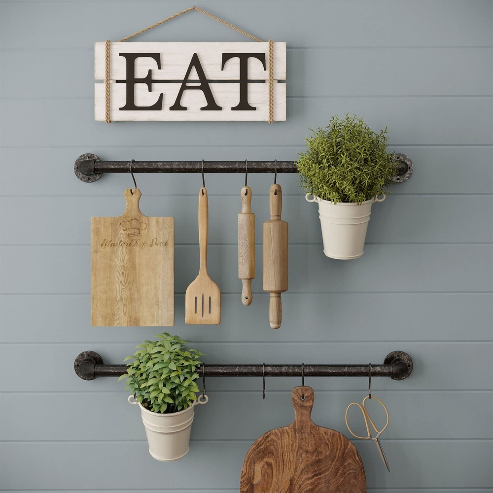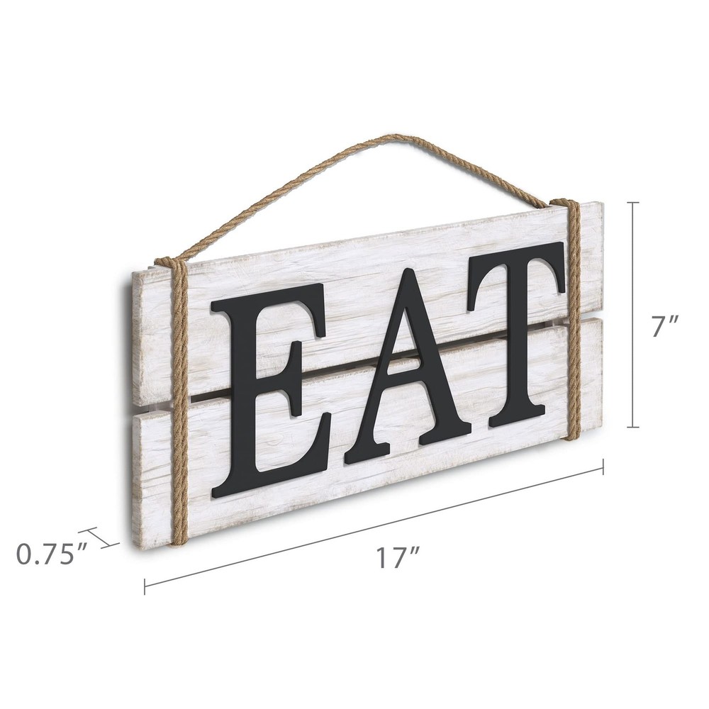 Eat Wood Plaque: Welcome people into your kitchen or dining space with this wood wall sign. This lovely wall sign will be a daily reminder to eat and be merry. This wooden EAT sign complemented with a hanging rope makes this wall decoration so easy to mount. A shabby chic home decor item that will add a bit of that primitive, farmhouse look you're going for! It is the perfect farmhouse kitchen decoration to complement the country decor theme you have in mind. This sign can be used in your home, apartment, cafe or any dining space where food is served. The vintage look will add a warm and cozy touch to your dining space. The distressed black and white decoration makes an ideal rustic wall decor accent for any kitchen or dining room. This beautiful, barn style sign will surely make mealtimes special. Use it at your next family gathering; it will definitely add a cheerful look! Features: ”EAT” Wood Wall Sign. Wall Hanging. Wood and Rope. Black and White. Dimensions: 17" x 7" x 0.75”. Eat sign - Welcome people into your kitchen or dining room with this wood wall sign. A cute reminder to eat and be merry. Kitchen decor that makes a beautiful adornment. Farmhouse wall decor - This wall art sign is the perfect piece to complement the country kitchen theme you have in mind with it’s white distressed finish and natural rope details. Ready to hang - Ready with a hanging rope string that makes this wall decoration so easy to mount. A shabby chic home decor item for a primitive style. Kitchen wall decor - Ideal decoration for any kitchen or dining room. Use it at your next family gathering, it will definitely add a cheerful look. Dimensions - This rustic wooden wall sign measures 17" x 7" x 0.75”.
