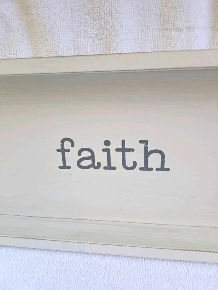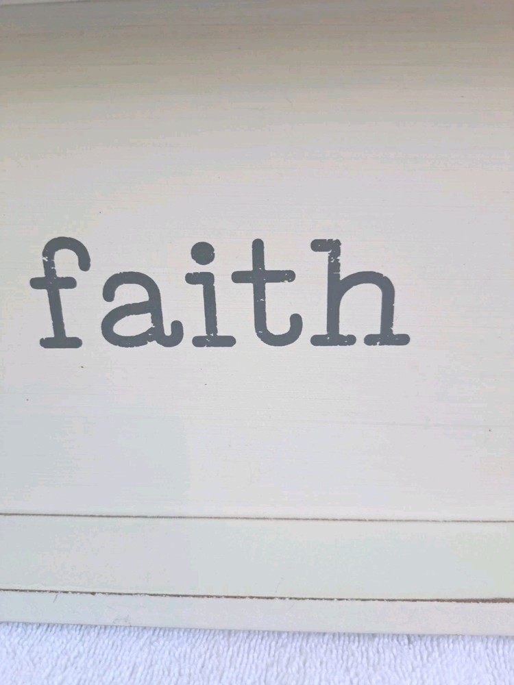 A piece of my Personal home decor that I have hung in various rooms at various times. I have also used it as a dresser tray to hold candles and a vase of dried flowers. This wooden farmhouse rustic decor wall plaque box tray by Quill to Paper features a rectangle shape and a cream and grey color scheme, perfect for a living room or any room in the home. The plaque, measuring 15.75 inches in length and 7 inches in height, is made of wood with a farmhouse rustic finish. It is designed with the subject of "FAITH " and is decorated with a theme of believing , making it a charming and inspirational addition to your decor. The hanging plaque is a beautiful and meaningful piece that adds a touch of rustic elegance to your home. The word faith is actually gray in color.