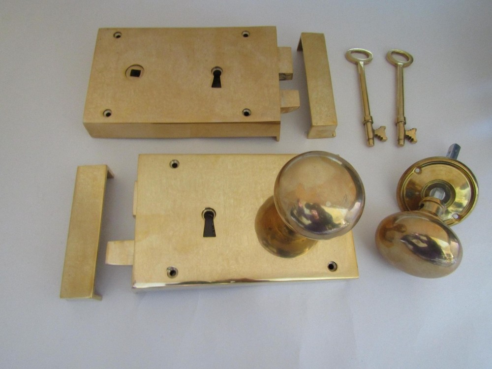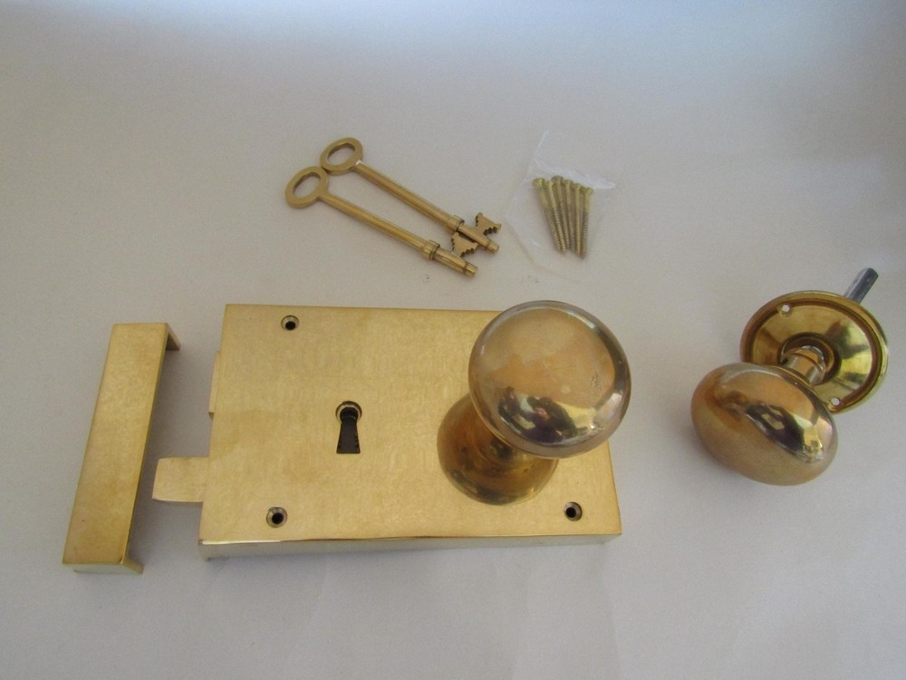 Solid Brass rim lock and polished brass rim knob set Designed for internal usage Lock finish :Unlacquered polished brass-will develop own patina with time Knobs finish: Unlacquered polished brass-will develop own patina with time Faithful reproduction using original designs. Found in locations varying from Cottages to Stately homes, they are versatile and looks stunning. The lock/latch and knob is solid brass unlacquered This means that each lock is unique in its texture and appearance, and will continue to acquire it's own unique patina over the years. LOCK RIM LOCK BODY WIDTH 175MM HEIGHT 102MM PROJECTION 25MM KEEP WIDTH 25MM HEIGHT 102MM PROJECTION 25MM DISTANCE FROM THE KEYHOLE TO THE EDGE OF LOCK 60MM DISTANCE FROM THE LOCK EDGE TO SPINDLE HOLE 135MM KEY 120 X 30MM RIM KNOB KNOB DIAMETER: 65mm SPINDLE THICKNESS: 7mm SPINDLE LENGTH 125MM ADJUSTABLE (MINIMUM 70MM MAXIMUM 115MM) ROSE DIAMETER: 65 Depth 50mm