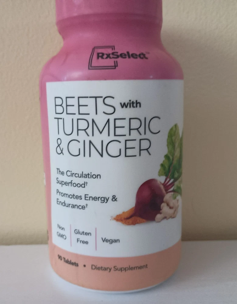 Rx Select ® Beets w/ Turmeric & Ginger Energy & Endurance 90 Tablets by Rx Select ® • Clinically Proven Turmeric & Ginger for Bone, Joint and Skin Health • Helps Aid Digestion • Healthy Inflammatory Response • Antioxidant Support • Promotes Energy and Endurance • Supports Cardiovascular Health • Activates Essential Nitric Oxide Product Details - Supports Cardiovascular Health, Activates Essential Nitric Oxide, Antioxidant Support, Healthy Inflammatory Response, Boost Immune System - Non-GMO, Sugar-free, Gluten-free, No Artificial Coloring, Dairy-free, No Artificial Sweetener, Sodium-free, Wheat-free, Fish-free, Yeast-free, Soy-free - Size: 90 Tablets per Bottle (180 Total) - Made in USA from Globally Sourced Ingredients Directions: Take 1 tablet with a meal as a dietary supplement.