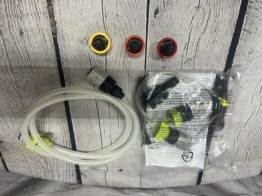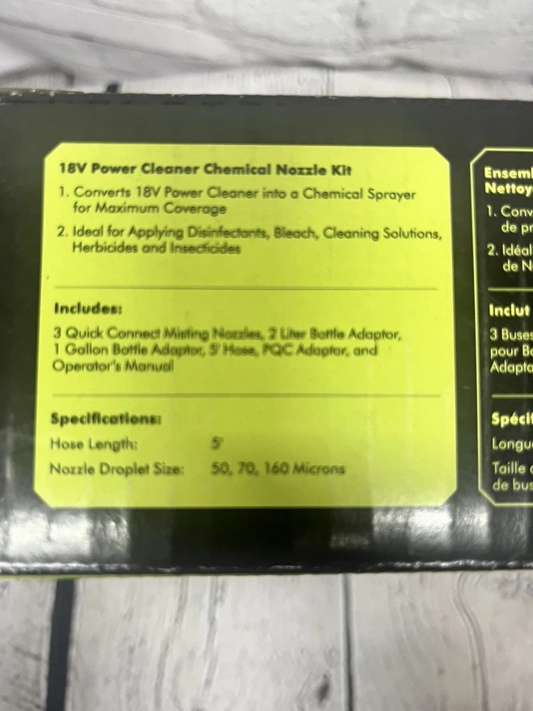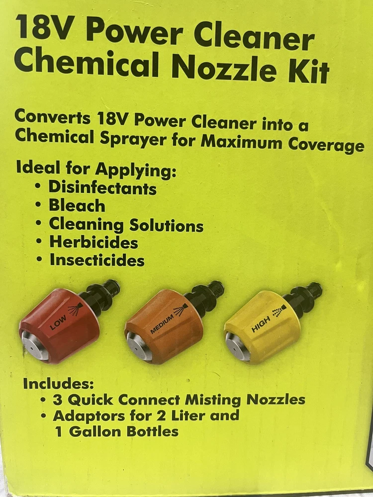 The Chemical Nozzle Kit is ideal for applying disinfectant, bleach, cleaning solutions, herbicides and insecticides for ultimate versatility and maximum coverage. Easily attach 1 of the 3 quick-connect nozzles to the RYOBI Power Cleaner to create low, medium and high coverage mist. Includes: 3 quick-connect nozzles (low, medium and high), 2 l and 1 Gal. bottle adaptors 5 ft. hose and quick connect adaptor Nozzle droplet size: 50 mic, 70 mic, 160 mic Bin 3 PA