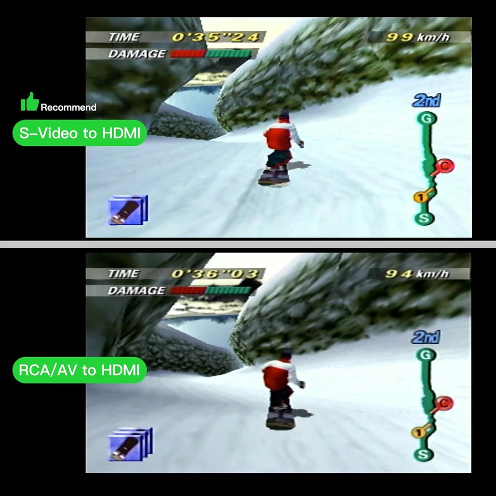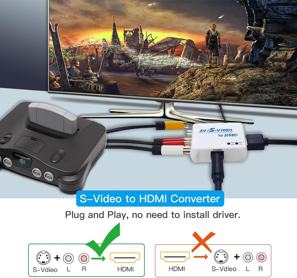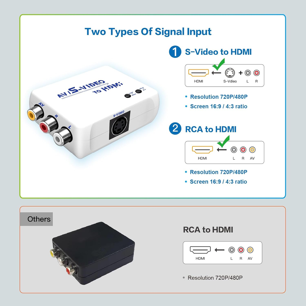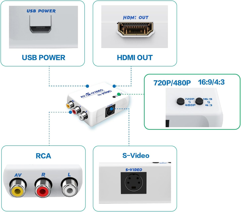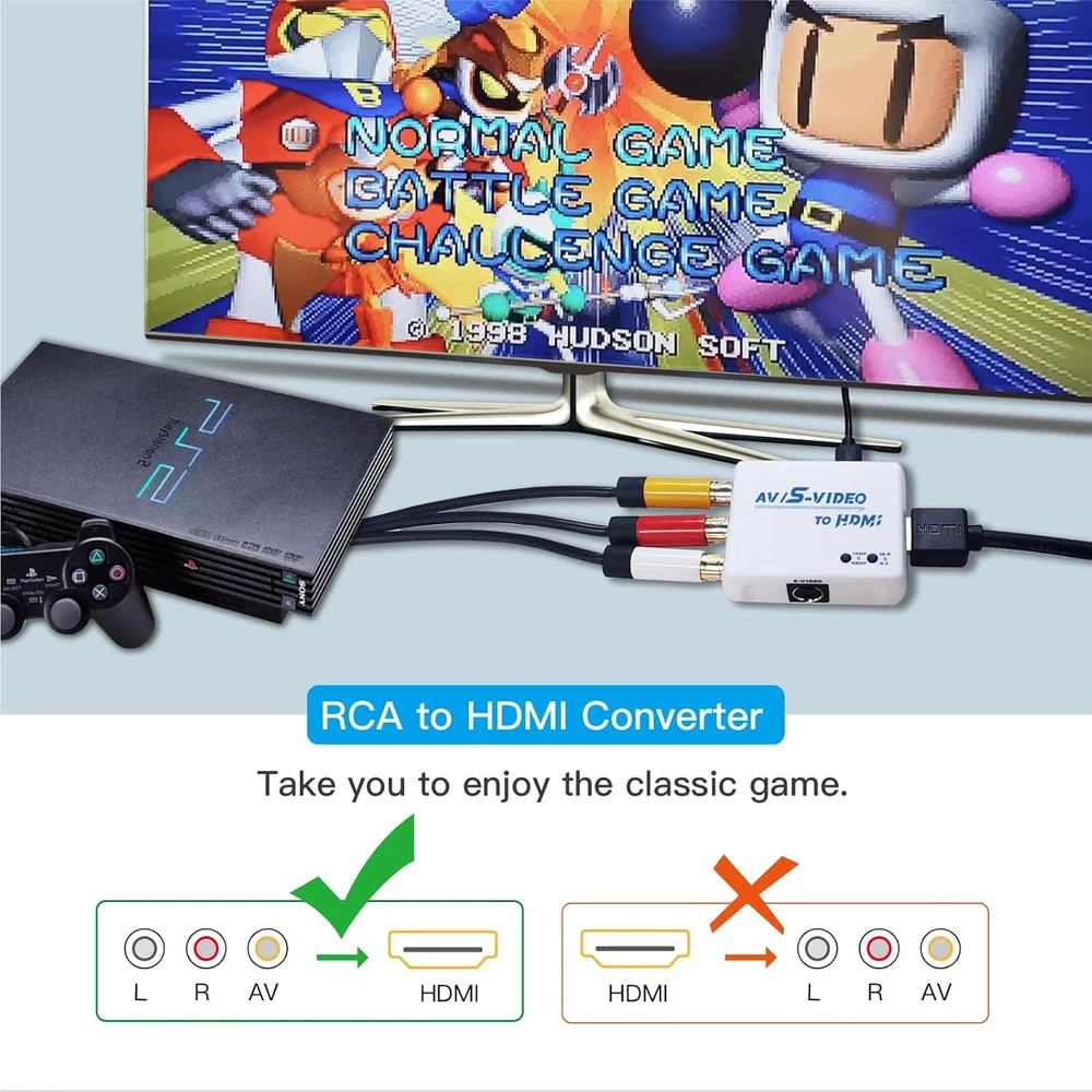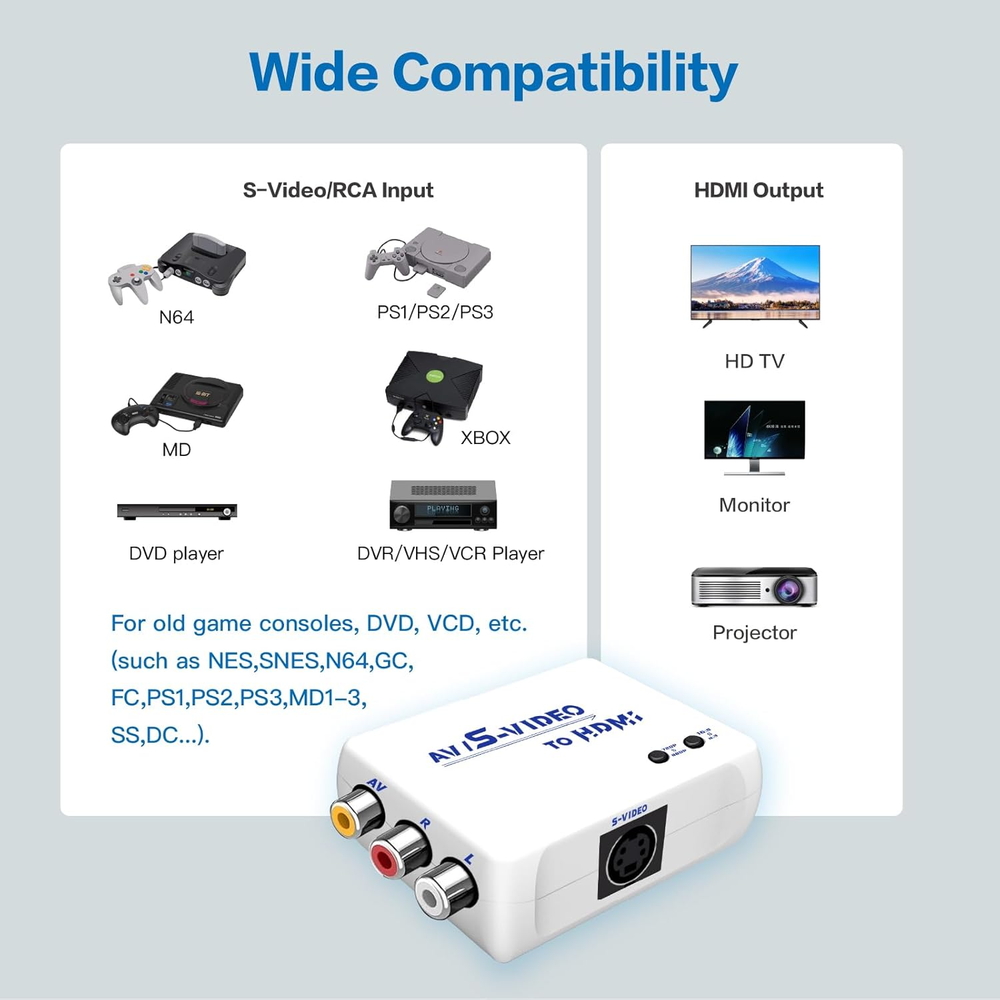 【S Video to HDMI Converter】Video processing by the S video signal source output, HDMI resolution 720P/480P or screen 16:9/4:3 ratio,display in HDTV/monitor, clear picture is so simple! 【RCA to HDMI Converter】Converts analog RCA composite (Yellow,White,Red)Output HDMI resolution 720P/480P or Screen 16:9/4:3 ratio to display on HDTV/Monitor. Transfer the picture from your old device to HDTV and evoke your childhood memories. 【Plug and Play】Plug and play, easy to operate, no need to install driver, low latency, clear and stable picture, no lag in playing games. 【Wide Compatibility】Supports many old game machines, (such as NES,SNES, N64, GC,FC,PS1,PS2,PS3,MD1-3,SS,DC…), XBOX,VHS,DVD, VCD, etc. 【Attention & Package】Please ensure to connect this AV/Svdieo to hdmi converter to power source to make it work. Package include: AV/S-Video to HDMI Converter*1, usb power cable(adapter not included)*1, Quick start guide*1 Product Description WNNZVCC RCA SVideo to HDMI Converter WNNZVCC RCA SVideo to HDMI Converter If you want to use your classic old games,DVD, VCR, VHS.S video/RCA output to connect to your new HDTV or HDMI only monitor, this RCA/S Video to HDMI converter is what you need. It converts the S Video/RCA(AV, composite, CVBS) signal into an HDMI signal, so your old device can play on a digital TV with an HDMI port. Add more possibility to your devices. It can bring back memories of happy times and relive your childhood in seconds, and it's also the right choice for those who still enjoy playing the old gaming system. Features: S Video to HDMI RCA to HDMI Support resolution 720P/480P Suppor Screen 16:9/4:3 ratio switching. Easy to operate, plug and play, no need to install driver. Supports many old game machines, XBOX,VHS,DVD, VCD, etc. (such as NES,SNES, N64, GC,FC,PS1,PS2,PS3,MD1-3,SS,DC…). Support PAL, NTSC3.58, NTSC4.43, SECAM, PAL/M, PAL/N standard TV formats input. Two Signal Inputs are Optional S Video to HDMI AV to HDMI NOTE: Since RCA/Svideo are sharing the same R/L audio inputs, if you want to use Svideo as the input signal, you must connect R/L audio, otherwise there will be no sound. Smart Button Support resolution 720P/480P . Suppor Screen 16:9/4:3 ratio switching. Support PAL, NTSC3.58, NTSC4.43, SECAM, PLA/M PAL/N standard TV formats input. Plug & Play Easy to operate, plug and play, no need to install driver. No need to install driver,low latency,clear and stable picture,no lag in playing games. High quality CPU Ensure video quality and transfer speed, improve resolution cleverly. Advanced internal chips ensure functionality and security, thereby increasing the durability of RCA S Video to HDMI converters. Mini Design Compact design, no footprint, and light enough to hang on an HDMI cable. USB Power Supply Please plug the power cord (included) to USB port with 5V power source when using the AV/S Video to HDMI Adaptor. It is easy to set, no need to install drivers, portable, flexible, plug and play