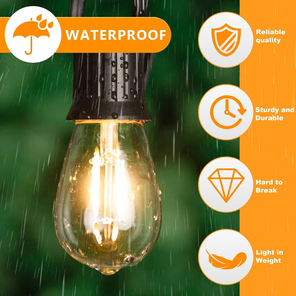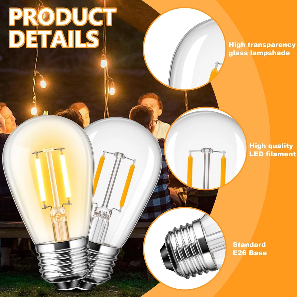 Product Specification: Watts:1.5W (Replace 15W Incandescent Lamp) Dimmable: No-Dimmable Lumen:150lm Color:2700K (Soft White) Beam Angle:360 Degree CRI:80+Ra Voltage:AC 110V-130V Base Type: E26 Medium Screw Base Package: 15 Packs of S14 LED Bulbs Application Commercial Use: Hotel, cafe, commercial buildings supermacket theaters shop-window and artwork lighting. Home Use: Bathroom, bedroom, Kitchen, living room, dining room and dressing room lighing, wall lamps, table lamps and vanity lighting. Outdoor Lighting: The globe replacement light bulb is ideal for outdoor string light. It is perfect for your garden, patio, deck, pergola and outdoor space. Warm tips--These S14 1.5 watt led bulb couldn't work with Solar String Light and other low volatage string light bulbs. 【Energy Efficient & Money Saving】Equipped with energy-efficient LED Filament, these S14 LED Bulbs will reduce heat output and save over 90% on the electricity bill of lighting, which makes it an economical alternative to 10W-15W incandescent or halogen string light bulbs. 【High CRI 80+ & Stable Output】Features high CRI 80+, bring out a vivid and natural color, providing you with a better visual enjoyment. And the high quality of light output will also remain stable throughout the lifetime. It means that the soft warm light bulb will create welcoming and comfortable light for your home. 【Super warm & No Delay】Designed with the latest LED source technology, this outdoor LED light bulb has a output of up to 100 lumens. It will emit full brightness at soft white 2700k with 360-degree light. No delay and no dark space, widely used for such as string lights in backyard, patios, outdoor, indoors bars,garden or other decoration light fixtures. 【Easy To Install & Wide Application】15 Pack LED String Light Bulbs Replacements with E26 screw bases can be easily screwed into the light fixtures directly, optimal choice for outdoor decoration like patio, porch,garden,festoon,camp,party and etc.
