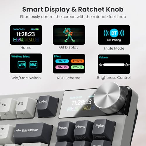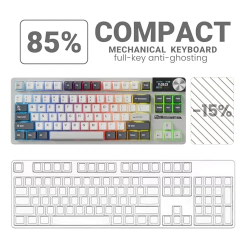 Return Policy Fast Delivery Trusted seller S85 Wireless Mechanical Keyboard, TKL Keyboard with Display & Ratchet Knob, Triple-Mode Bluetooth/2.4GHz/USB-C, Custom Linear Silent Switches, 7200mAh Battery, Hot Swappable, 85 Keys Product Description The S85 mechanical keyboard features a TFT display paired with an aluminum ratchet knob, delivering precise control and smooth, responsive adjustments. Effortlessly toggle through multiple settings with enhanced precision, giving you full control over your workflow or gaming experience. Equipped with pre-lubricated custom linear switches, the S85 offers a buttery-smooth typing experience with a shortened trigger distance for lightning-fast responses. Whether deep into a gaming session or focused on work, this wireless gaming keyboard ensures every keystroke is fluid and precise. Enjoy extended play and work with the S85's 7200mAh battery. Get up to 41 hours of continuous use with RGB lighting, or power through 240 hours without it. This portable mechanical keyboard allows you to game or work wirelessly, without worrying about constant recharging. Say goodbye to fading and worn-out keys! The mechanical keyboard comes with premium double-shot PBT keycaps that offer a comfortable typing experience while standing the test of time. Enjoy a buttery-smooth feel that never wears down, perfect for long gaming sessions. Achieve ultimate gaming performance with anti-ghosting capabilities. All 85 keys are conflict-free full n-key rollover, ensuring every command registers without fail. Paired with a high-speed USB data cable, this keyboard delivers reliable and responsive performance in any gaming scenario. Switch between devices effortlessly with 3 Bluetooth channels, 2.4GHz wireless USB, and Type-C wired connectivity. This versatile mechanical keyboard wireless supports up to 5 devices simultaneously, making it perfect for multitasking across Windows and Mac systems. Enjoy crystal-clear feedback with reduced noise, thanks to the IXPE switch damping pads, dual-layer latex sound-absorbing cotton, and silicone damping pads. The wireless mechanical keyboard eliminates 80% of hollow sounds and reduces noise by 40%, giving you a silent, distraction-free typing experience. Shipping Returns Payment Shipping Shipping is FREE to all addresses other than APO/PO boxes in the lower 48 states. All our stock ships from US-based warehouses. Shipped via USPS or UPS (depending on location and package weight) Unless stated otherwise, all orders will ship within 24-72 hours of your payment being processed. Check our feedback to see the great reviews of FAST shipping we offer. Returns Seller does not accept returns Payment We currently accept payment via eBay managed payments only. Once payment is cleared, we will dispatch your shipment within 1-3 business days. Please refer to the "Shipping" tab for more information regarding shipping speed to your destination.