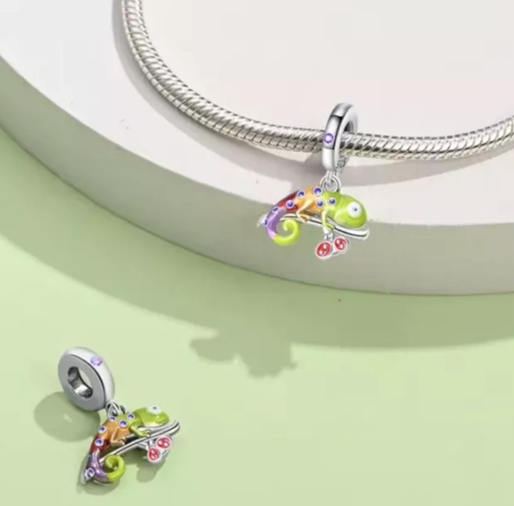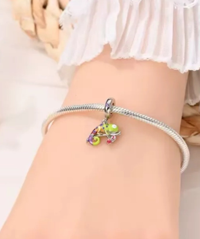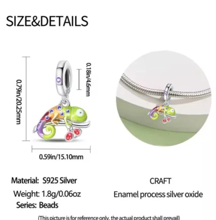 Please note the color for the charm are a bit darker that the picture This Chameleon Charm Bead is crafted from S925 Sterling Silver and features an intricate design of a green chameleon. The charm is shaped like a moon and slides onto a bracelet, making it a perfect addition for occasions like Engagement, Mother's Day, Christmas, Wedding, Anniversary, Birthday, or Valentine's Day. Ideal for Pandora Moments bracelets, this charm is a thoughtful gift for Mum, Nan, Sister, Daughter, Wife, Girlfriend, Best Friend, or any woman who loves unique and stylish jewellery.