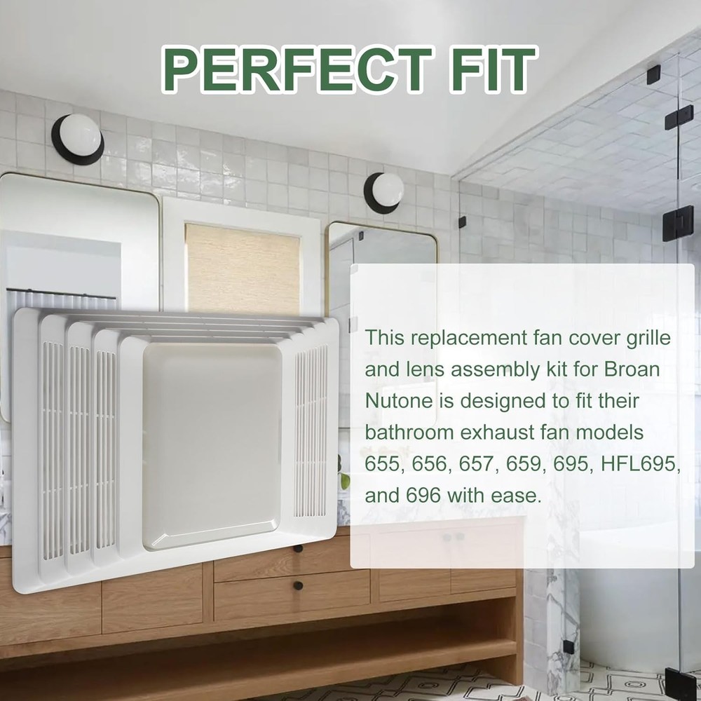 S97013662 Bathroom Fan Cover Grille and Lens Assembly Kit Fits For white Description Features: Perfect Fit: This replacement fan cover grille and lens assembly kit for Broan Nutone is designed to fit their bathroom exhaust fan models 655, 656, 657, 659, 695, HFL695, and 696 with ease. Newly Bathroom Exhaust Fan Cover : Elevate your bathroom experience with our new fan cover lens and say goodbye to yellowed, dull, and broken old bathroom exhaust fan cover. Improved Airflow: The new cover grille and lens assembly can help improve the airflow and functionality of the bathroom fan, ensuring efficient ventilation. And Easy to install. Bathroom Fan Cover Dimensions: Overall Dimensions 16-7/8 inch x 11-3/4 inch. Lens Opening Dimensions: 7-1/16 inch x 8-1/16 inch. Color: White. Durable Construction: The grille and lens bathroom exhaust fan cover replacement are Made of high quality ABS plastic, this cover is built to last through regular use in high-humidity bathroom environments. Product Details: Brand: UYZO Color: white Electric fan design: Exhaust Fan Power Source: ac Style: for nutone bathroom fan cover Product Dimensions: 16.88"D x 7.13"W x 16.88"H Room Type: Bathroom Special Feature: for broan bathroom exhaust fan Recommended Uses For Product: Ventilating Finish Type: Painted Theme: Bathroom Fan Cover Included Components: S97013662 Bathroom Fan Cover Grille and Lens Assembly Kit 1 Indoor/Outdoor Usage: Indoor Model Name: Bathroom Fan Cover Grille and Lens Assembly Kit Control Method: Touch Connector Type: Bathroom Fan Cover Blade Material: ABS plastic Is Cordless?: No Number of Power Levels: 1 Manufacturer: UYZO Form Factor: ceiling or wall-mounted fan Item Weight: 1.28 pounds Country of Origin: China Item model number: S97013662 Mounting TypeMaterial: Wall MountABS plastic Handling We will ship all orders within 3 business day of payment. Delivery We Do Not Ship Outside of the Continental US. Return Policy All items qualify for returns within 30 days of receipt. Buyer is responsible for return shipping on any item that is not damaged. Feedback We take our reputation seriously, we buy and sell online, so we understand the value of trust. If you are unsatisfied with your order, please contact us and we will work with you to resolve it to your satisfaction.