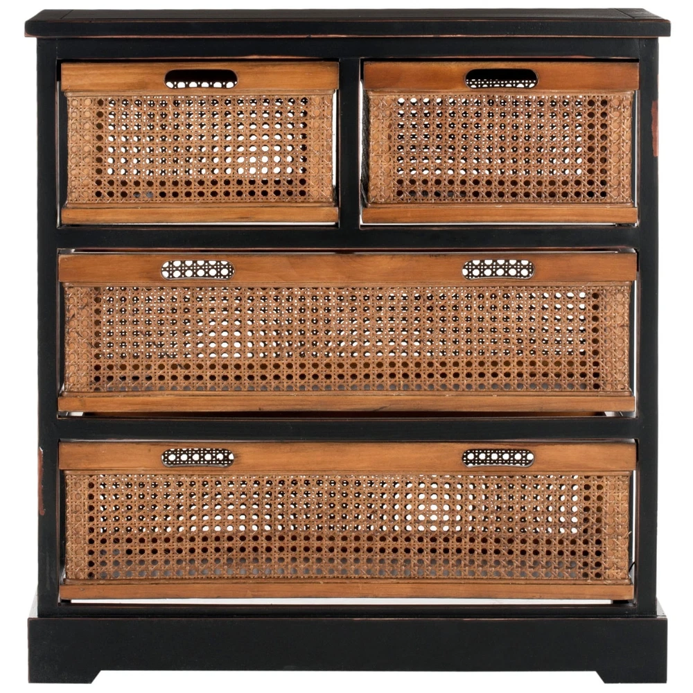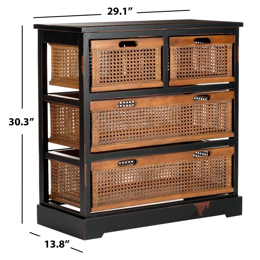 The British Colonial-inspired Jackson four-drawer storage evokes exotic locales abroad, yet features a relaxed vibe and generous storage right at home.Color: BlackMaterials: Pine woodDimensions: 30.3 inches high x 29.1 inches wide x 13.8 inches deepThis product will ship to you in 1 box.Furniture arrives fully assembled Free Shipping Over $49.99* Details SAFAVIEH Jackson Black 4-drawer Wicker Basket Storage Unit Product Description: The British Colonial-inspired Jackson four-drawer storage evokes exotic locales abroad, yet features a relaxed vibe and generous storage right at home. ColorBlack MaterialsPine wood Dimensions30.3 inches high x 29.1 inches wide x 13.8 inches deep This product will ship to you in 1 box. Furniture arrives fully assembled