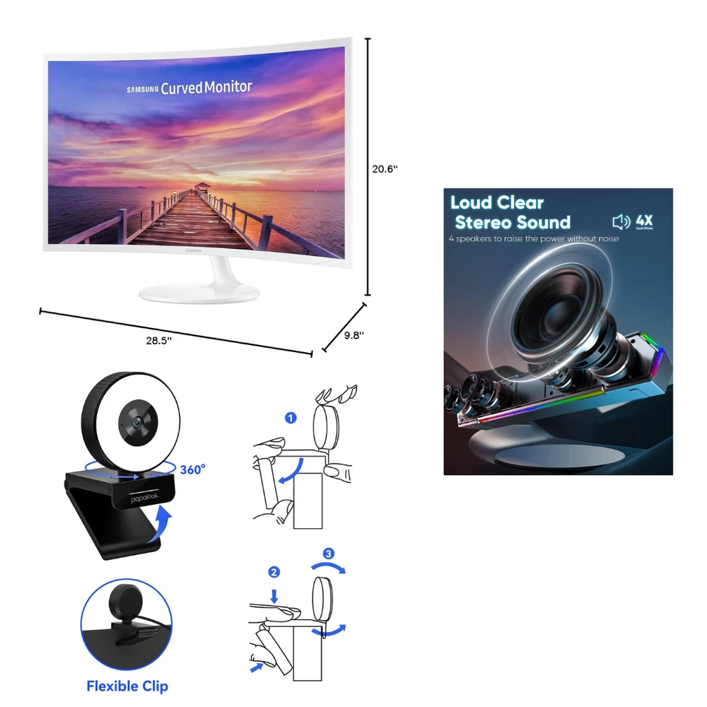 SAMSUNG 32-inch CF391 Curved Monitor Used - It has cracks in the plastic of the frame, but it works perfectly. (See the Photos for more details) Brand: SAMSUNG Screen Size: 32 Inches Resolution: FHD 1080p Aspect Ratio: 16:9 Screen Surface Description: Glossy LENRUE G11 Computer Speakers for Desktop 100% Brand New. (See the Photos for more details) Brand: LENRUE Speaker Maximum Output Power: 5 Watts Connectivity Technology: Auxiliary, USB Audio Output Mode: Stereo Mounting Type: Tabletop Mount Papalook 2K/1080P Webcam with Ring Light 100% Brand New. (See the Photos for more details) Brand: papalook Photo Sensor Technology: CMOS Video Capture Resolution: 1080p Maximum Focal Length: 90 Millimeters Maximum Aperture: 2 f Flash Memory Type: Micro SD Screen Size: 6.5 Connectivity Technology: USB Color: Black Elite Pro Q300 Wireless Controller RM80 100% Brand New. (See the Photos for more details) Compatibility: PS4, PC, Android, OS Description Suitable for PS4/PS4 Pro/Slim/Android/OS/PC. Condition: 10/10 IMPORTANT: NO RETURNS ACCEPTED