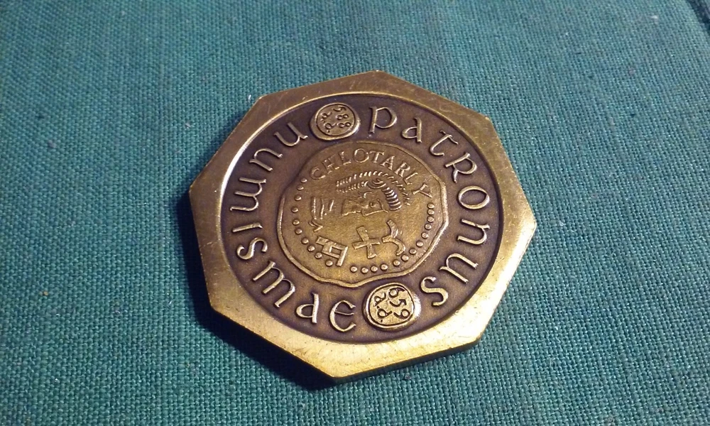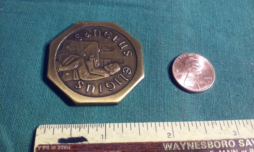 SANCTUS ELIGIUS PATRONUS NUMISMAE Numismatic Tribute Token Coin Medal Brass, Gold-Tone Brass, octagonal shape, 1.5" inches wide.