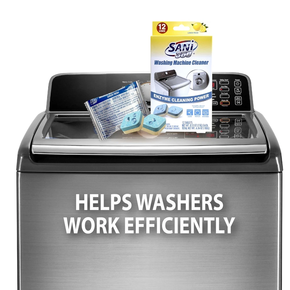 Enzyme Activated Washing Machine Cleaner: Sani 360° Washing Machine Cleaner’s powerful, enzyme-formulation scrubs away dirt, grime and odor-causing residue buildup inside the drum, rim, pump, valve, agitator, filter, and hose. Each tablet is designed to deep clean and deodorize your washing machine. Eliminates Odor: This cleaner works to eliminate unpleasant odors caused by buildup inside your washing machine drum. Machine Runs Efficiently: The ingredients are safe for use in all types of washers including HE (high efficiency) machines without damaging the interior or harming delicate fabrics. Sani 360° Washing Machine Cleaner helps breakdown and remove lime scale and soap scum. It is safe to use on Septic Tank Systems. Easy to Use: Drop a tablet directly into the drum. Run a normal cycle in HOT water setting to effectively dissolve the tablet. Works great on excessive buildup caused by detergent or hard water. Perfect to use in the washer basin after running soiled dishcloths, bathroom rugs, kitchen rags, or exercise clothing. Regular Maintenance: Use once a month treatment for maintenance to keep your washer smelling fresh and functioning at its best. This pack includes 12 tablets of Sani 360° Washing Machine Cleaner to ensure that you have enough supply until your next purchase. Fresh Formula: Super boost your wash. A clean machine translates to laundry that smells fresh!