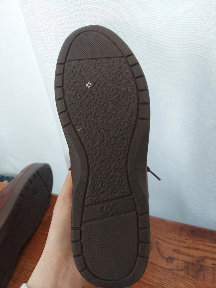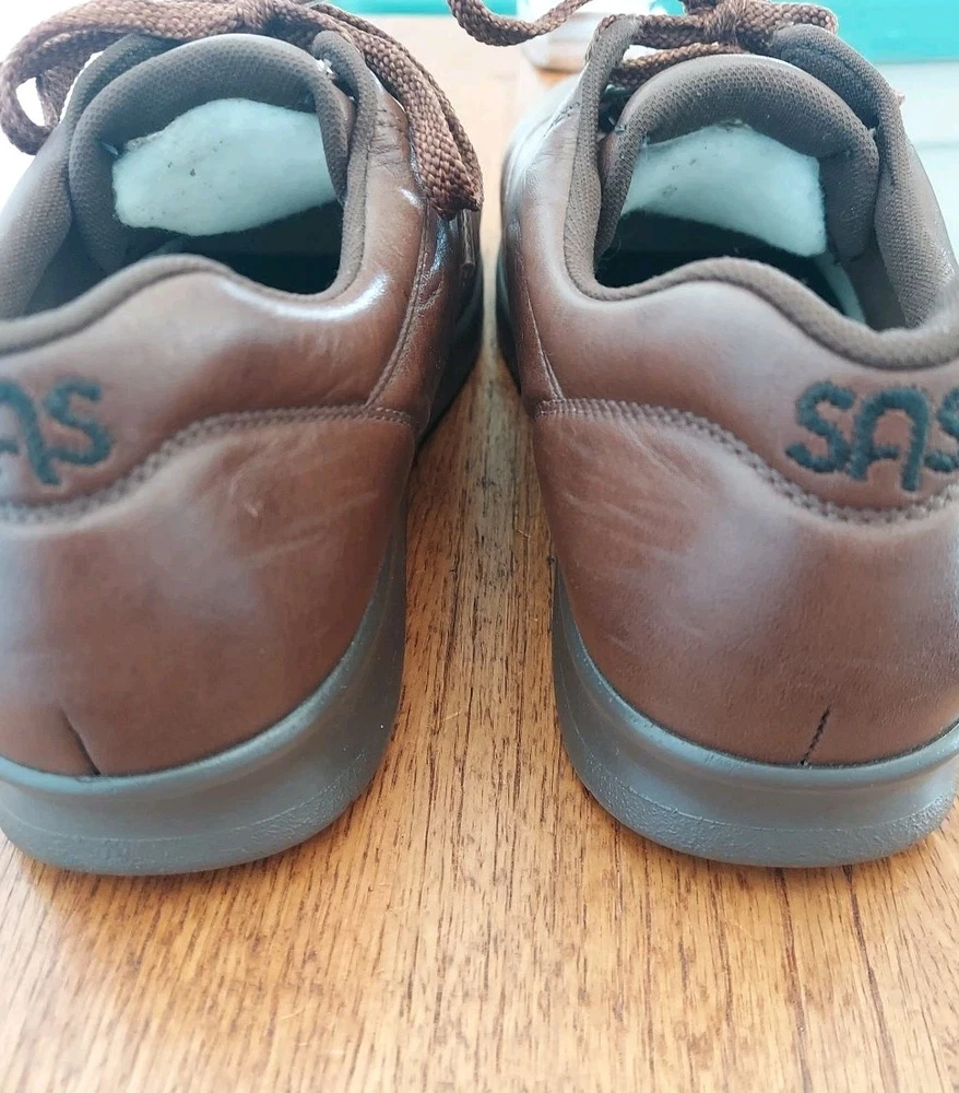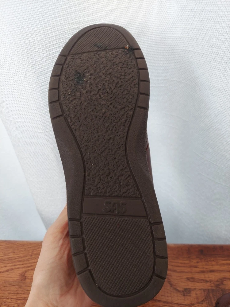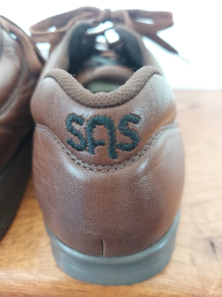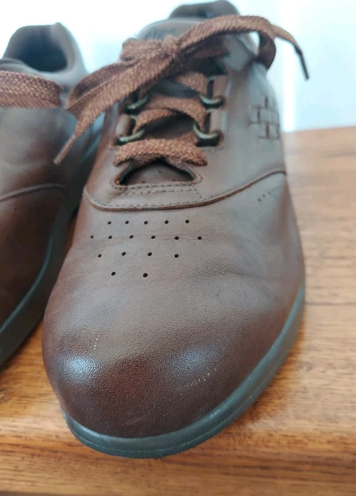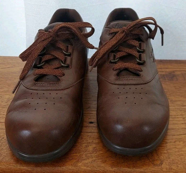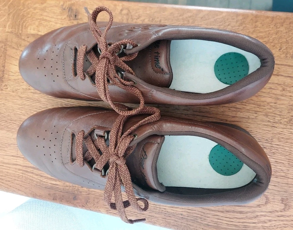 These are SAS Free Time Women's walking shoes in a teak brown color. They feature a solid pattern, round toe shape, lace-up closure, and low heel height. Made of leather with a polyurethane outsole, they offer maximum cushioning and arch support. These comfortable shoes are suitable for travel, activewear, casual, and workwear occasions. The shoes have a removable insole, which have been removed. Buyer can use their own insoles or purchase insoles from SAS website. Handmade in the United States, they are designed for walking activities. *Slight/minimal scratching in leather as shown in photos, extra padding added by previous owner-price reflects this*