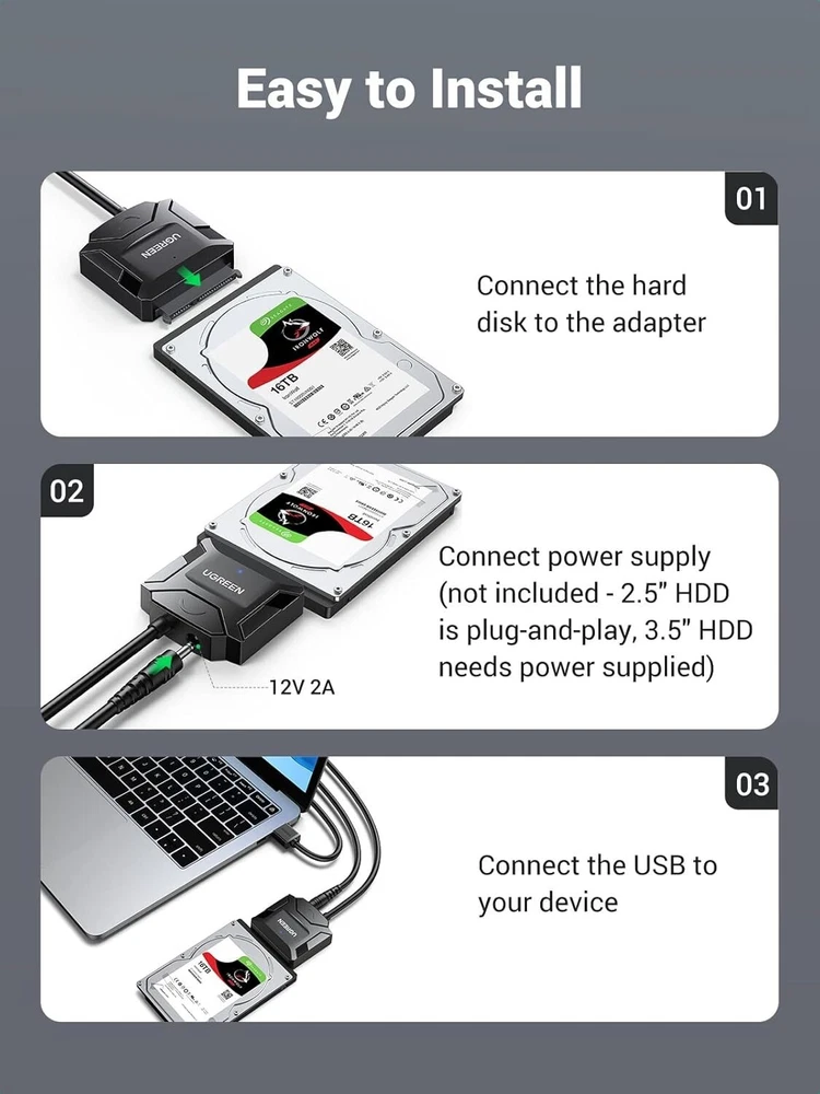 SATA to USB 3.0 12V Adapter Cable for 3.5Inch 2.5 Inch SSD/HDD Hard Drive Reader Product Description : Easy Hard Drive Access: The SATA to USB 3.0 adapter allows you to connect a 3.5"/2.5" SSD HDD with your computer to expand storage, upgrade the system, back up files, retrieve and recover data 5Gbps with UASP Accelerated: This external SATA hard drive reader supports data transfer speed up to 5 Gbps. Equipped with UASP technology, which is 70% faster than traditional USB 3.0 and reduces 80% required processor resources Plug & Play Simple Operation: No need to install a driver , just plug and play. Hot-swap supported. Always eject the hard drive safely before unplugging the IDE to USB adapter from your computer in case of data loss 12V 2A Power Adapter Included: This SATA to USB cable is equipped with a DC-Jack port and comes with a 12V/2A Power Adapter, which ensures enough power supply for a 3.5" hard dr Wide Compatibility: This SATA III to USB 3.0 adapter is compatible with PS4, Xbox, Windows 10/8.1/8/7/Vista/XP, Mac OS. Supports 2.5"/3.5 '' SATA HDD SSD up to 20TB max. Compatible with WD Blue 3.5 HDD, Crucial MX500 SSD, Samsung 860 EVO SSD 2.5 etc We are committed to your satisfaction. If you are not completely satisfied with our product, we offer a 100% money-back guarantee. Top-Notch USA Seller | S wift USPS/UPS delivery | Shipped within 1 Business Day | Quick Replies | Free Shipping | Prompt Communication Contact us We value open communication with our customers. Our team is committed to providing quick responses to any queries or concerns you may have regarding our products or your order. Please feel free to contact us on eBay's Internal Message System for any questions or concerns you may have. Our dedicated customer service team is committed to providing exceptional support and ensuring your shopping experience with us is nothing short of excellent. Customer Service We strive to offer the best quality products to our customers. Each item listed in our store undergoes rigorous quality checks to ensure customer satisfaction. If you have any problems, we are very glad to help you. Please message us directly through eBay for faster response. Your inquiry is important to us and we'll respond within 24 Hr.