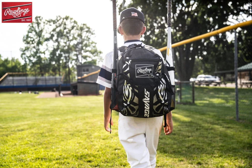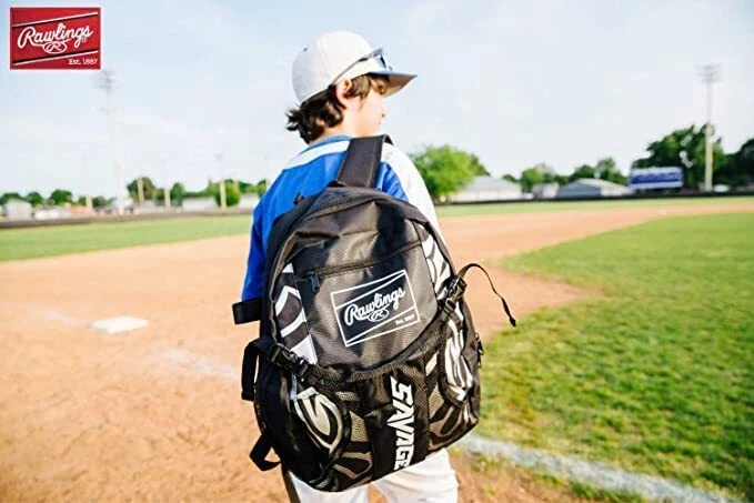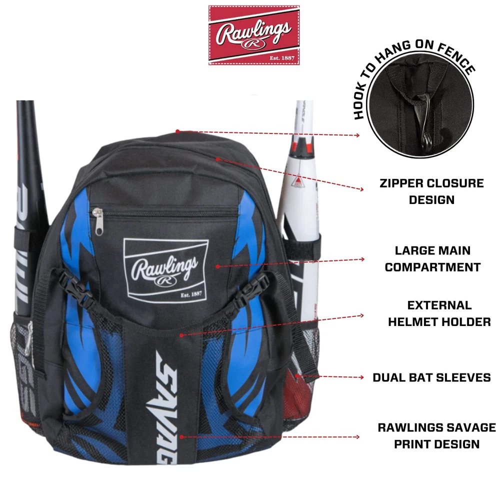 Description Ready to add a bit of Savage to your game day? This bag from Rawlings is the perfect medium sized bag for baseball players who are serious about keeping all their gear organized on game day. With features that include external bat sleeves, a mesh pocket for helmets and a large main compartment, this bag helps softball athletes in practice, training, and during competition. STAY GAME DAY ORGANIZED: The Savage baseball bat bag is perfectly sized for the young player. Our kids baseball backpack includes strategic storage compartments to help stay organized on game day, including plenty of room to store equipment and a large main compartment with dual zippers. CARRY YOUR BATS: Our baseball backpack for boys or tball bag, features neoprene bat sleeves that hold your bats so you’re always ready for trips to the plate. Our youth sports bag is also a popular girls softball bag. DURABLE DESIGN: Our premium baseball gear bag includes padded shoulder straps and back paneling to ensure you carry your gear in comfort. Our kids baseball bag also features an external front pocket for your helmet or other gear to save room inside your bag. THE RIGHT SIZE BASEBALL BACKPACKS FOR YOUTH: Rawlings Savage baseball equipment bag is a great T Ball bag, but is also big enough for older players in travel ball or fastpitch league play, measuring 16" x 12" x 6". Featuring two side bat sleeves, could be used for a water bottle. HIGH AND DRY FENCE HOOK: With an integrated fence hook, keep your softball backpack out of the dirt, mud and grime so your gear stays ready for action.