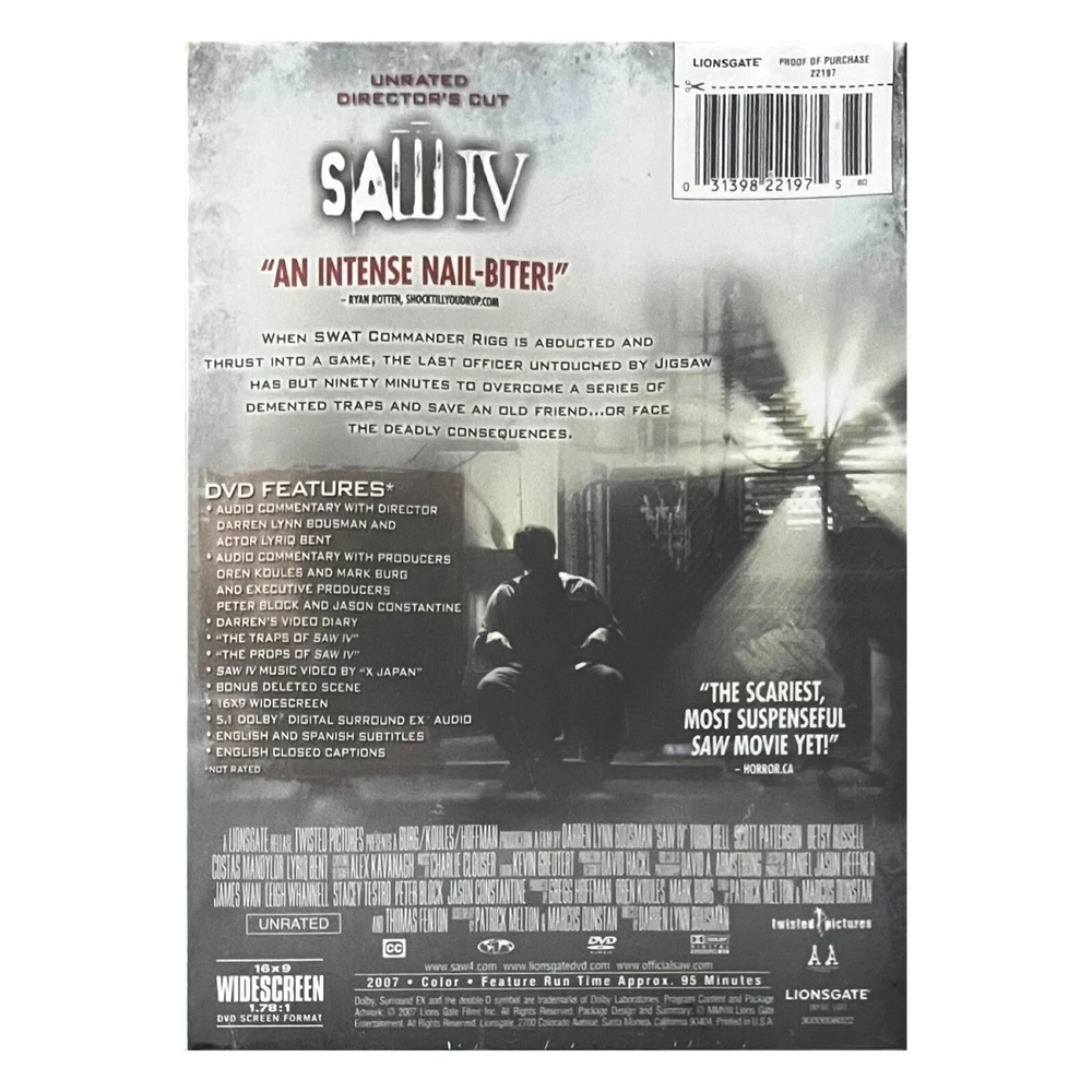 SAW IV DVD - SAW IV Widescreen Unrated Director's Cut Edition - NEW SEALED Format: DVD: Digital Video Disc Title: SAW IV Special Features: Widescreen Unrated Edition Director's Cut Director Commentary Additional Scenes Dolby Digital Condition: Item is NEW & in original sealed packaging (see photos). Stored in sealed packaging in a 100% smoke free home. Photos accurately represent the condition of the item. Please review all photos thoroughly. Many thanks! Questions: Feel free to contact us through eBay if you have any questions concerning the item(s) listed. We are very easy to work with and pride ourselves on providing excellent customer service.