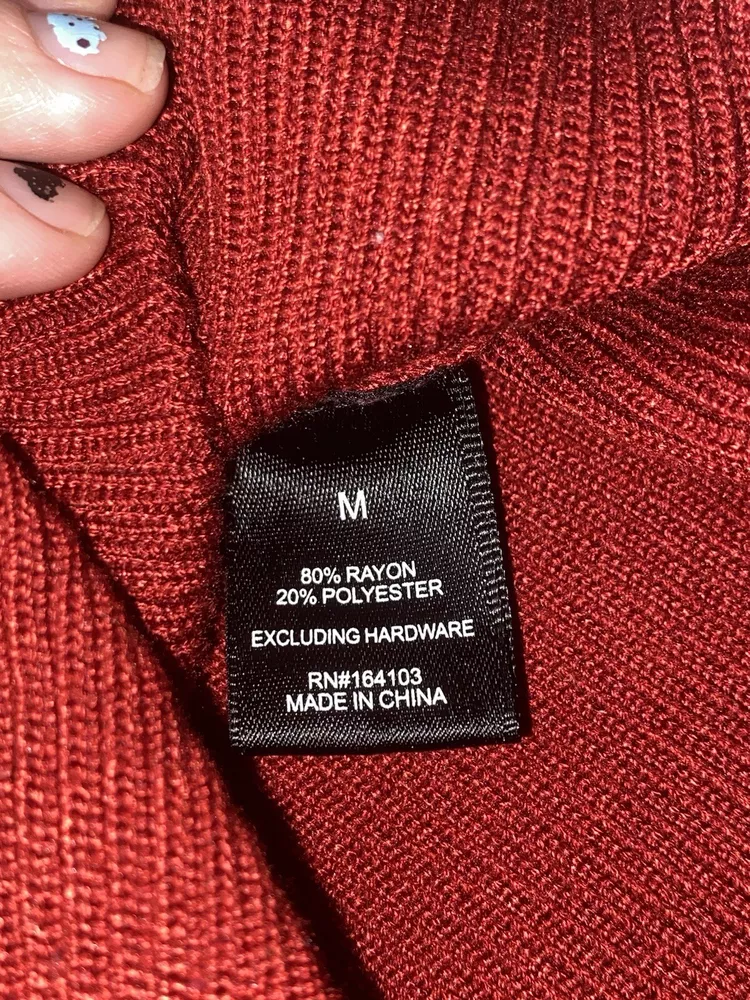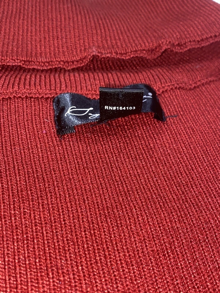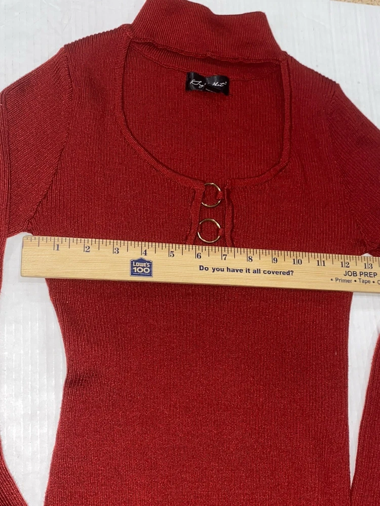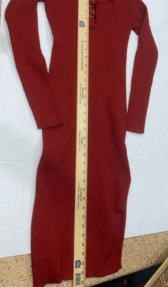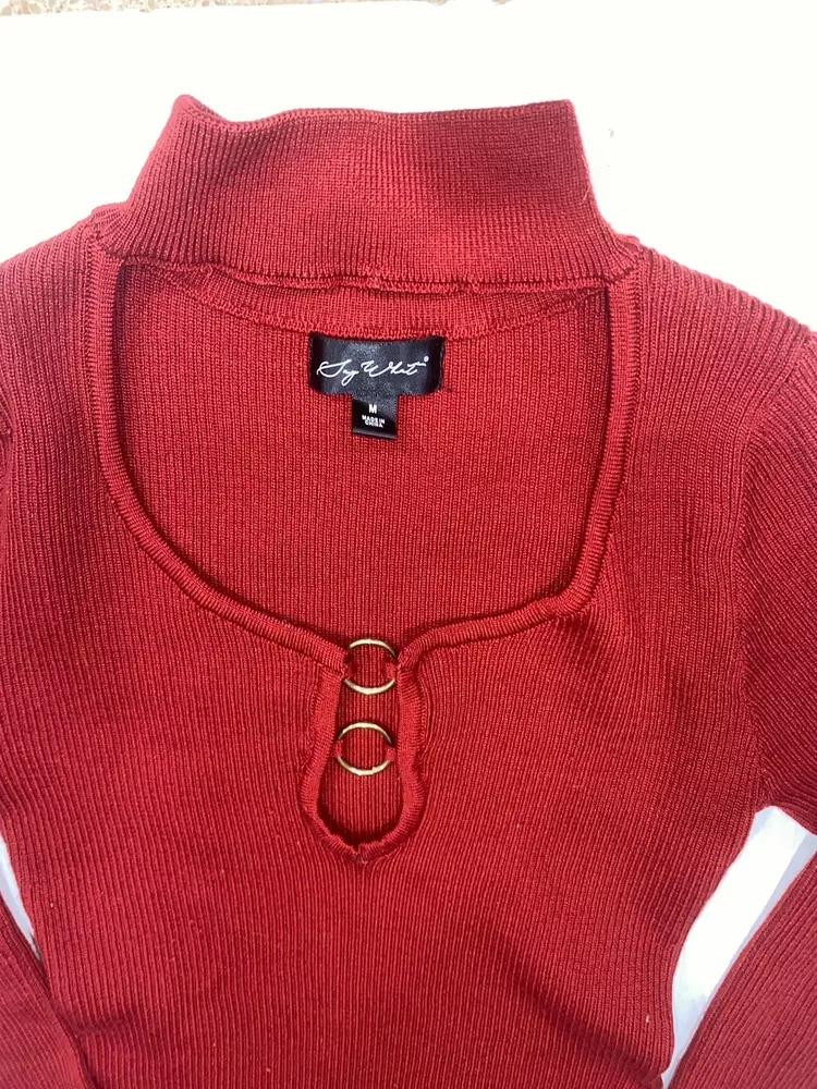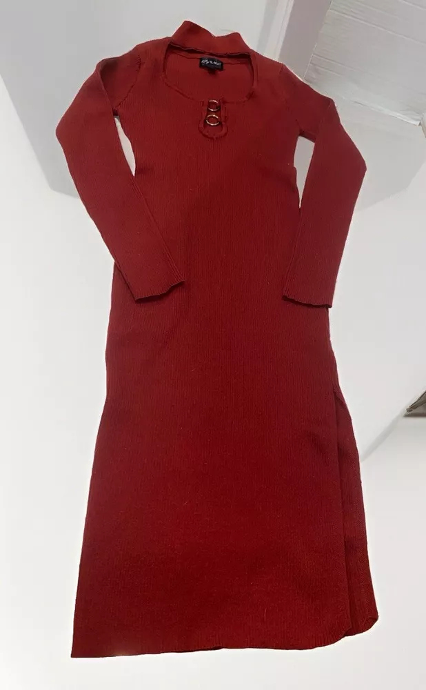Pre owned body con deep red sweater dress. Brand is Say What? Turtleneck with open chest and 2 rings. Please review all pictures and ask any questions prior to purchase.
