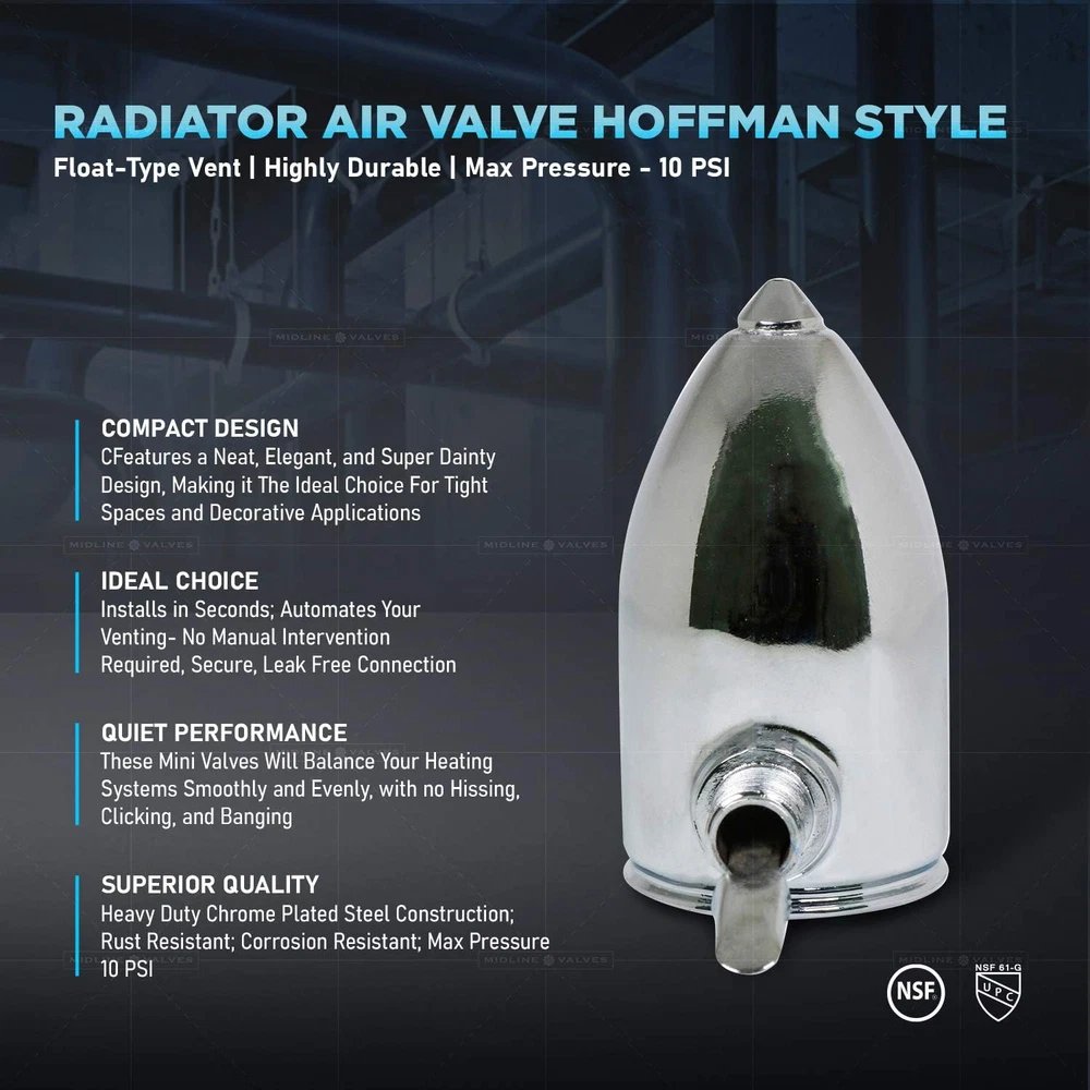 Quiet PerFormance: these Mini valves will balance the Air accumulation in your Heating Systems Smoothly and evenly, with No hissing, clicking, and banging Superior Quality: Heavy Duty chrome plated steel Construction; Rust Resistant; Corrosion Resistant Compact design: features a neat, Elegant, and super dainty design, making it the Ideal choice for tight spaces and DecorativeApplications float type vent; Installs in seconds; automates your venting- No manual intervention Required Secure, Leak Free connection This Midline Valve Steam Valve is The Ideal Choice for Air Removal in Your Heating Systems around Your Home. It Features a Solid Steel Body, Secure Connection, Dainty Design, Easy Installation, and Quiet Operation. Manufactured With The Highest Quality Materials and Workmanship, It Will Serve Your Plumbing Needs Faithfully.