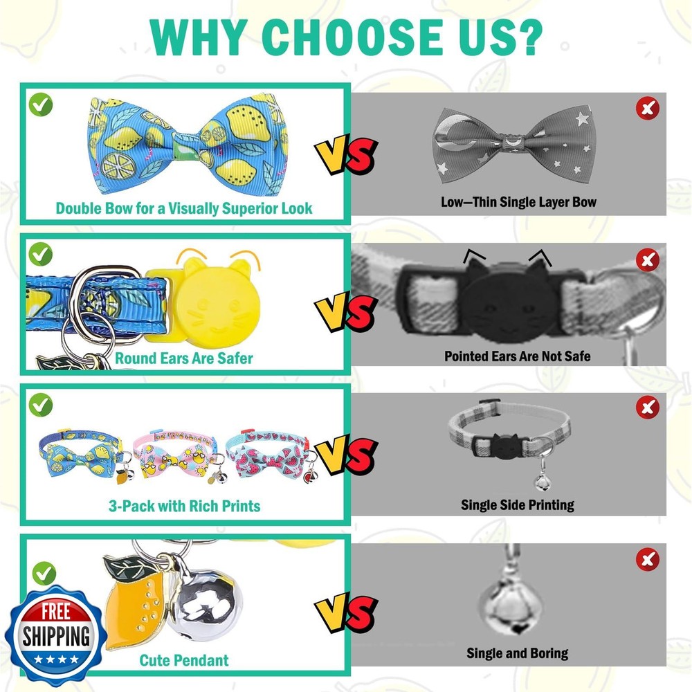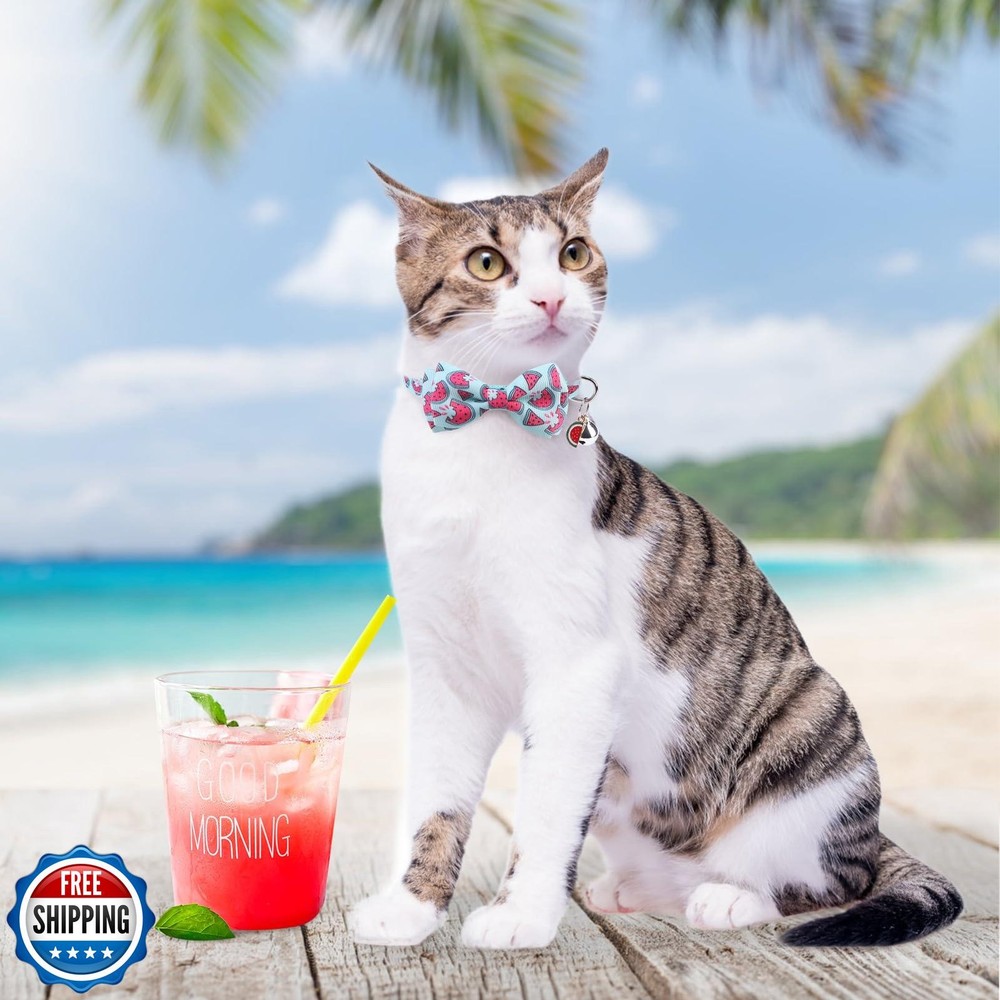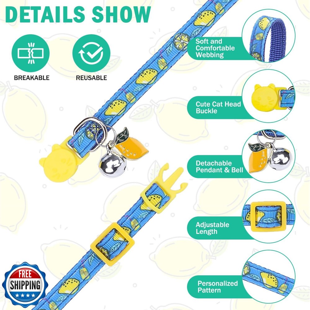 SCENEREAL Breakaway Cat Collar with Bell, 3 Pack Safety Adjustable Cat Collars with Pendant, Personalised Puppy Kitten Collar with Bow for Spring Summer Boys Girls, Pineapple and Lemon and Watermelon Features FASHIONABLE PERSONALIZED CAT COLLAR: Pink, blue, navy blue webbing with lemon watermelon pineapple printed on it, perfect for spring and summer. Make your fur baby more cute and lively. The bow, bell and pendant are removable, so you can dress up your cat as you like. BREAKAWAY SAFETY CAT COLLAR: The breakaway buckle is easy to put on and take off. If your cat gets stuck on something, the secure breakaway buckle will quickly release under pressure. ADJUSTABLE LENGTH 3 PIECE CAT COLLARS: The 3-piece set of cute cat collars come in different designs to meet your wearing needs. Webbing band is 0.4 inches/1 cm wide, 7.8-11.8 inches/20-30 cm long, bow 1.57 x 3.15 inches/4 x 8 cm. BELL FOR QUICKLY LOCATING YOUR CAT'S TRAIL: The bell will let you know where your boy/girl is so your fur baby won't hide anymore. It is also a great finding tool in case your cat gets lost. CUTE CAT COLLARS FOR HOLIDAYS AND DAILY WEAR: The blue and yellow cat collars can not only be worn everyday, but also add fun to Valentine's Day parties, weddings, pet birthdays, anniversaries, proposals, celebrations and other important days! Shipping Free & Fast Shipping: We offer free shipping to most of the USA with a normal delivery time of 3-7 days. However, due to the current situation, additional delivery time (up to 3 weeks) may be required for some items. Alternative Carriers: We may use alternative carriers (e.g., USPS, FedEx, UPS) to ensure your package arrives safely and on time. Due to the use of multiple carriers, we are unable to provide a tracking number automatically. Handling Time: Orders are processed and shipped within 1-2 business days of receiving cleared payment. Shipping Restrictions: Shipping to Alaska, Hawaii, Puerto Rico, Guam, and other US territories may incur shipping charges or delivery restrictions. Please contact us before ordering, or your order can be refunded/cancelled. State Restrictions: Certain items may not be shipped to California due to state regulations. Contact for Tracking Updates: If you require tracking updates or have any concerns about the delivery of your order, please feel free to contact us, and we will be happy to assist you. Return Policy 30-Day Hassle-Free Returns: If you are not completely satisfied with your purchase, you can return the item for free within 30 days of receiving it for a full refund or exchange. Easy Return Process: Contact us, and we will provide you with a prepaid return shipping label and detailed instructions. No Restocking Fee: There are no restocking fees for returns. However, the buyer is responsible for return shipping costs if the return is not due to a seller"s error. Refund Processing: Refunds will be processed within 1 business day of receiving the returned item in its original condition. Feedback Your feedback is extremely important to us. We strive to provide the best products and customer service possible. If you are satisfied with your purchase, please take a moment to leave us a positive review. If you have any concerns or issues with your order, please contact us before leaving negative feedback. We are committed to resolving any problems and ensuring your satisfaction. Contact Us If you have any questions or concerns, please feel free to reach out to our customer support team. You can contact us through the eBay messaging system. We are available Monday to Friday, 9:00 am to 5:00 pm EST, and we will do our best to respond to your inquiry within 24 hours. Thank you for supporting our small family business!